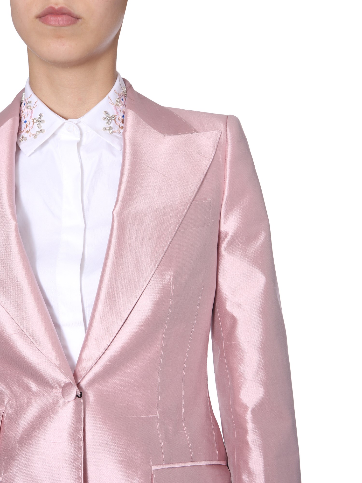 Redefine your formal wardrobe by adding this single-breasted jacket from Dolce & Gabbana. The jacket is tailored from 100% silk that ensures a shiny surface. It features a single-breasted closure with a coated button for a comfortable fit. With padded shoulders and perfect stitching, this jacket is apt for formal settings.