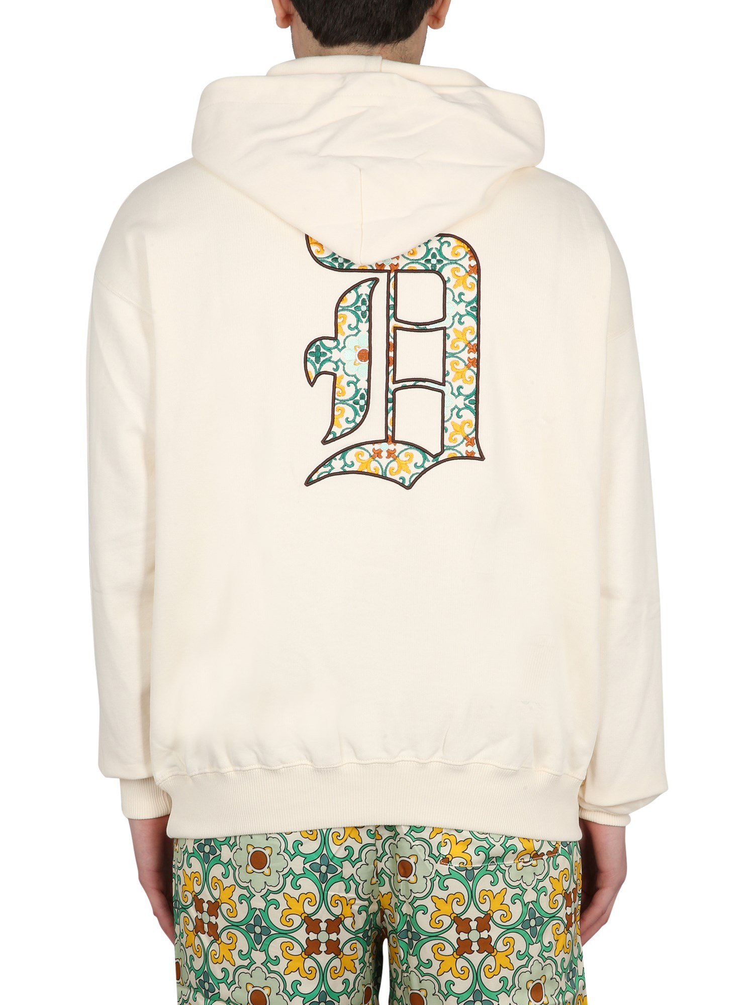 Drôle De Monsieur's cotton sweatshirt is a basic hooded sweatshirt with a pouch pocket that closes with drawstrings. The sweatshirt is a versatile garment that may be dressed up or down depending on the occasion. The drawstring pouch pocket is ideal for storing your valuables such as a cell phone, wallet, and keys. The hood will help you stay toasty on chilly days.