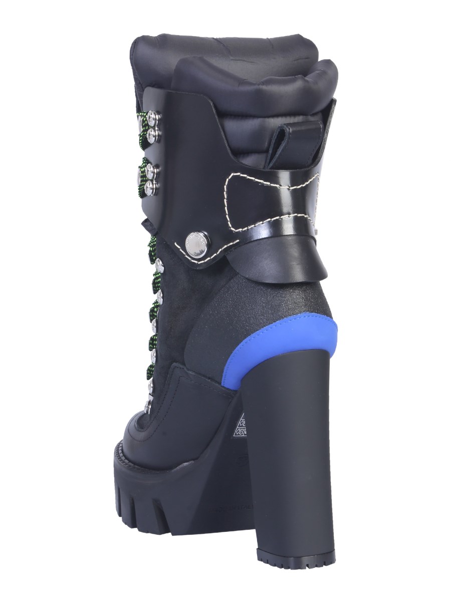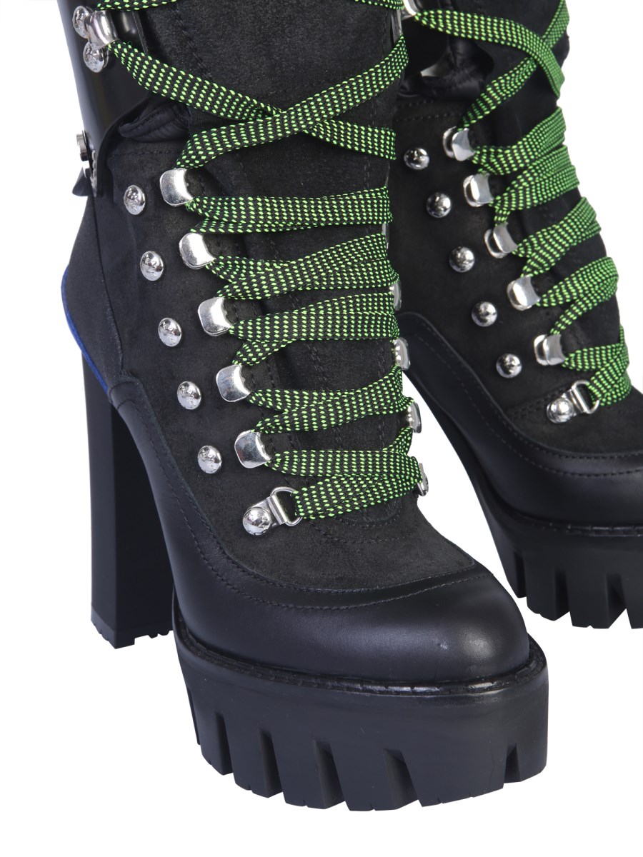 Get these DSquared leather boots with heels for a classy appeal. Not only these shoes tough and durable, but they are also incredibly stylish with a full lace-up closure at the front. The padded neck and tongue together provide cushioning to your feet and make the shoes easy to wear. These shoes also have shiny metal studs as attractive add-ons to their look.