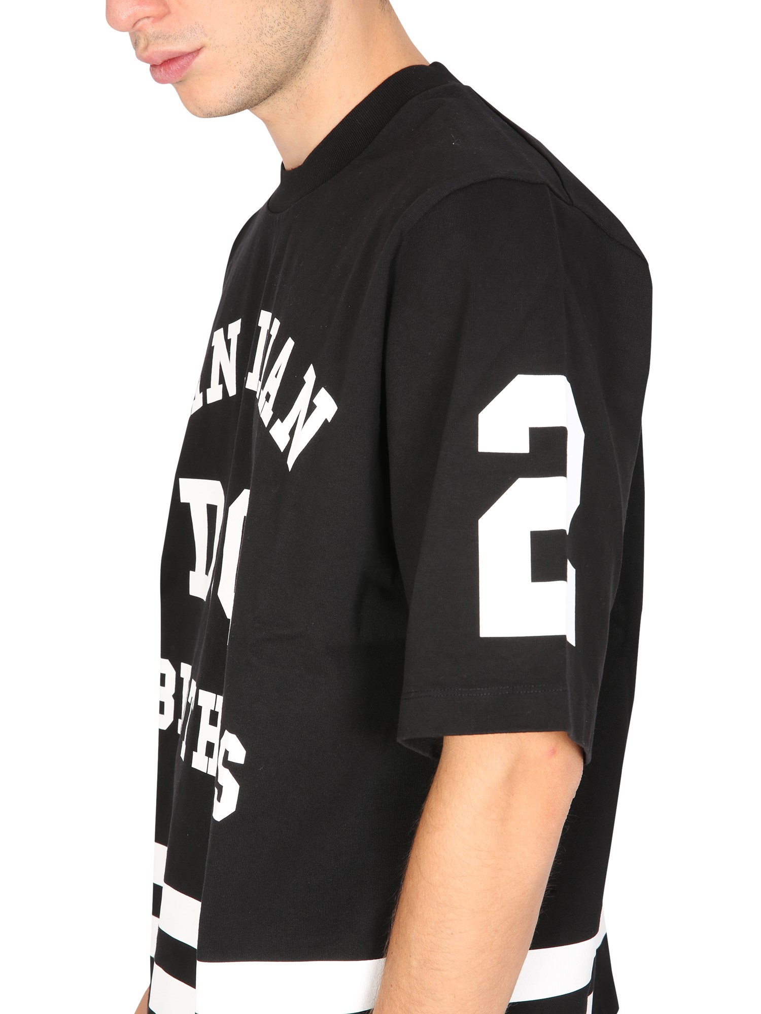 Spend your weekend in fun and style by wearing D2 Bros Football T-shirt from the house of Dsquared. It is an oversize fit, perfect for everyday wear. The tee has a crew neckline, short sleeves, and a straight hem. It is a comfortable, classic piece that can be dressed up or down.