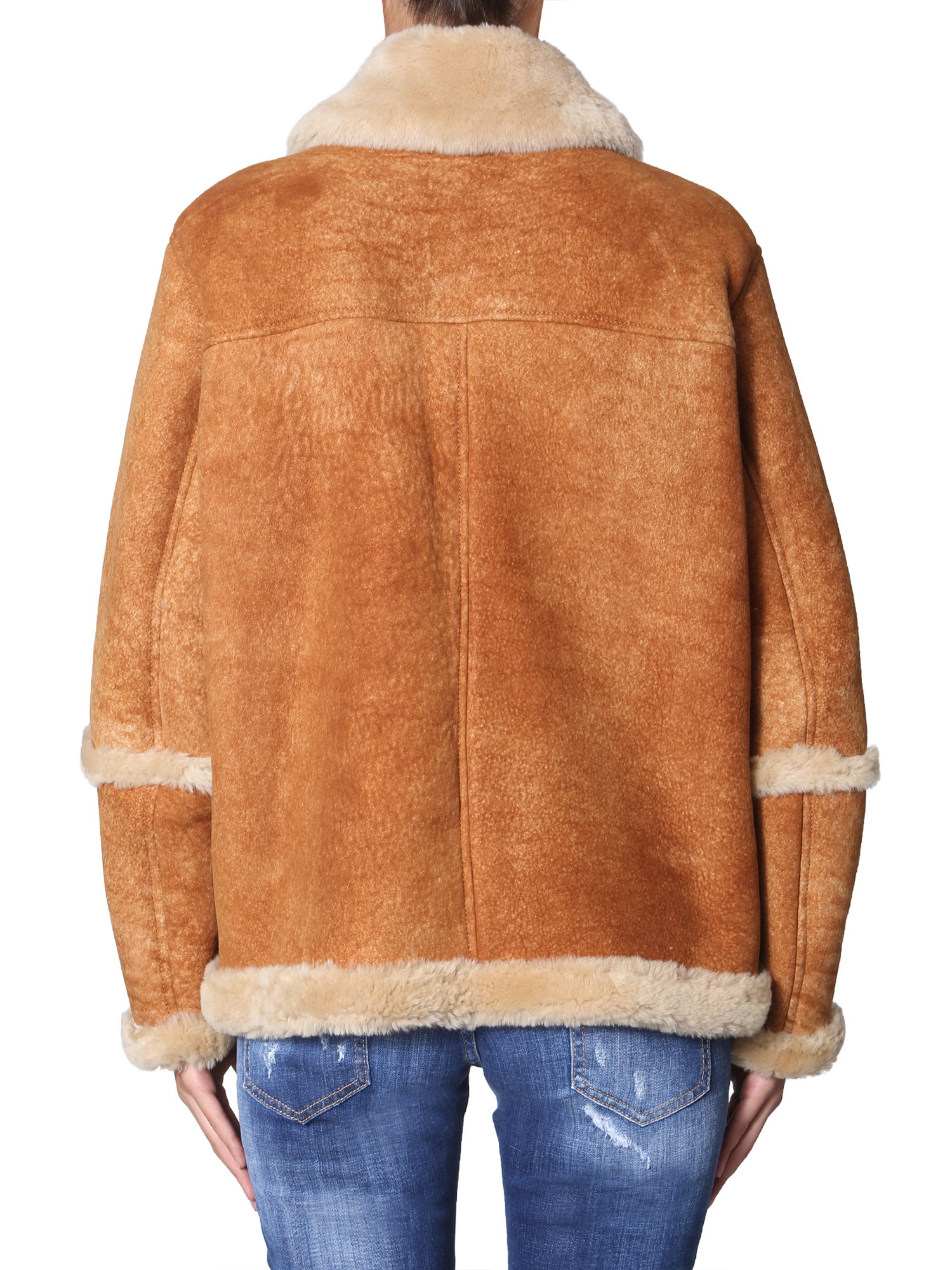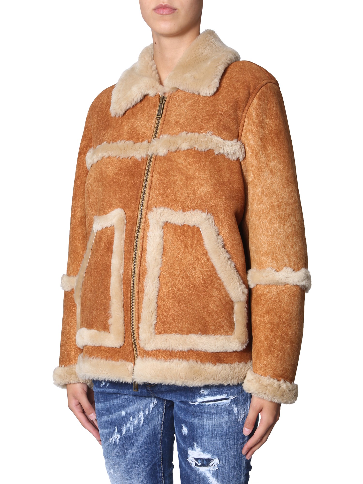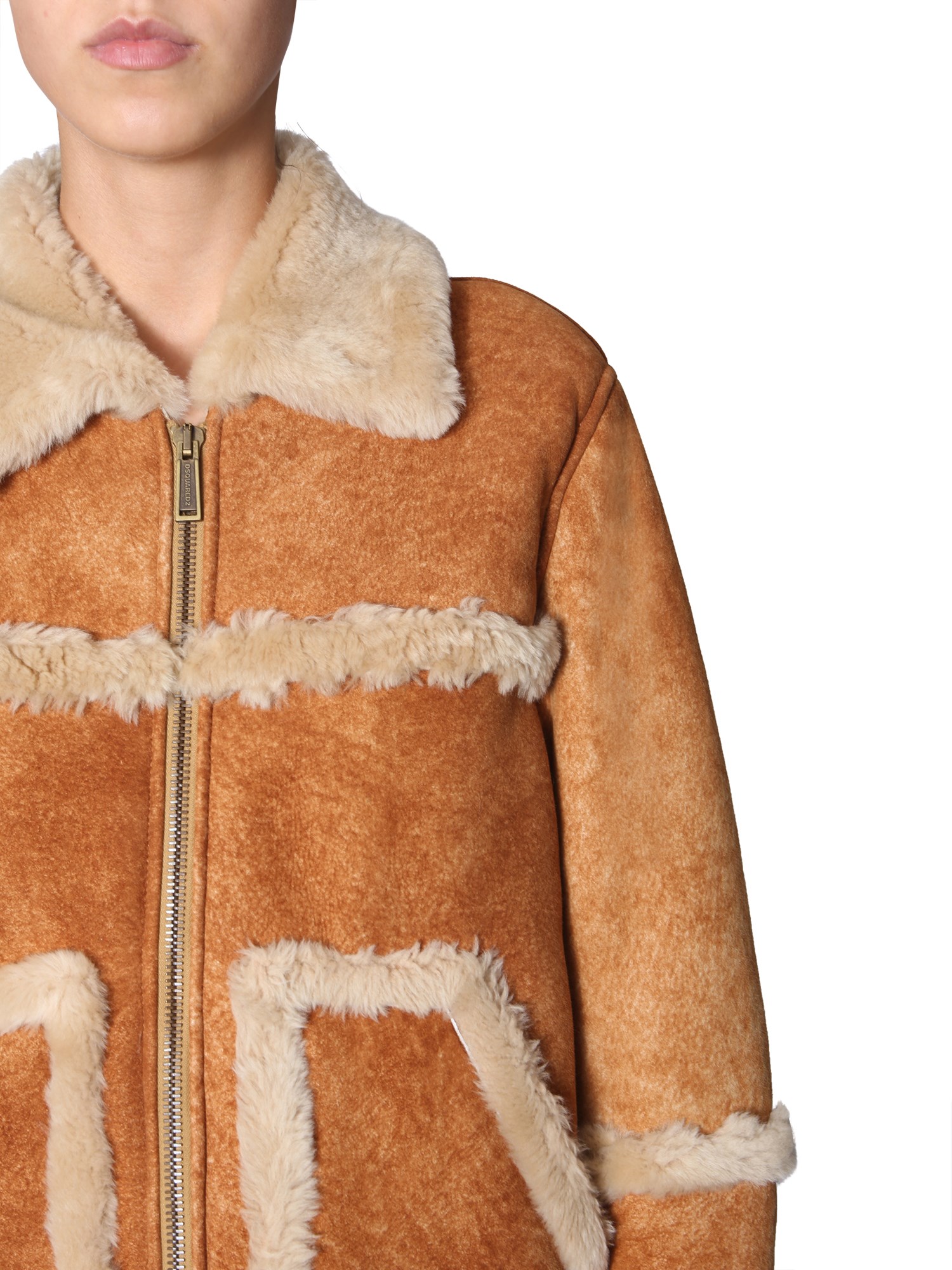 Winter calls for this warm and cosy sheepskin jacket with pockets from DSquared. Its plush surface is made of 100% lamb fur that gives utmost soft and snugly feel. The shearling lining locks the maximum heat to keep you warm all day long. It has a zip closure and two side pockets to keep your essentials close.
