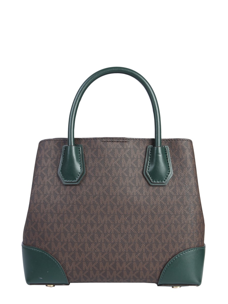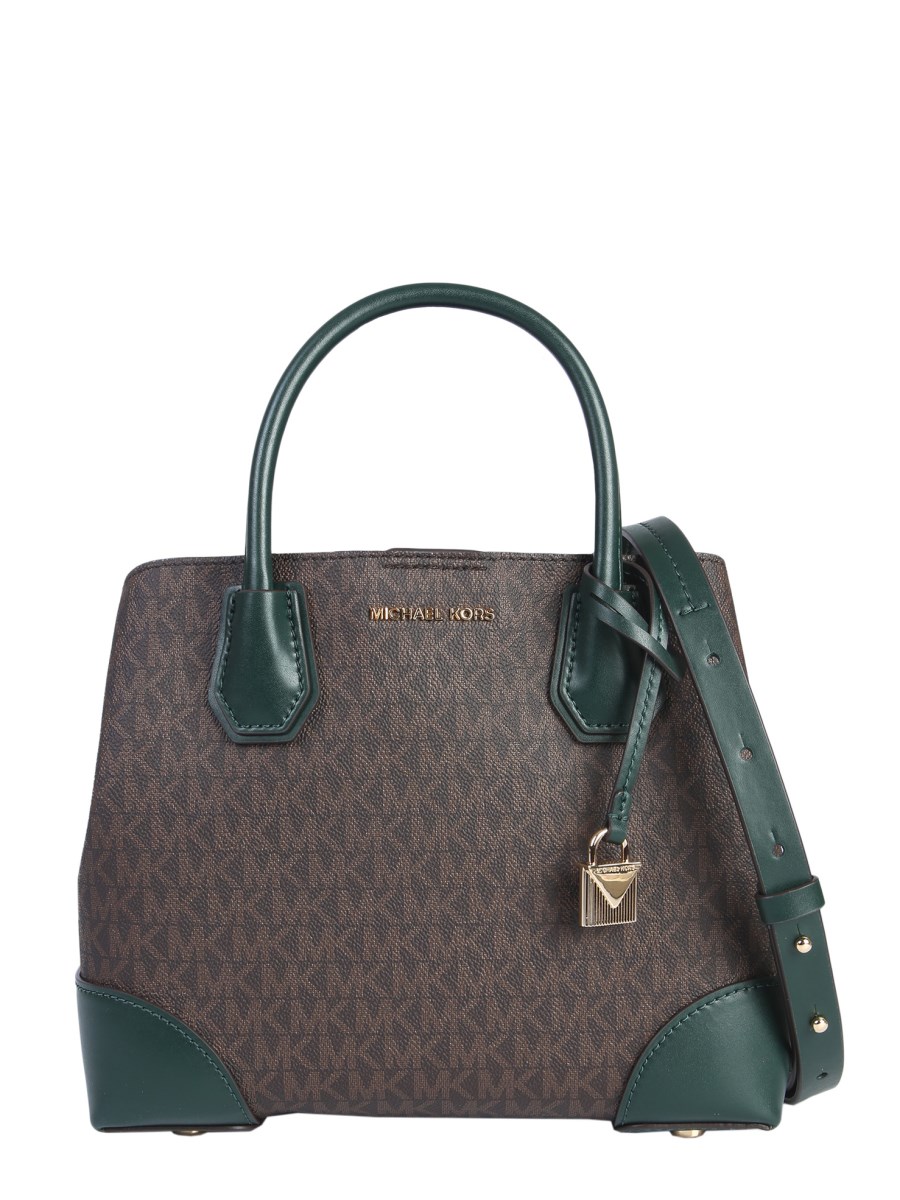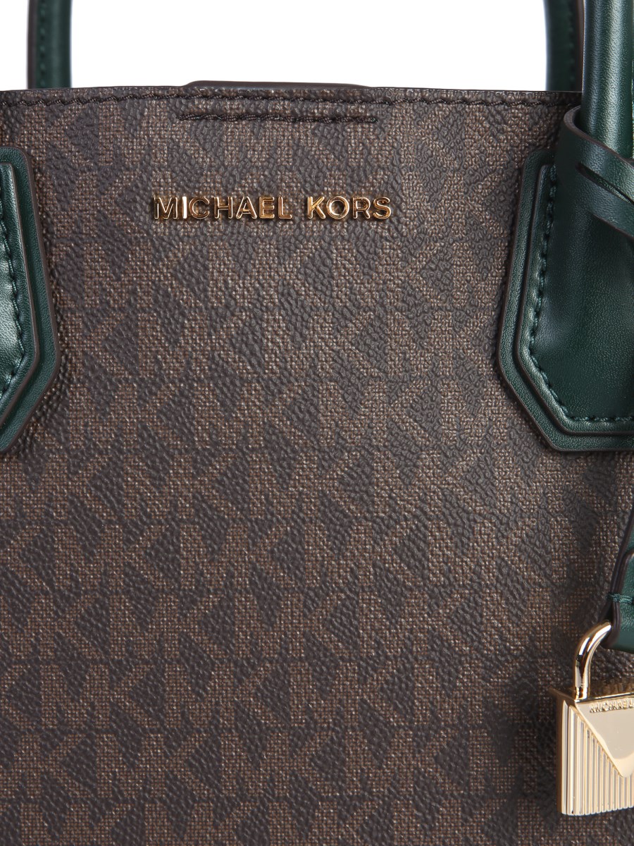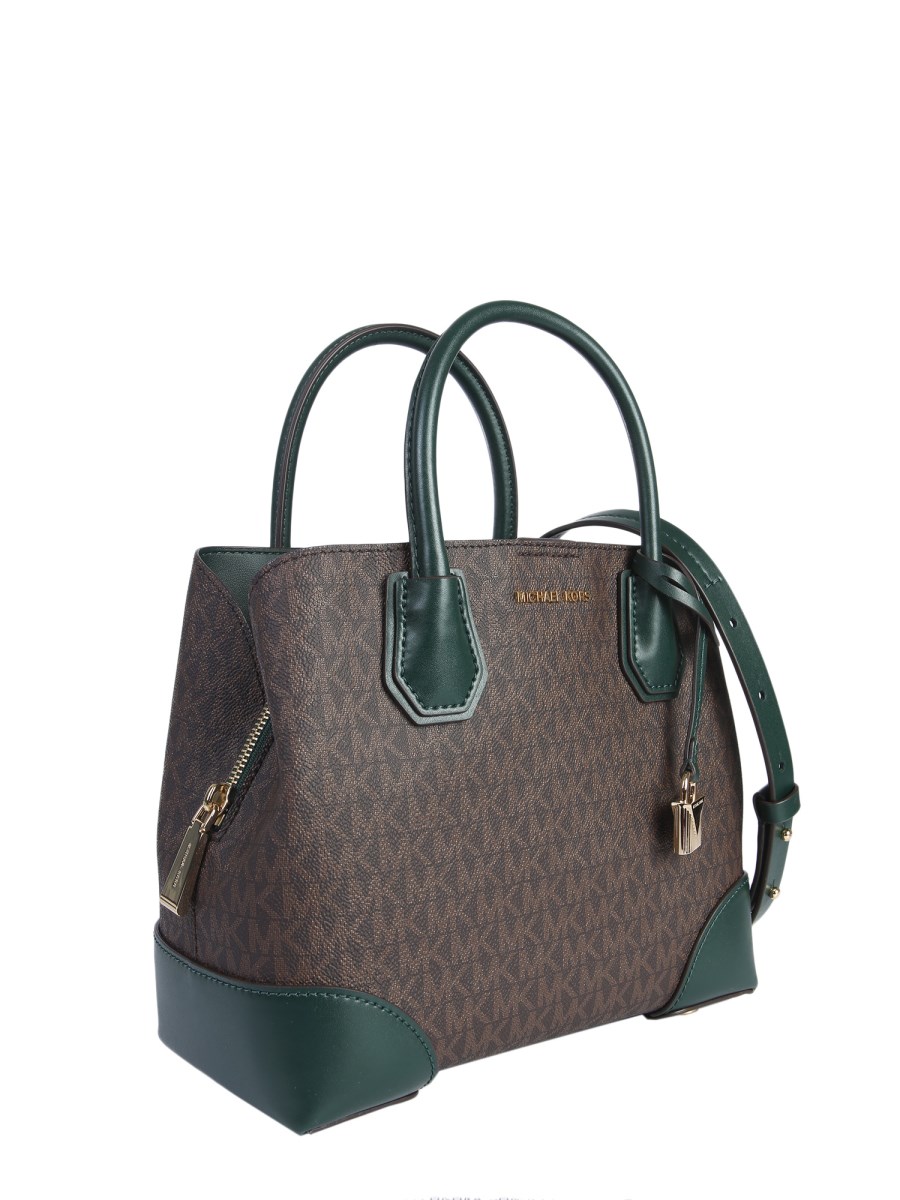 Mercer is a monogram bag featuring MK printed on the entire surface. The classic handbag features contrasting lining, top handles, shoulder straps, and reinforced corners. Made with metal, the purse feet provide protection to the leather-made luxurious accessory. Metal logo plaque and padlock details round off its design.