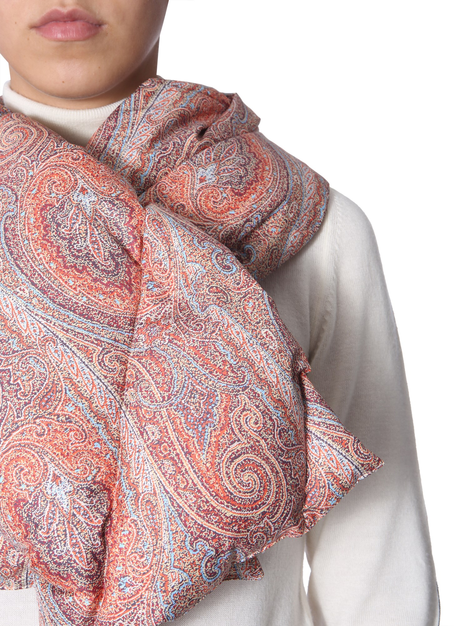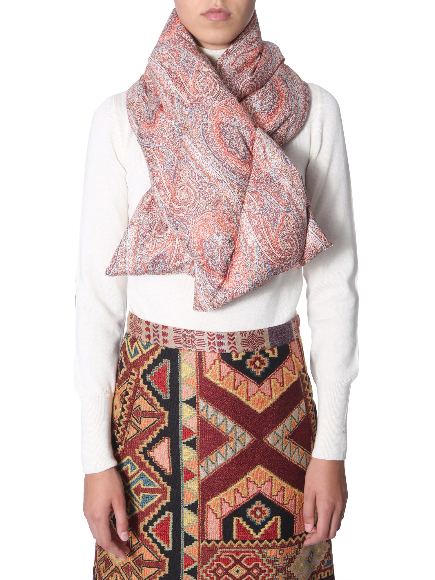Complete your winter ensemble with this padded scarf from Etro. The scarf is made of 100% polyester with down and feather padding that gives a soft and snugly feel around your neck. Its printed surface will match almost any attire you wear. You can team it with a white T-shirt and black denim for an unmatched look.