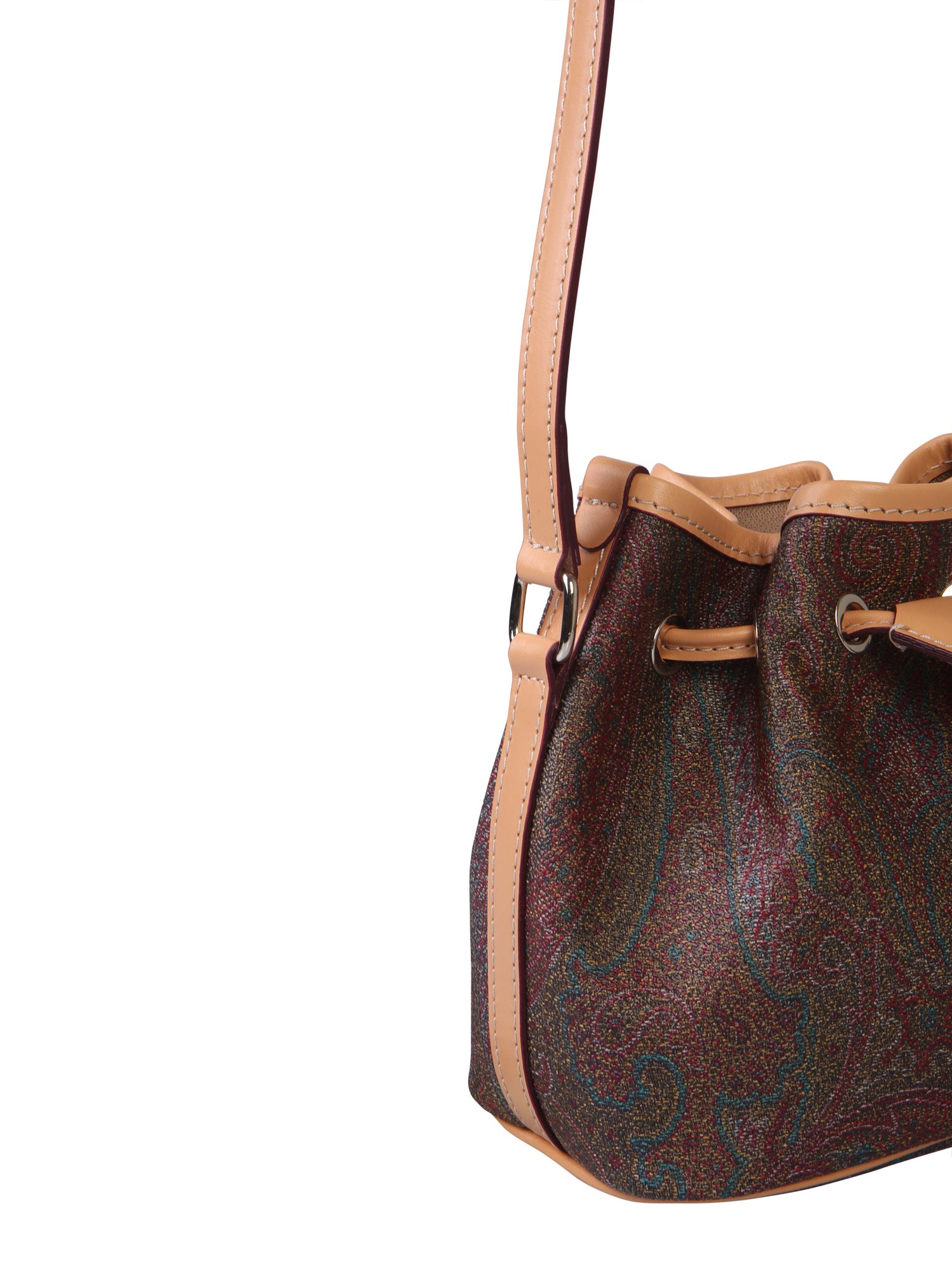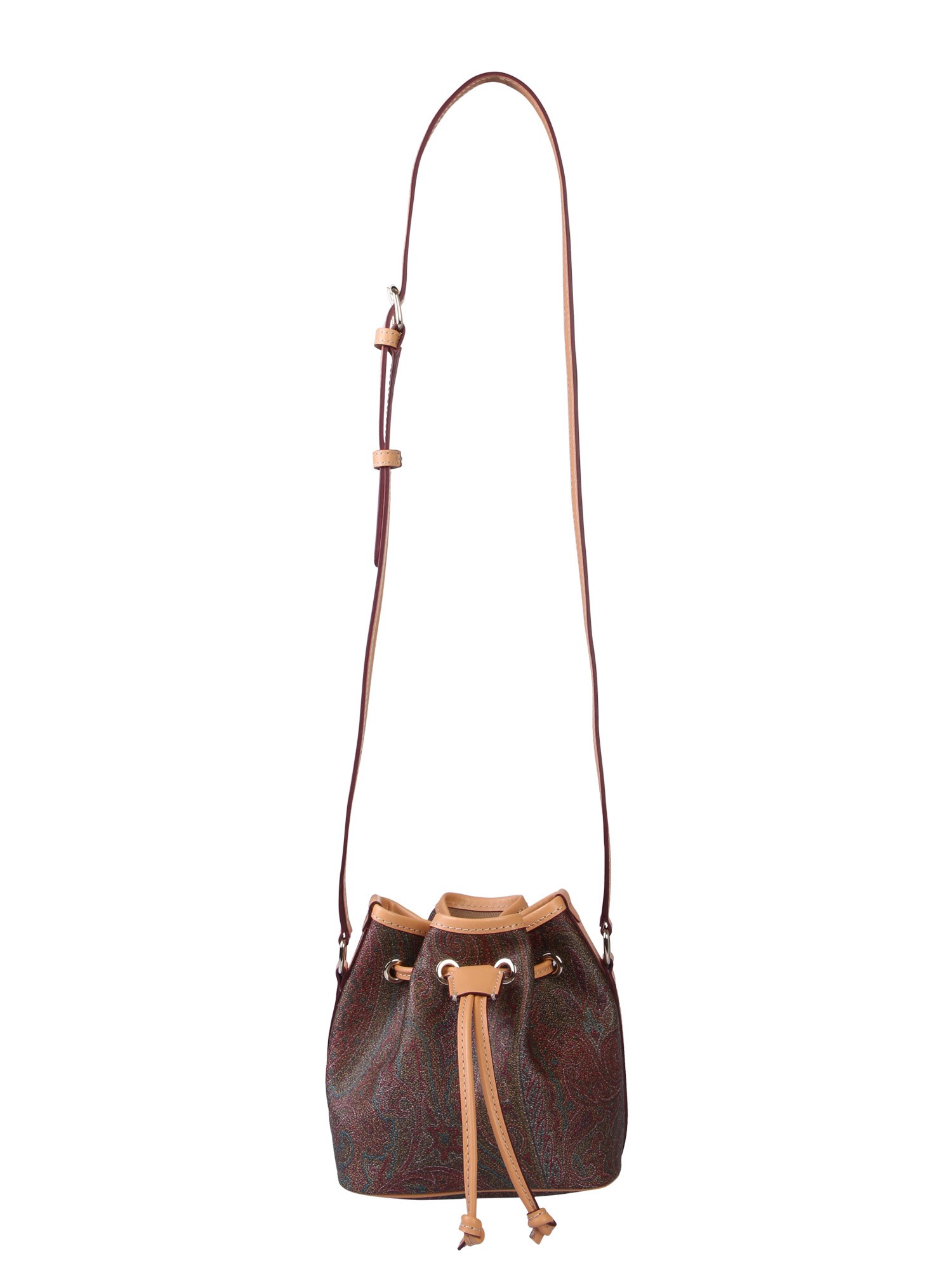 Carry your essentials in style with this mini paisley classic bucket bag from Etro. This cue bag is made of calf leather that will never lose its classy look for a long period. The all over printed surface is adorned with a contrasting coulisse closure. The spacious interior is perfect to keep your smaller essentials like cards, cash and cosmetics.