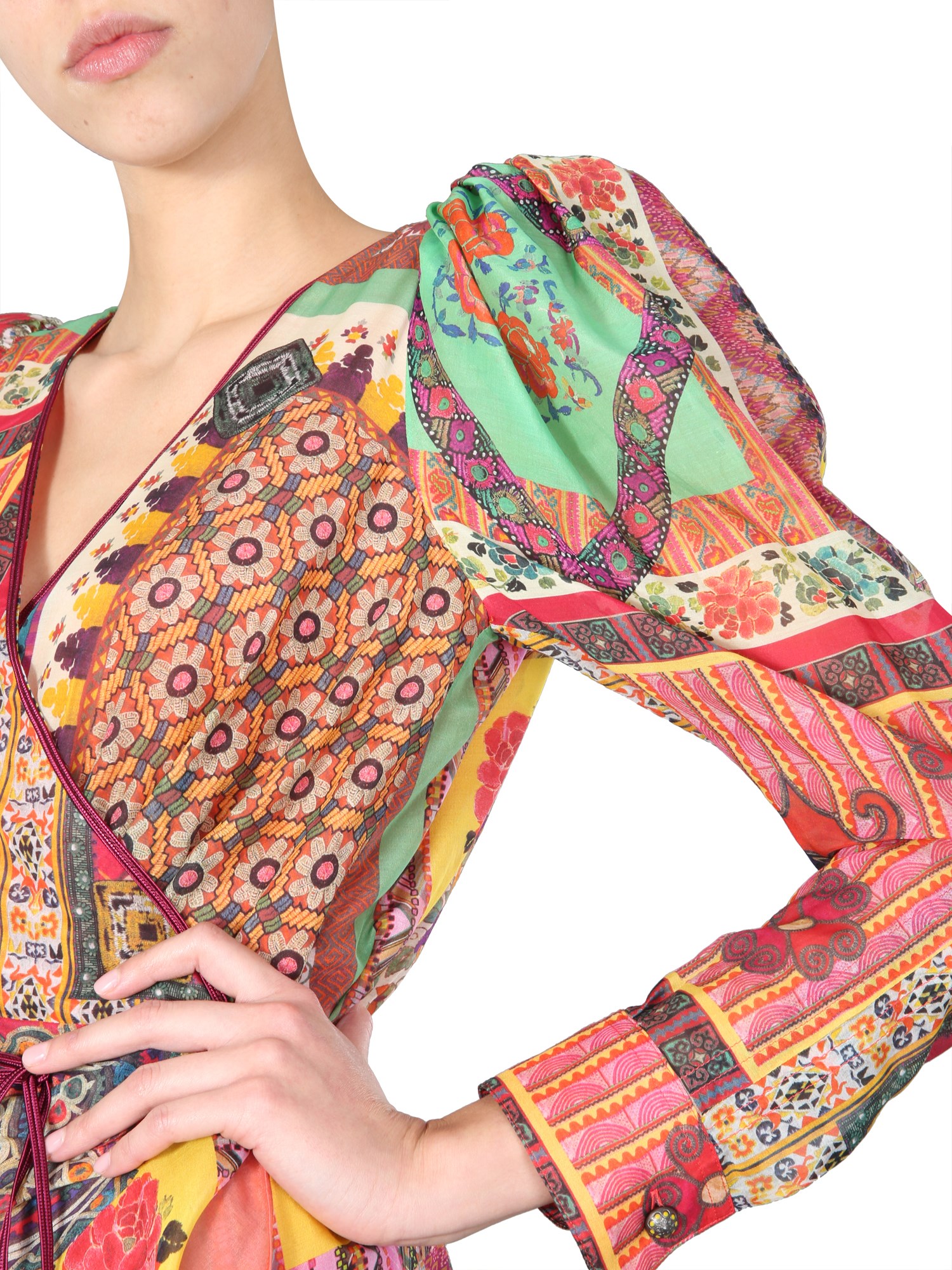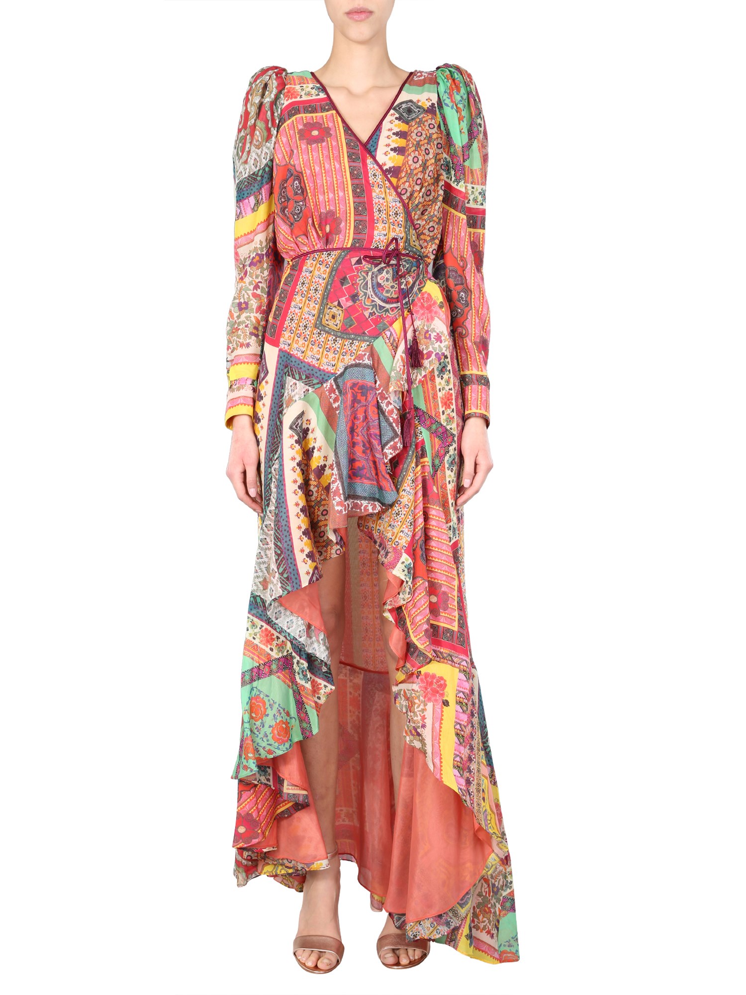 Heading for a dance night? Wear this fabulous long dress from Etro and twirl graciously on the floor. The dress has an asymmetric hem which flows when you walk. The split front design is accented with ruches for feminine apparel. It is made of silk blended fabric which drapes beautifully and gives you a diva-like appeal.