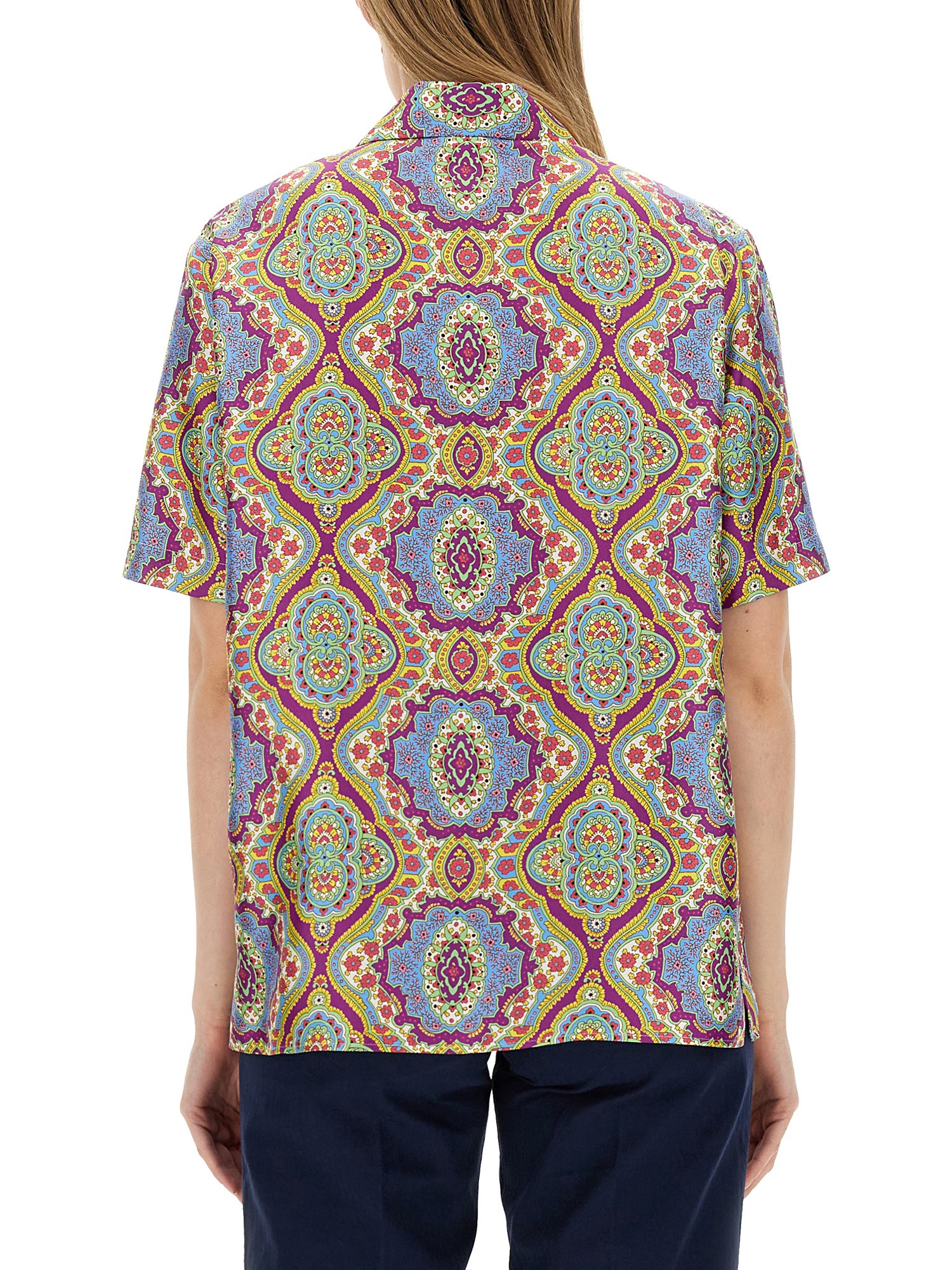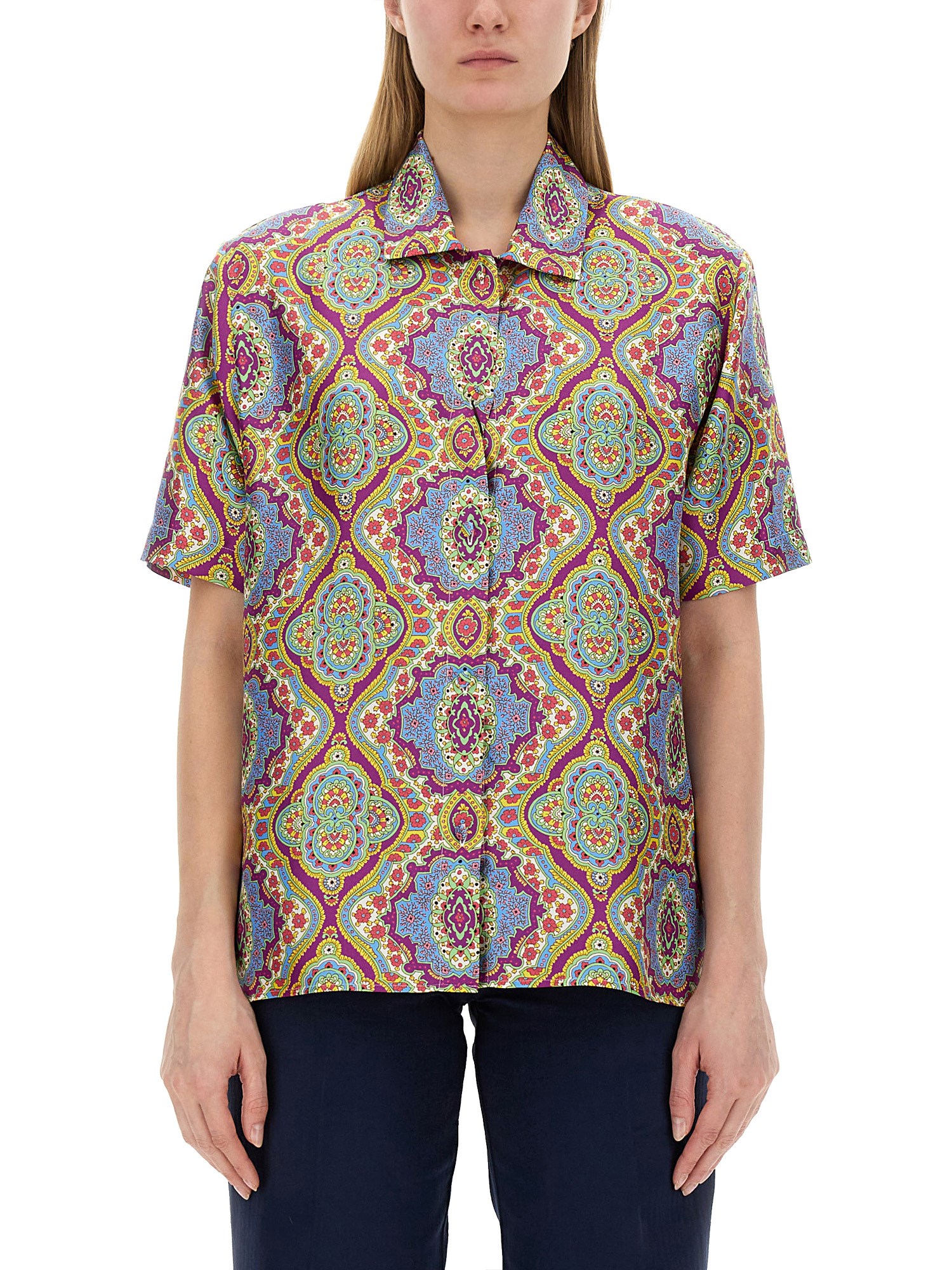 Elevate your wardrobe with our Etro Printed Silk Shirt, the perfect blend of sophistication and style. Crafted with lightweight silk, this shirt features a classic collared neckline and short sleeves for a comfortable and contemporary look. The front button closure adds a touch of elegance, while the all-over design adds a pop of color and vibrancy.