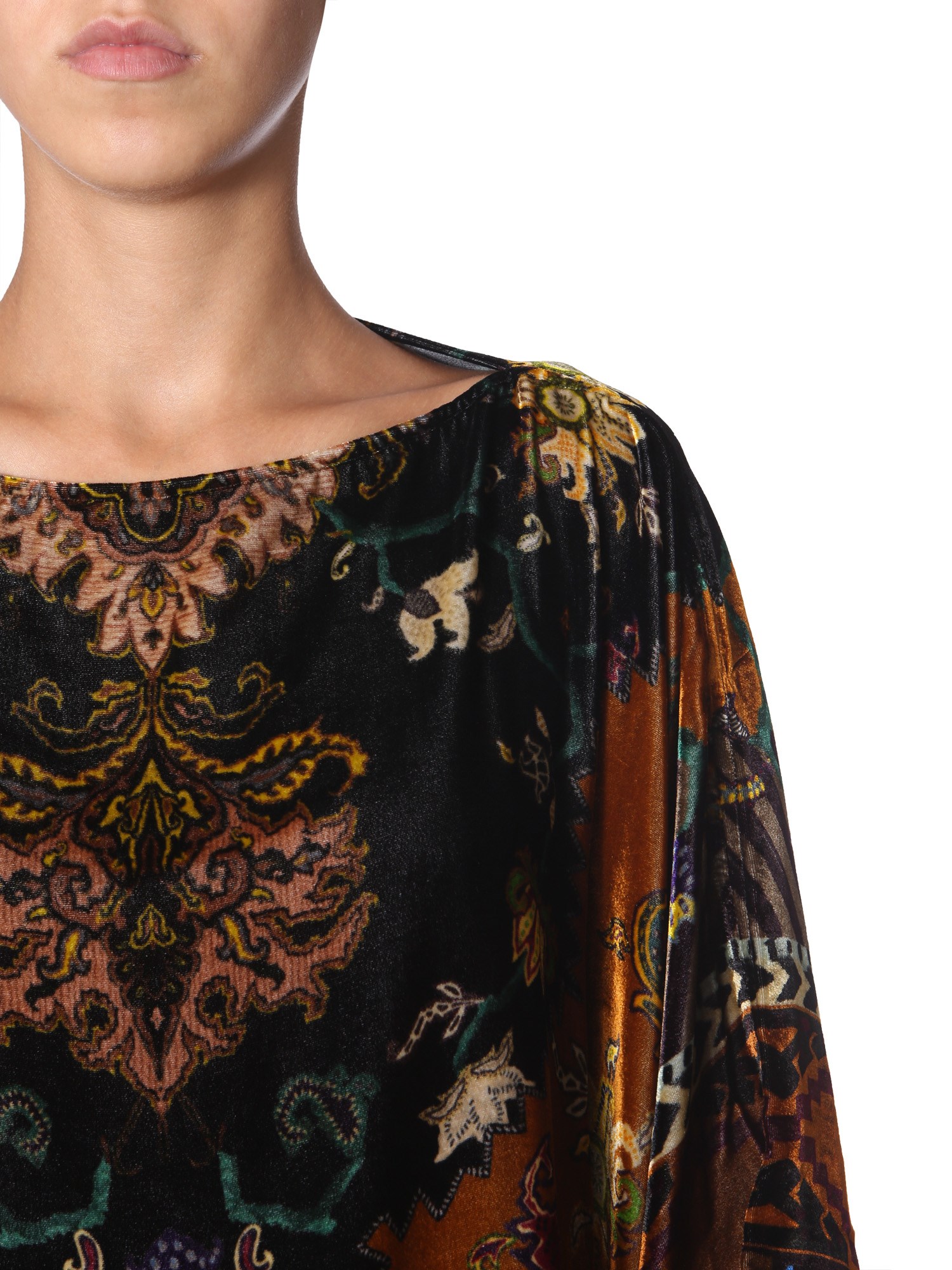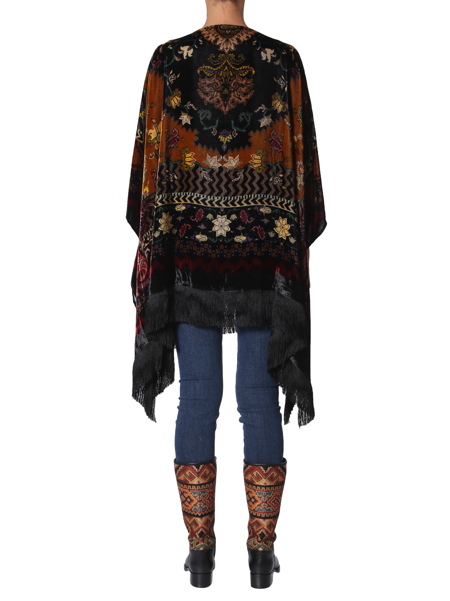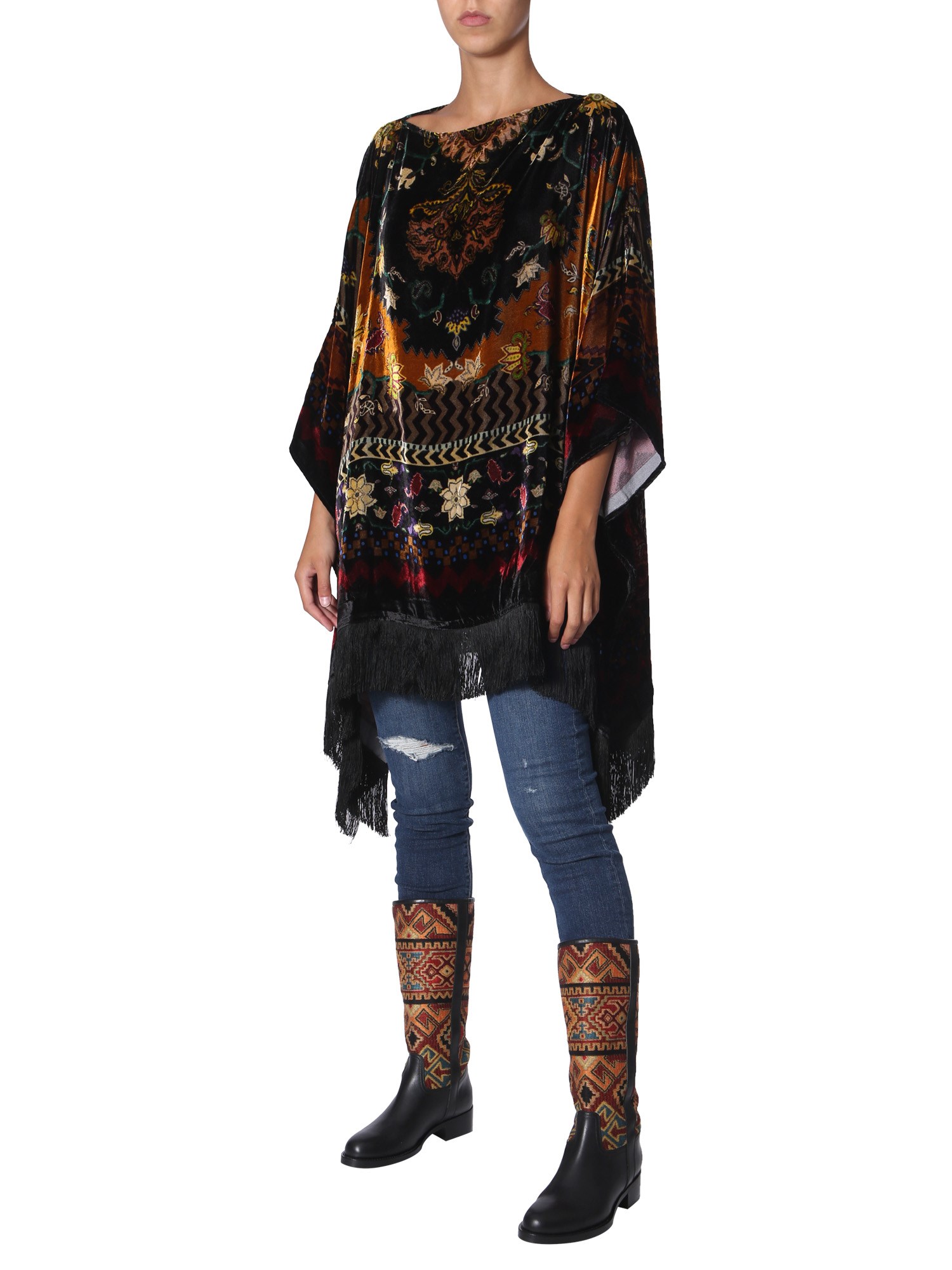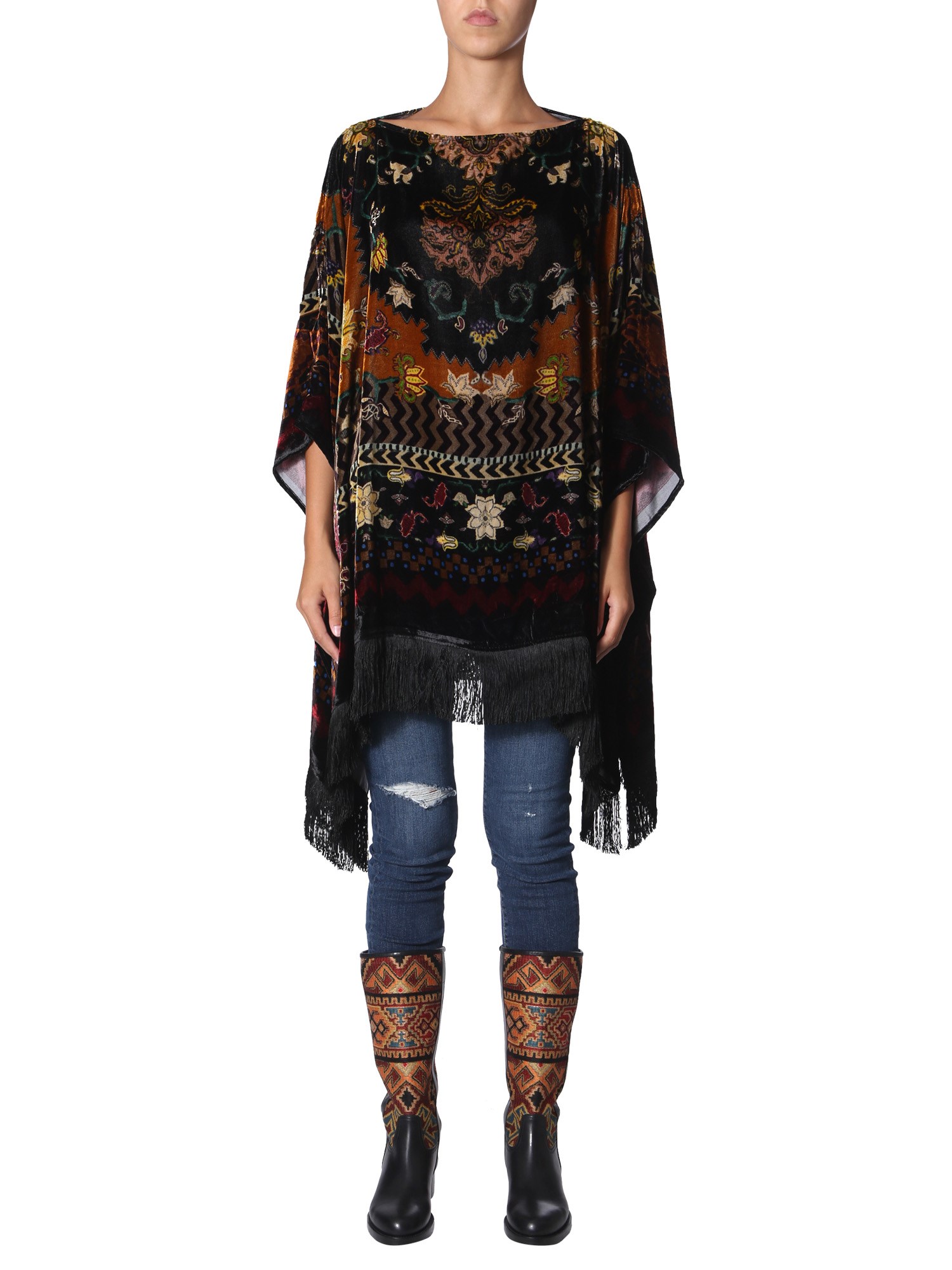 Expand your wardrobe collection with this velvet poncho with fringes from Etro. The poncho is made of 82% viscose, 18% silk that provides a glossy finish to its design. The classic paisley print on entire surface combines with the fringe detail at the borders for a distinct look.