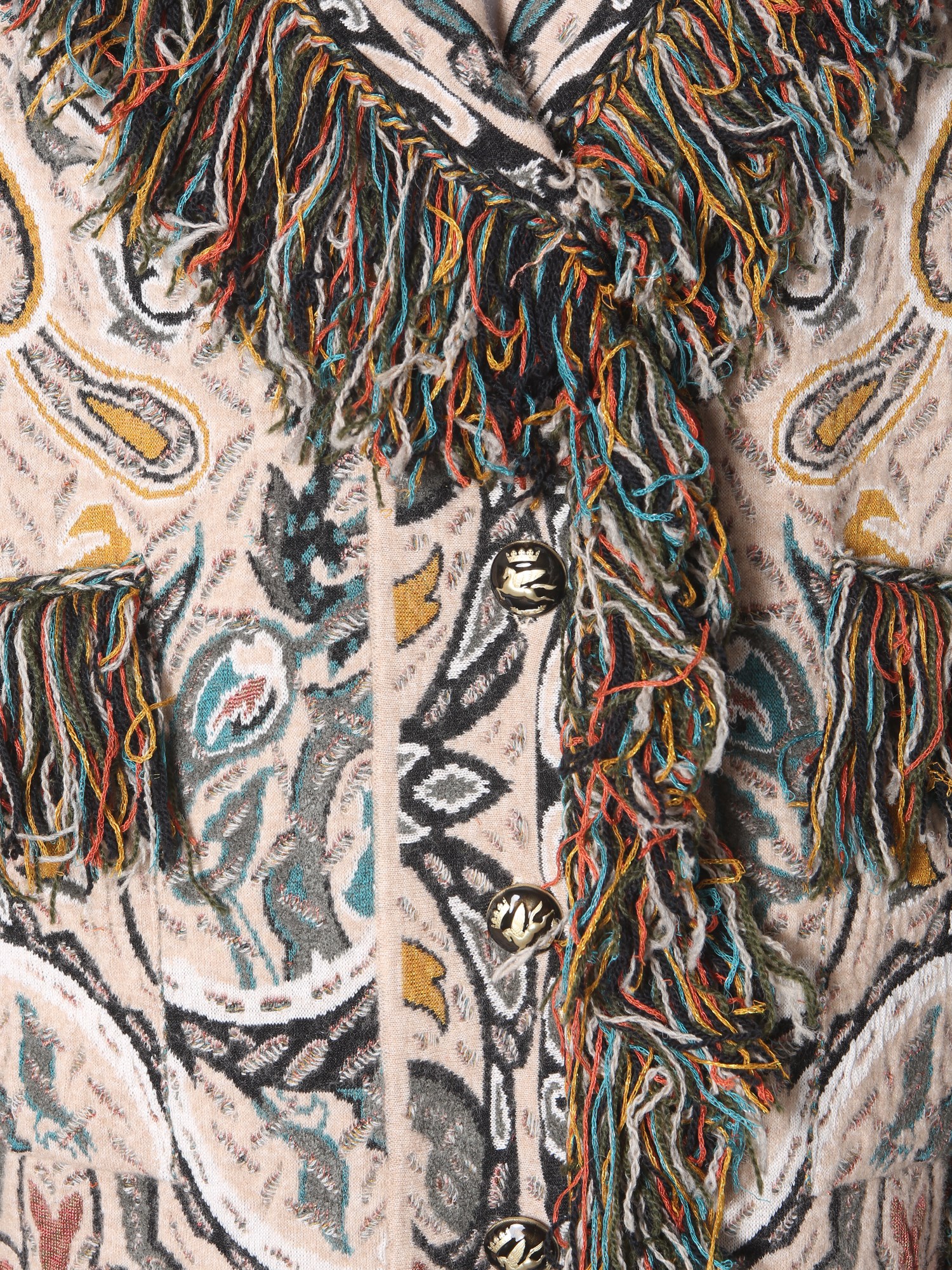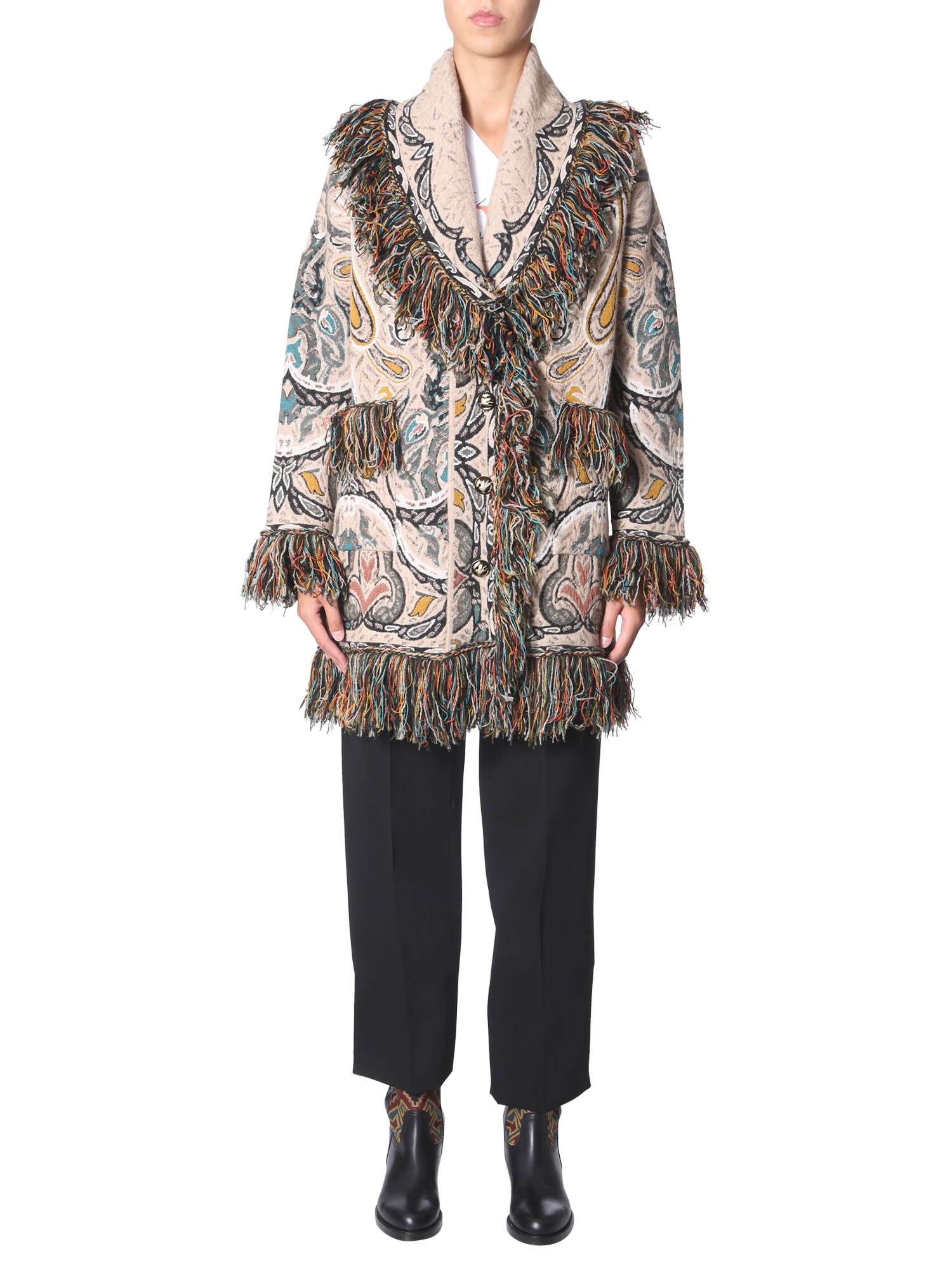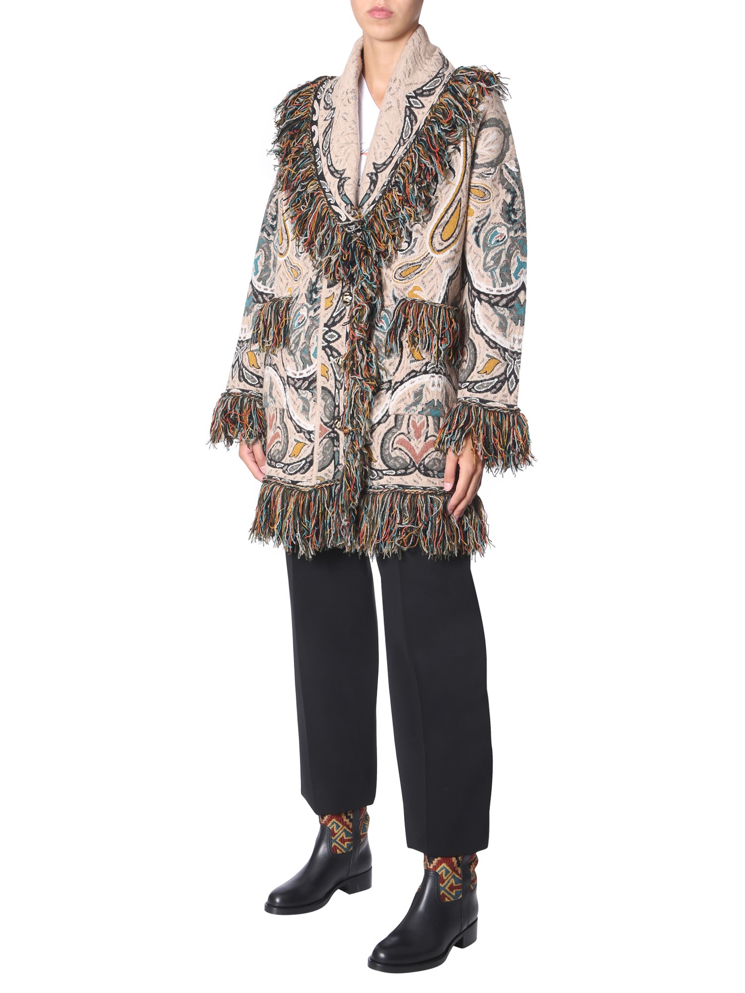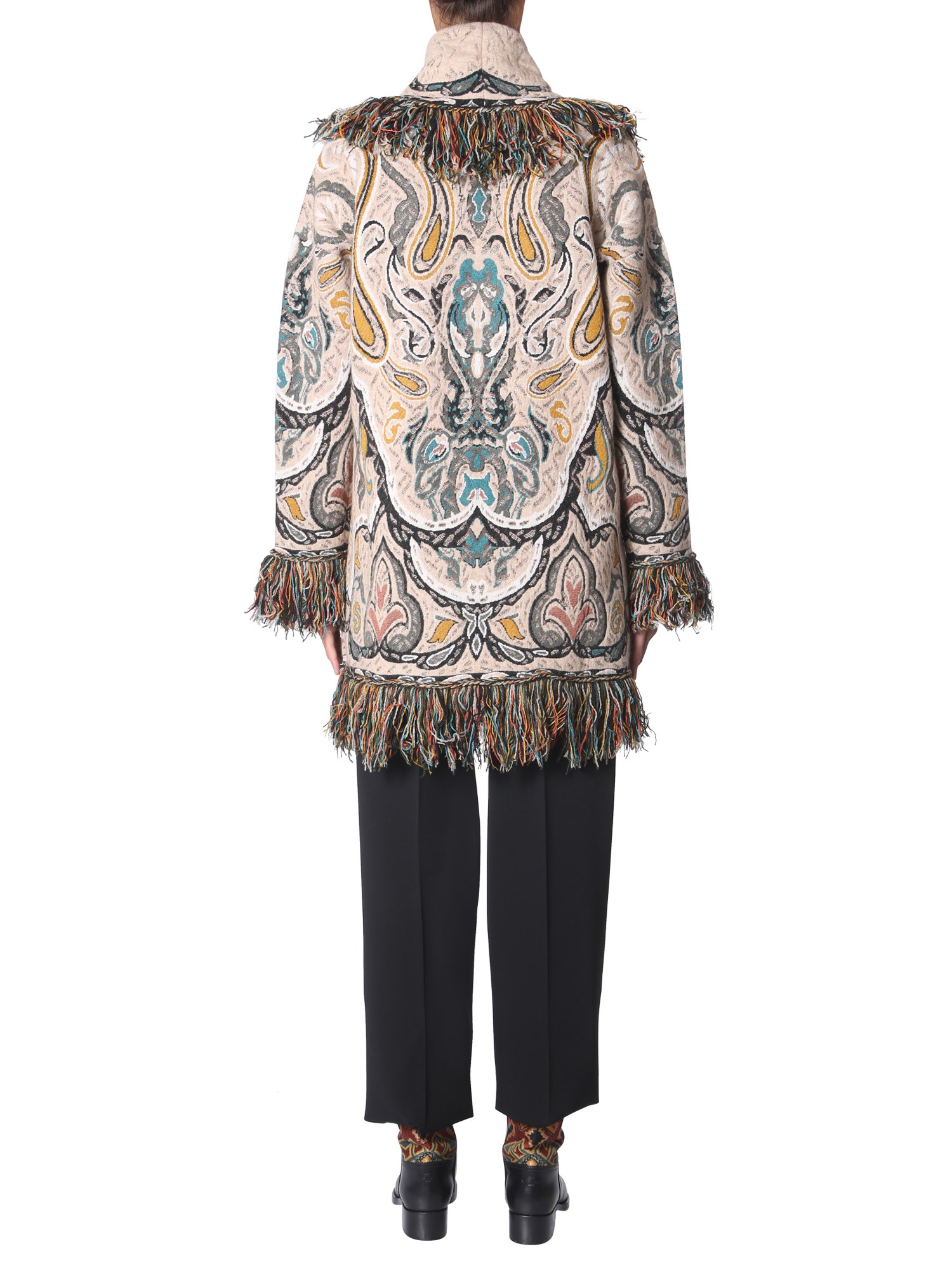 Add variety to your winter wardrobe with this fringed coat from Etro. This viscose, wool, polyester and polyamide blend jacket is sure to keep you warm and snugly in chilly winter. The trendy fringe detailing and all-over printed pattern make it a worthy addition to your winter wardrobe. Team it with leather boots for a trendy a look.