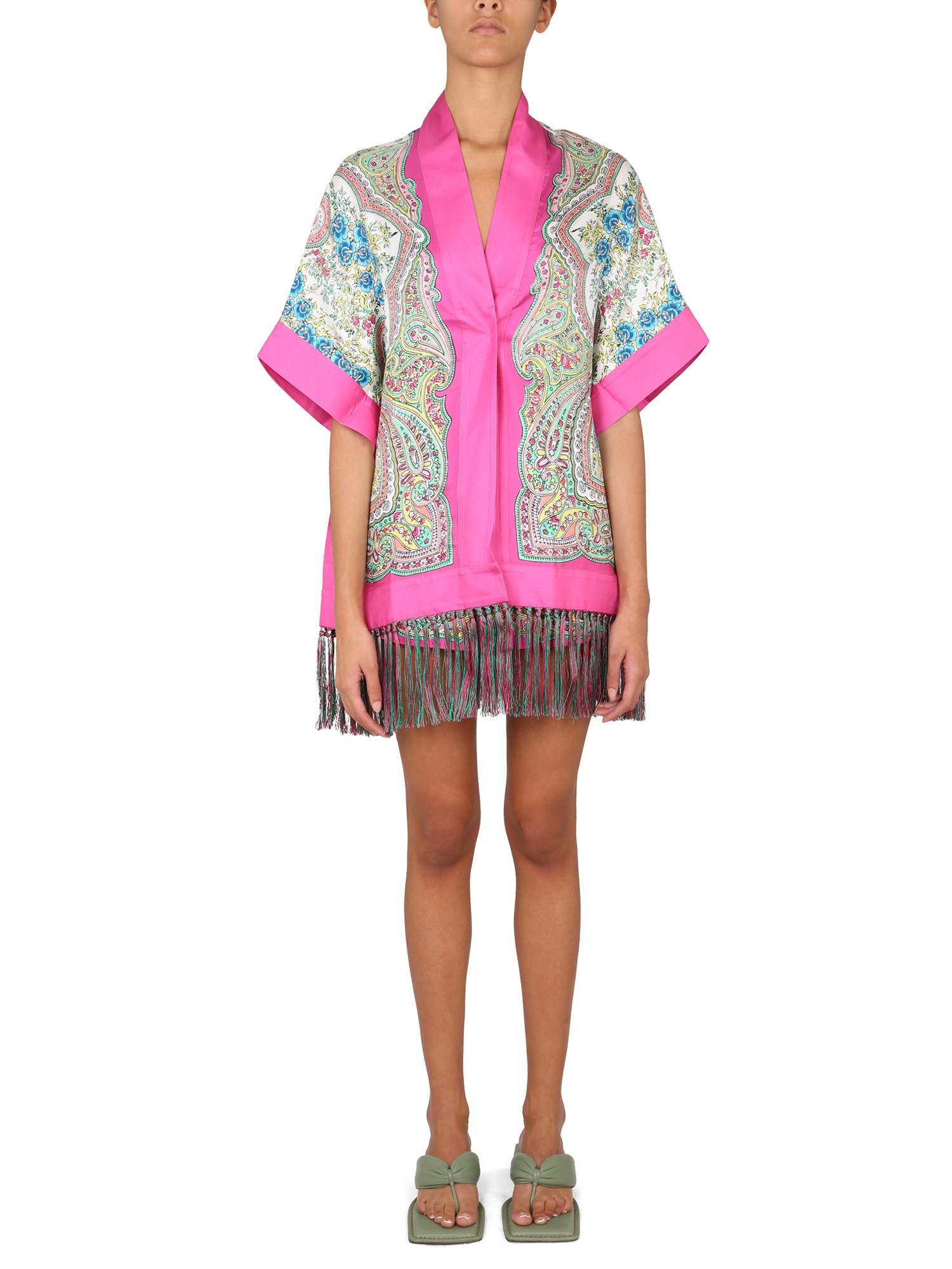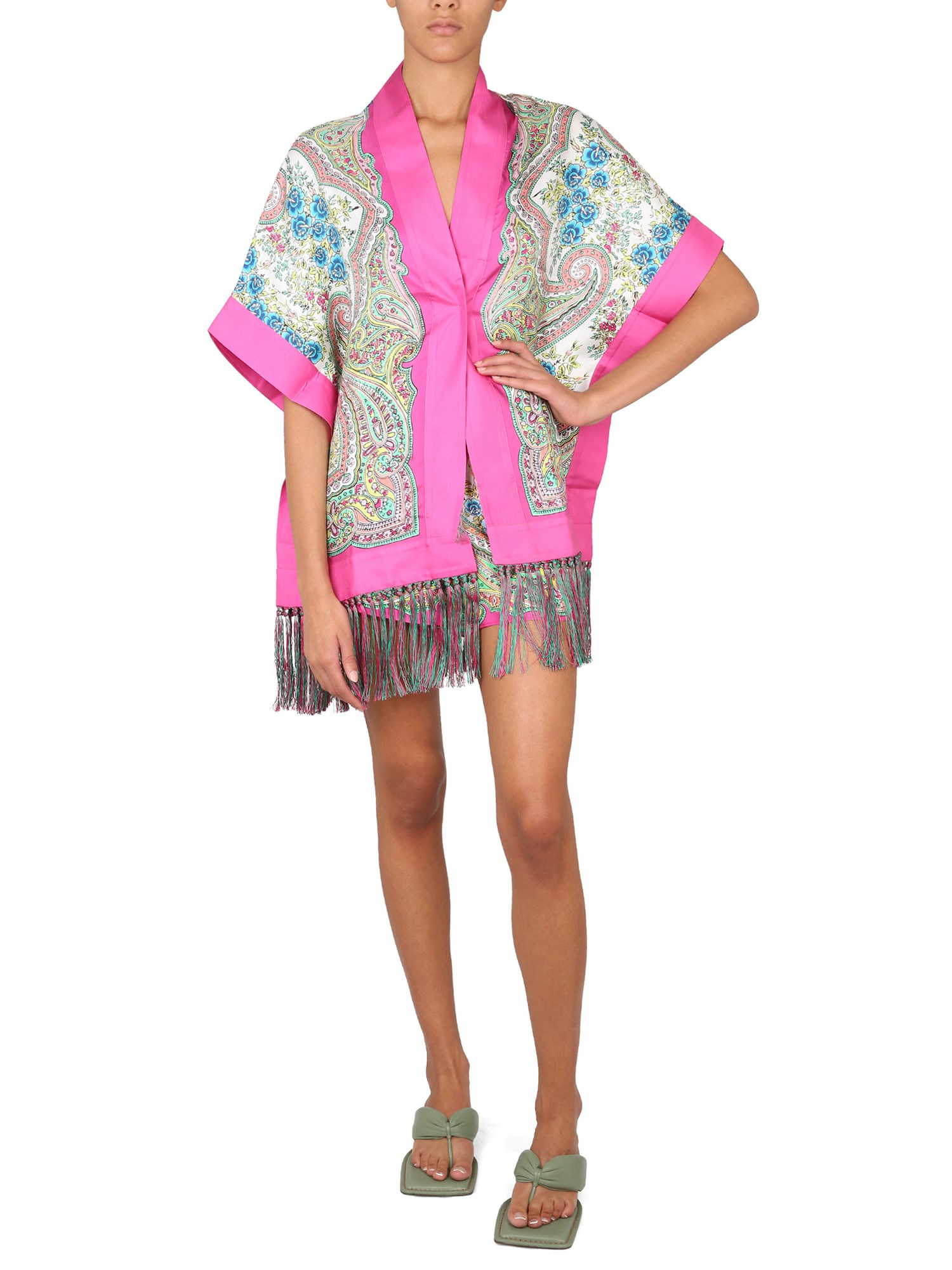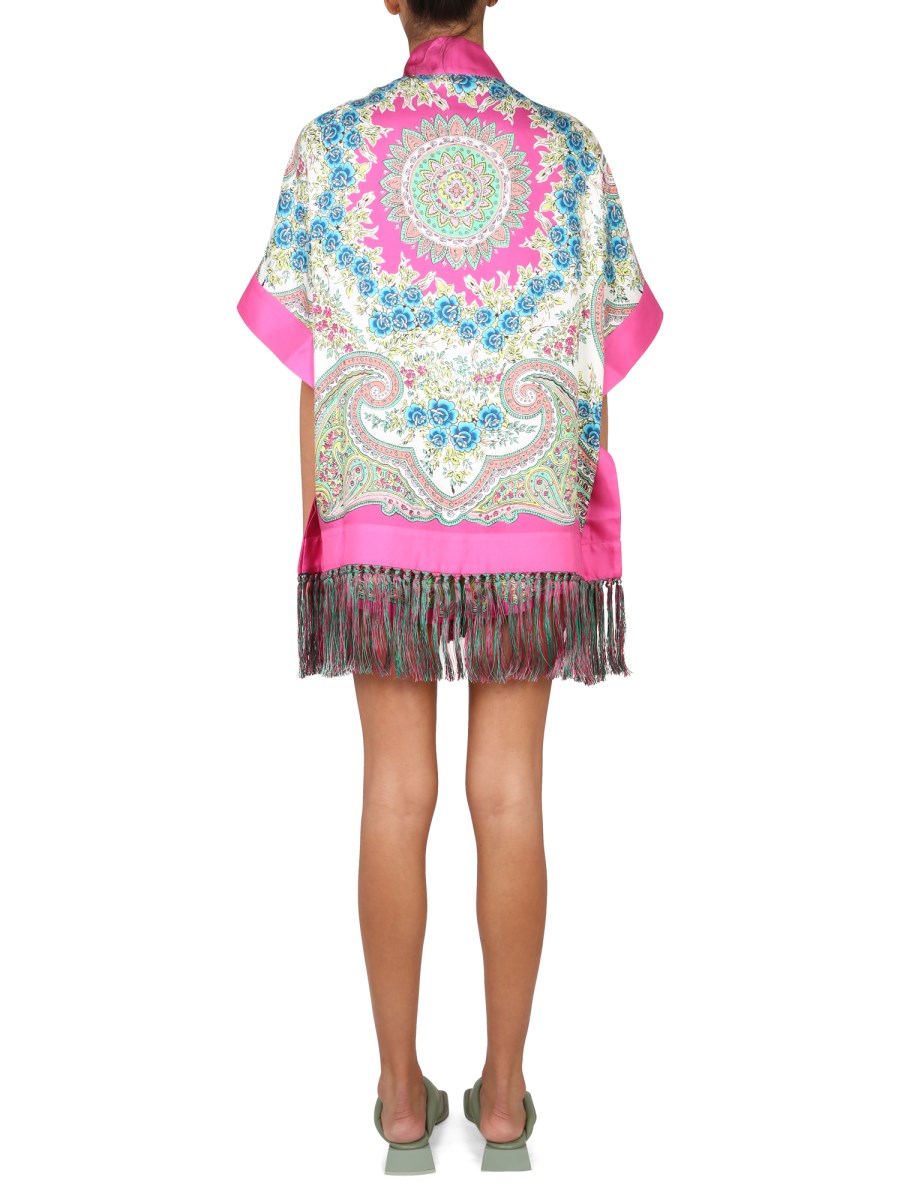 This poncho is a beautiful piece of wearable art. It is made of silk, which makes it lightweight and easy to wear. It has a paisley print, which is a nice pop of colour to the winter-worn wardrobe. It's perfect for days at the office or as a cosy addition to your winter outfit.