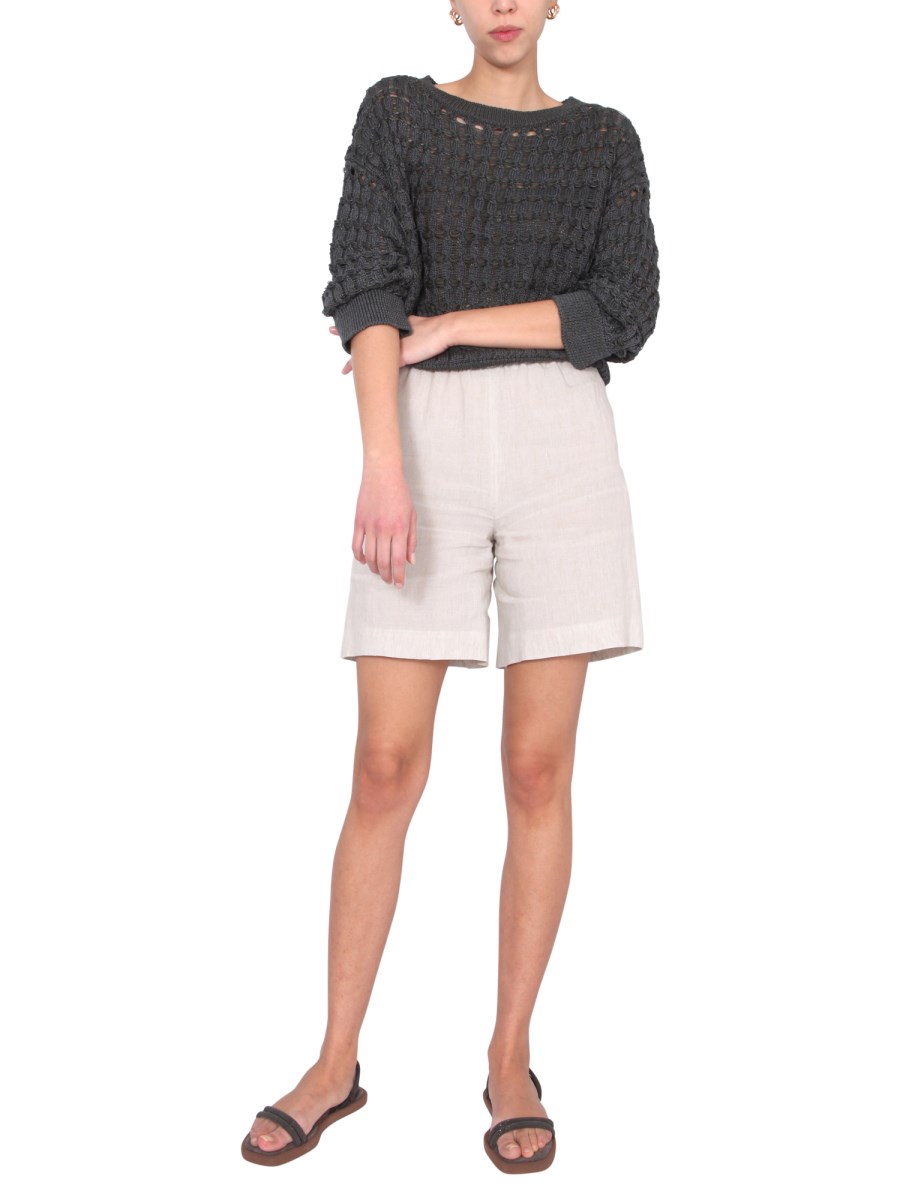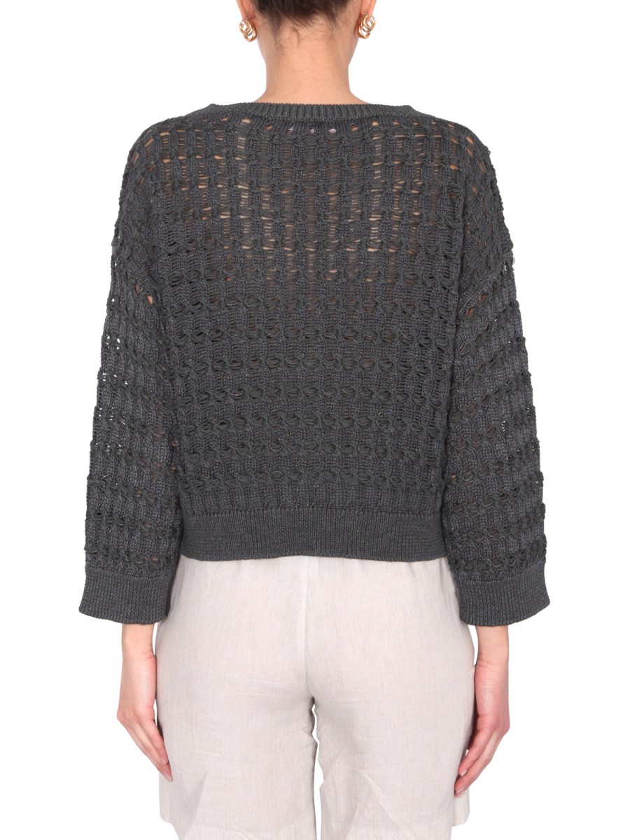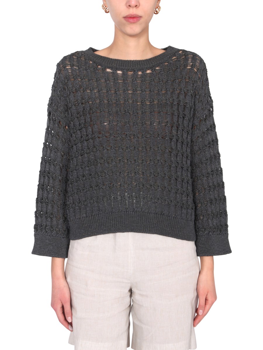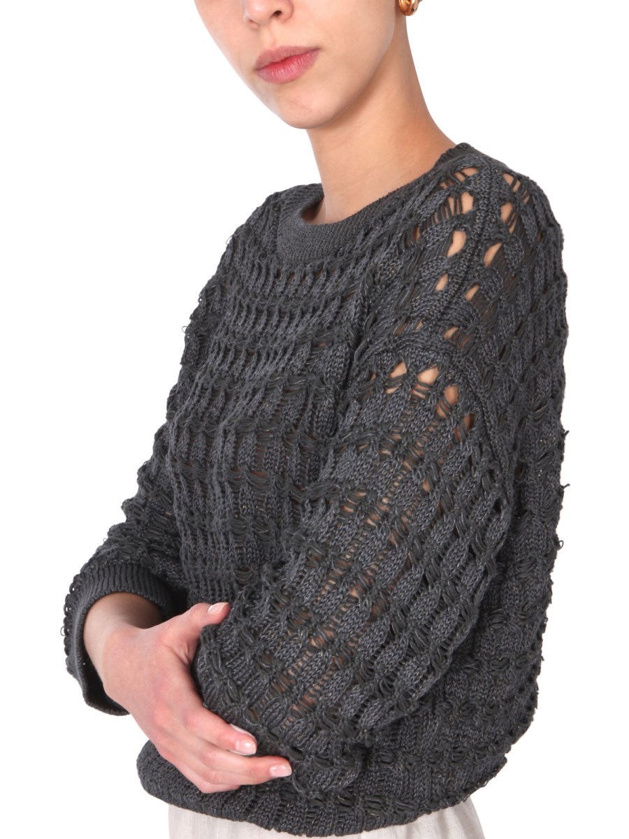 The wefted braid stitch cotton sweater from the house of Fabiana Filippi offers a fun, playful look to any style. The sweater features a boat neck with a ribbed neck, cuffs, and bottom. The oversize fit sweater offers a funky look and is made from a blend of 84% cotton, and 16% polyamide.