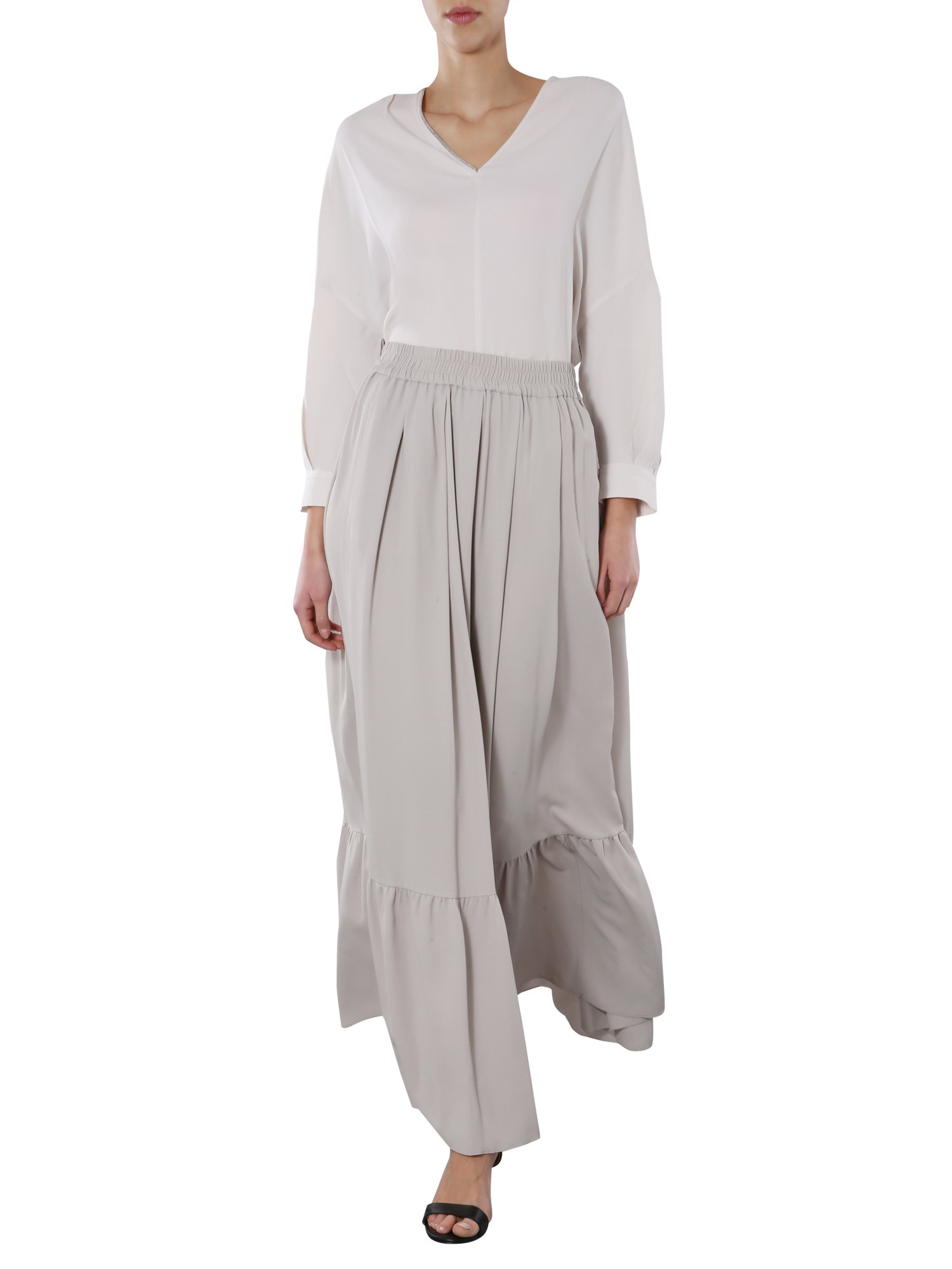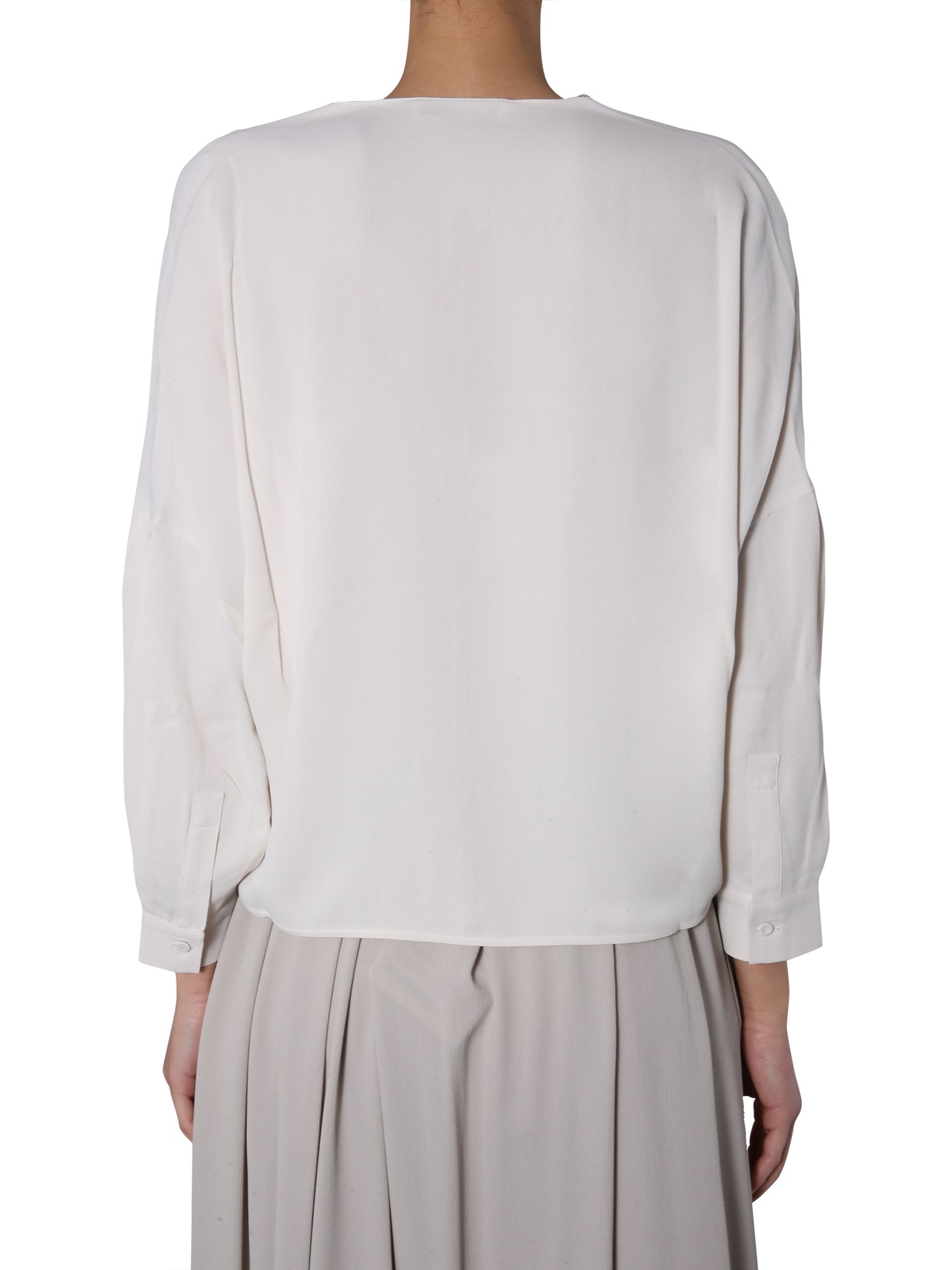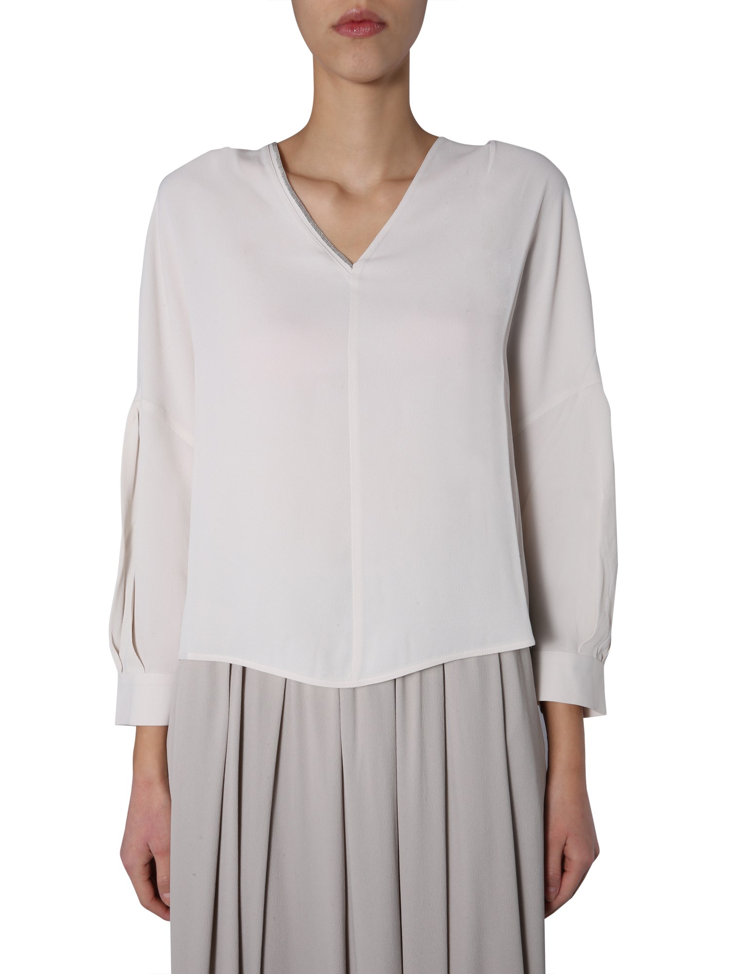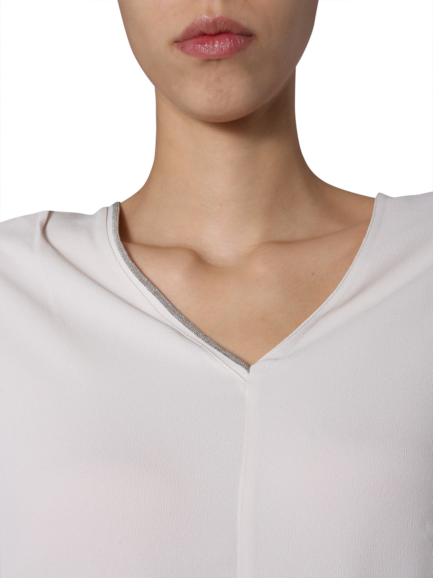 Stop wearing just the shirts for your office and get this V-neck shirt from Fabiana Filippi that looks great when adorned with trousers and heels. This marocaine silk crepe top has a jewel detail on the neck. This lightweight top is made of silk blended fabric that gives it a flowy texture.