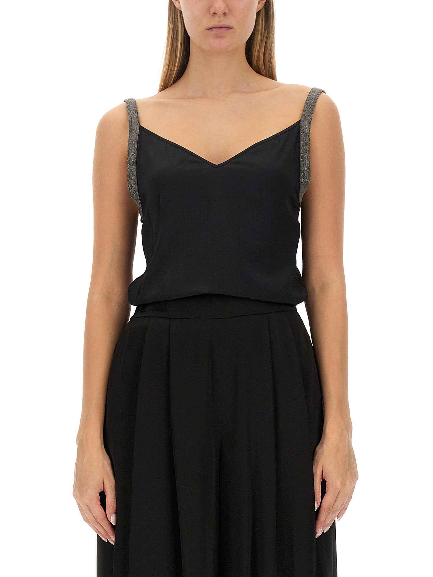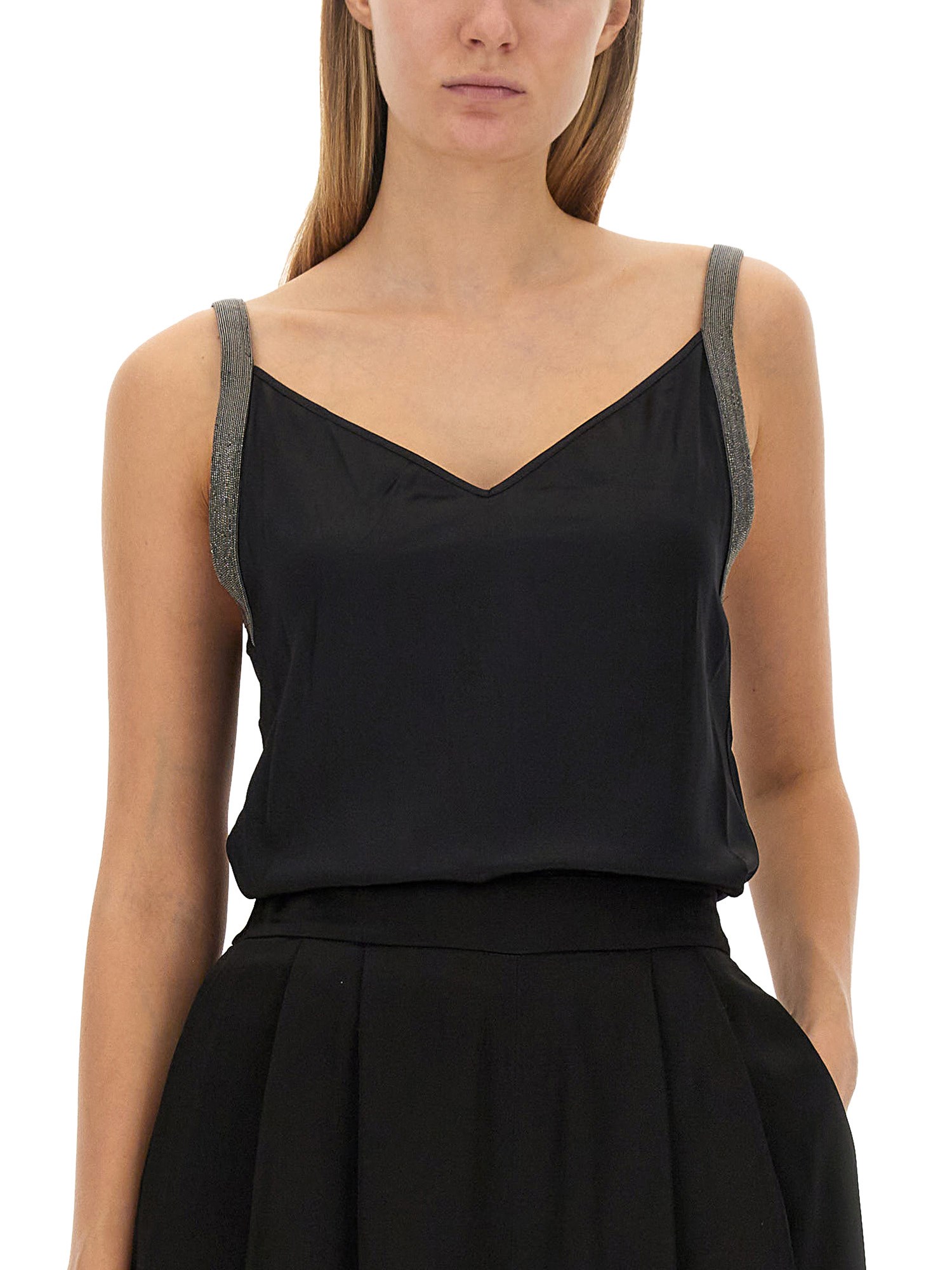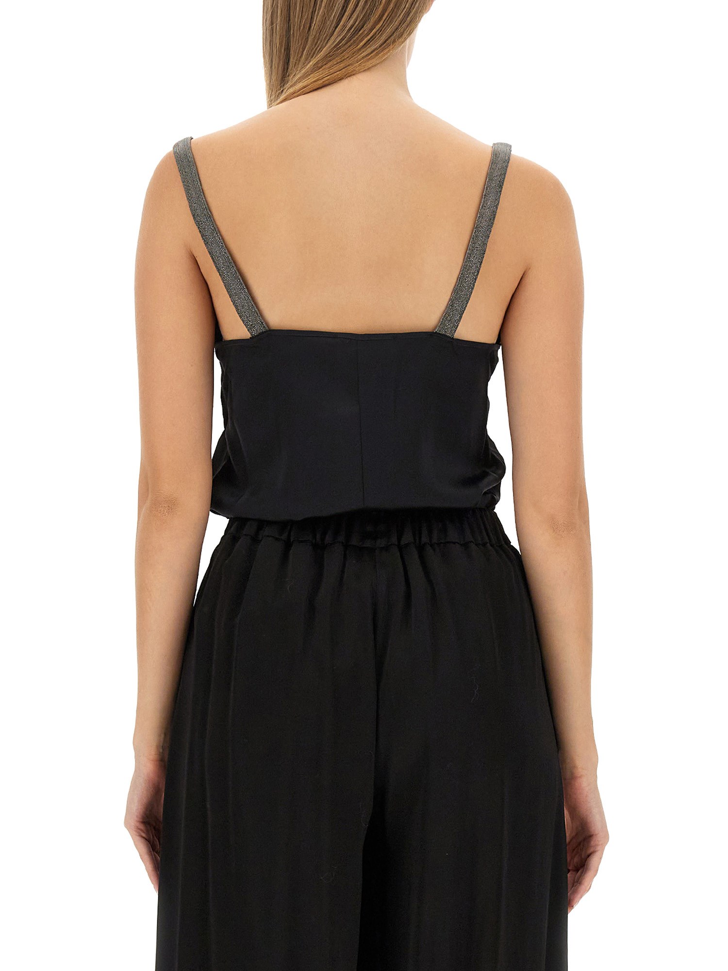 The alluring black satin of this lingerie top from Fabiana Filippi with its sleek, modern style is the perfect outfit for an elegant evening or night out. This top is lined with a soft satin fabric, so it is both comfortable and breathable. This top is an elegant, classy fabric, perfect for those who want to show off their sensual side
