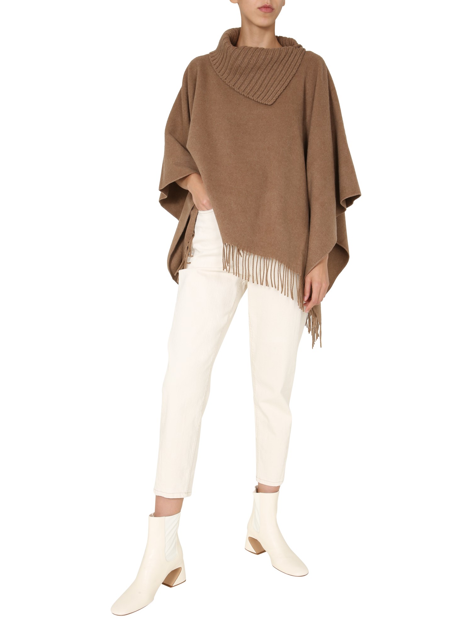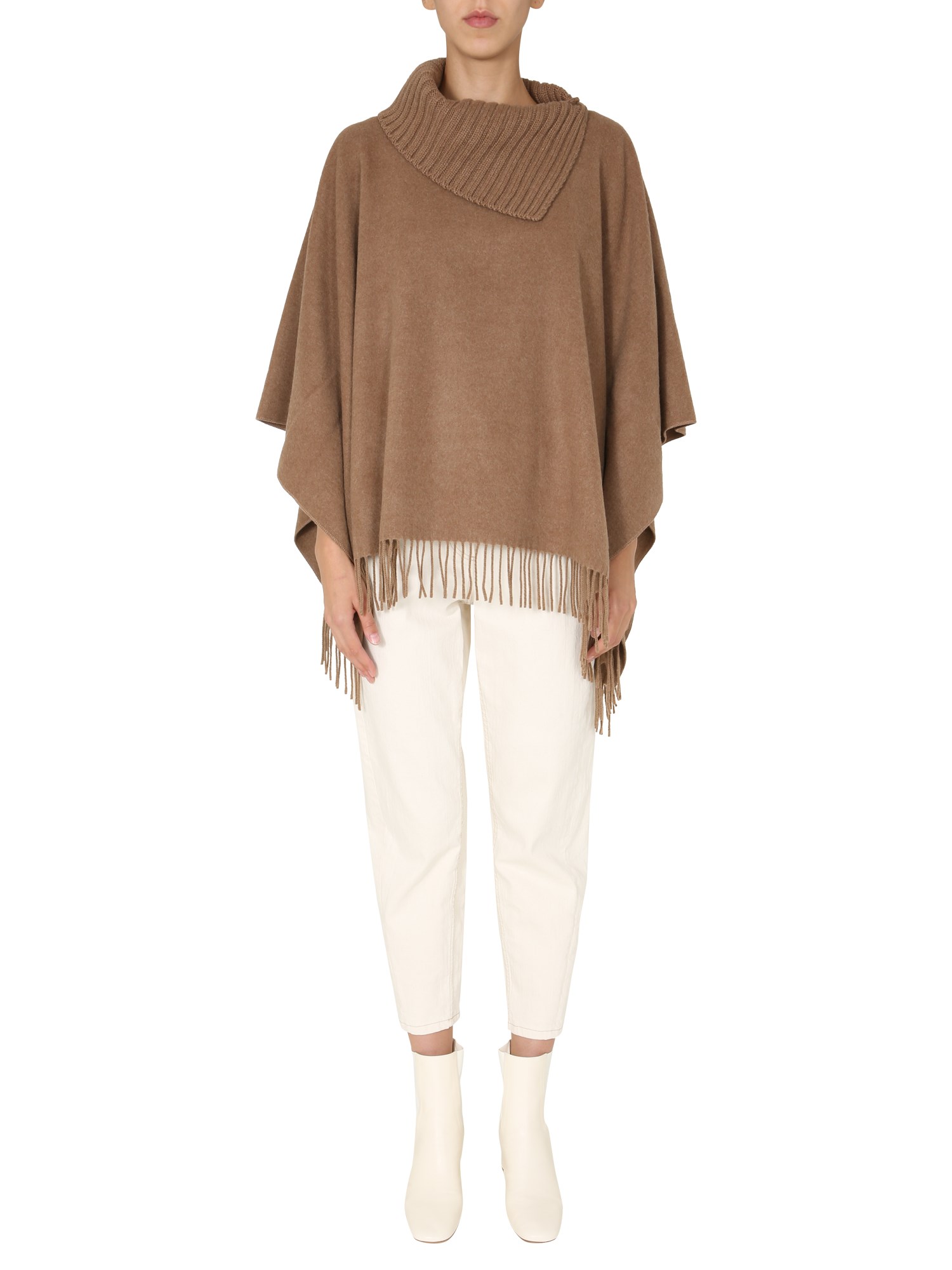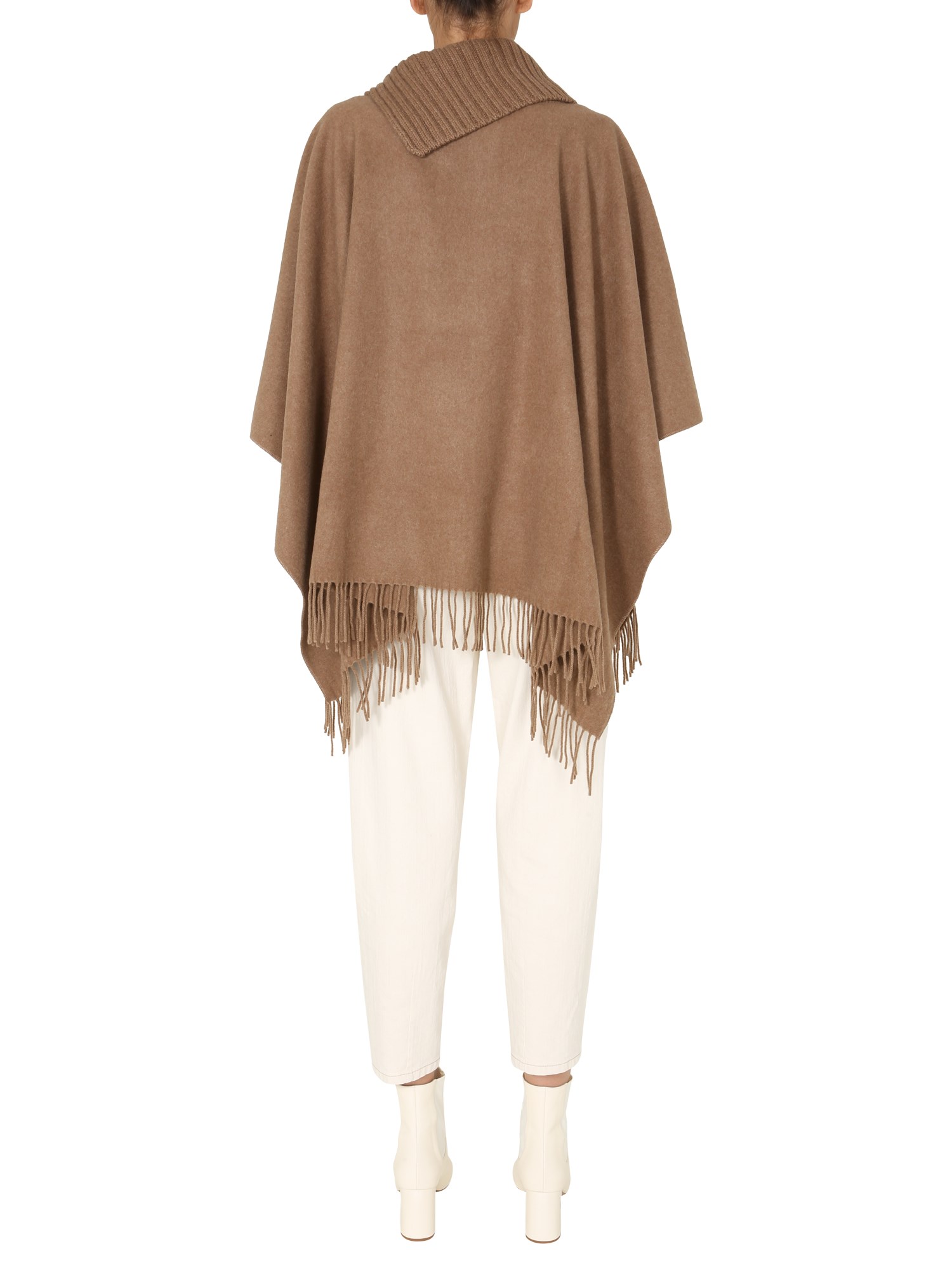 The Fabiana Filippi Knit Collar Cape has a ribbed knit high neck with a button that looks visually appealing. With the fringed profile at the bottom, this cape has an interesting edge. Fabricated from a blend of virgin wool, silk and cashmere, this cape is lightweight, warm and comfortable to wear.