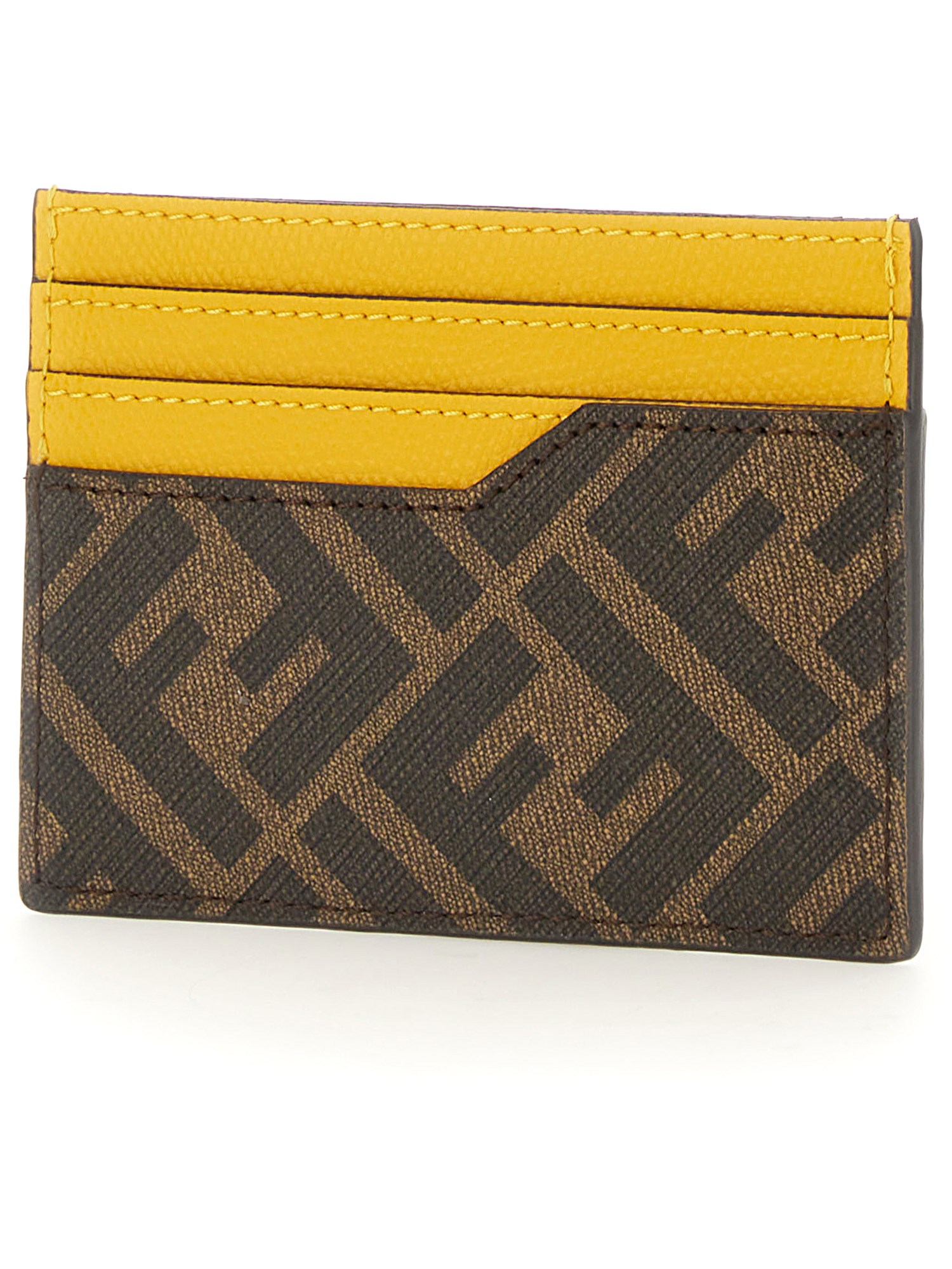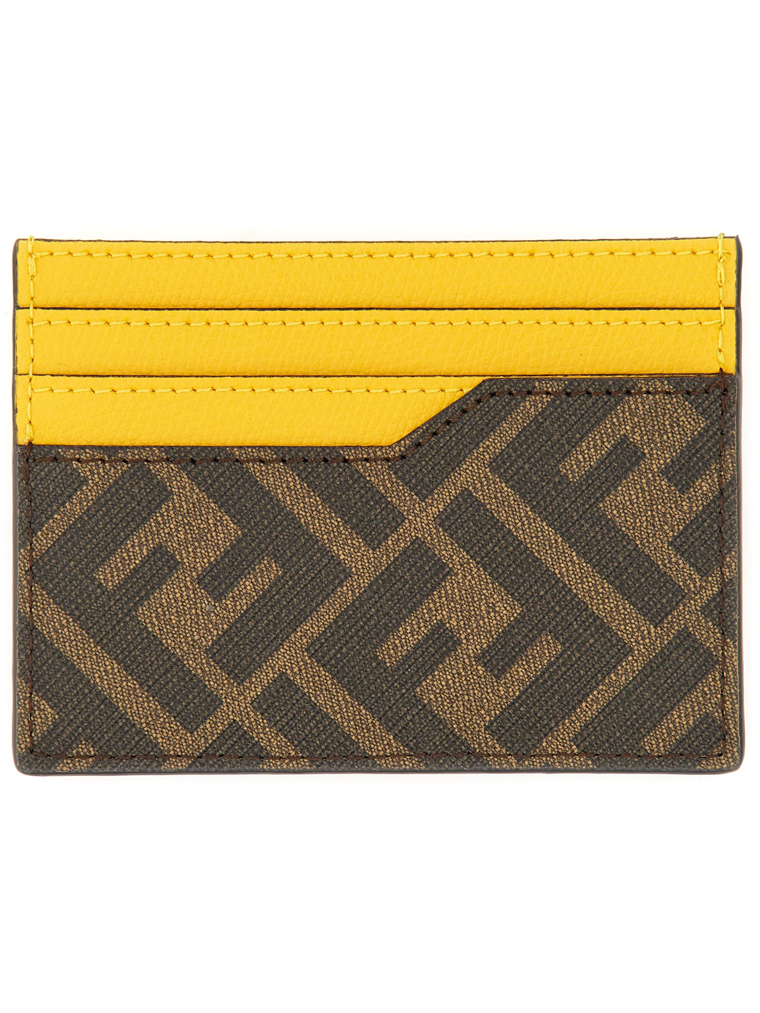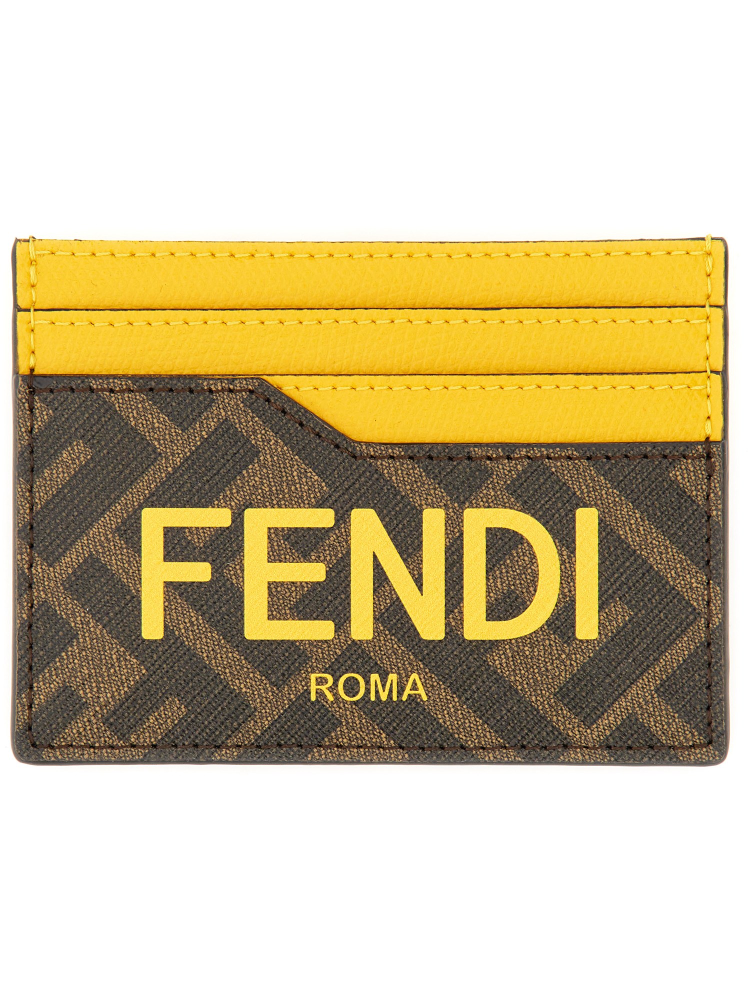 Card holder with central flat pocket and 6 slots. Made of textured fabric with FF motif in brown and contrasting FENDI ROMA print. Yellow leather details.