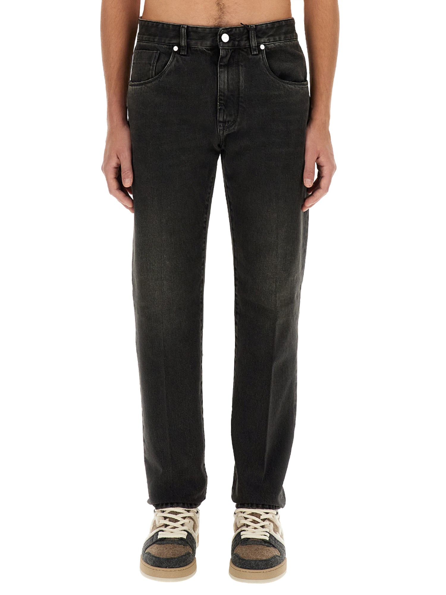 Straight-cut 5-pocket trousers. Embellished with branded rivets and buttons. Concealed zip fastening. Made of black washed cotton denim. Embellished with the Fendi label in black leather on the back.