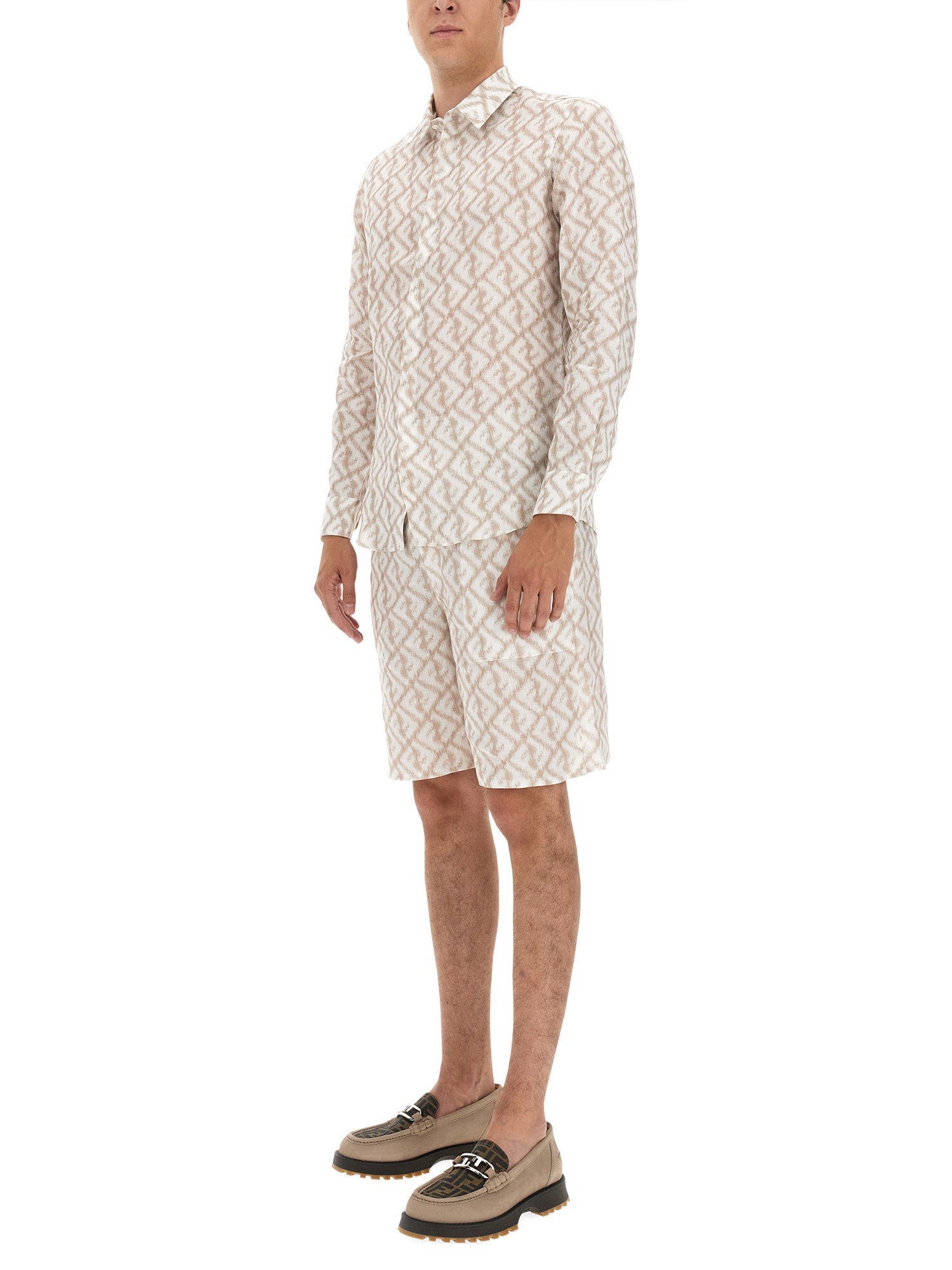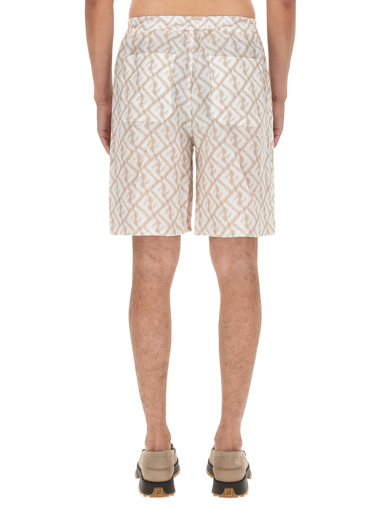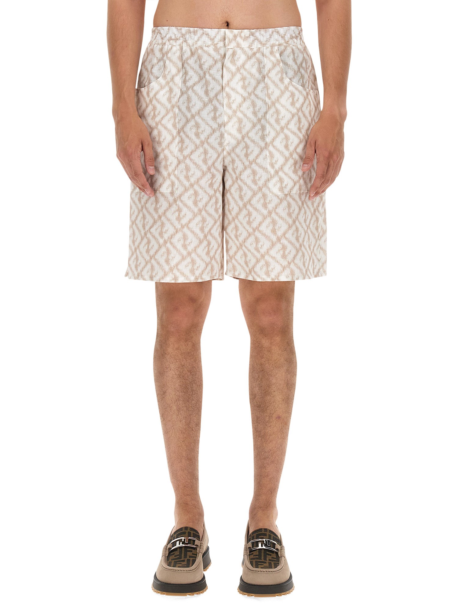 Bermudas with elastic waistband and pleats on the front. Side pockets and patch pockets on the back. Concealed closure with button and zip. Made of linen with ikat-effect diagonal FF motif printed all over in white and beige.