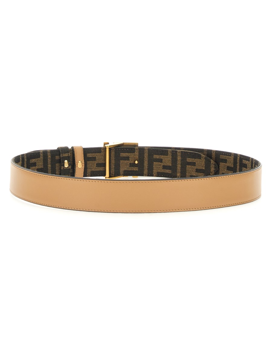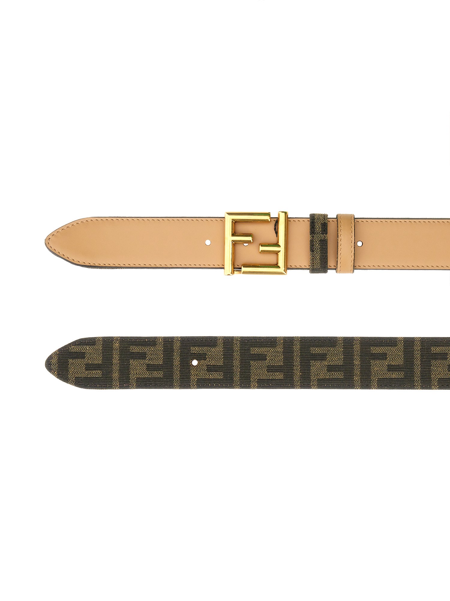 Reversible belt with loop and iconic FF stud buckle. Made of beige leather on one side and fabric with the FF motif in brown and tobacco on the other side. Gold-finish metalware.
