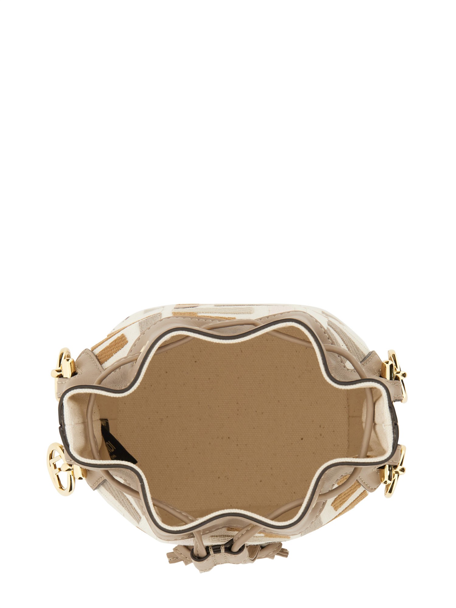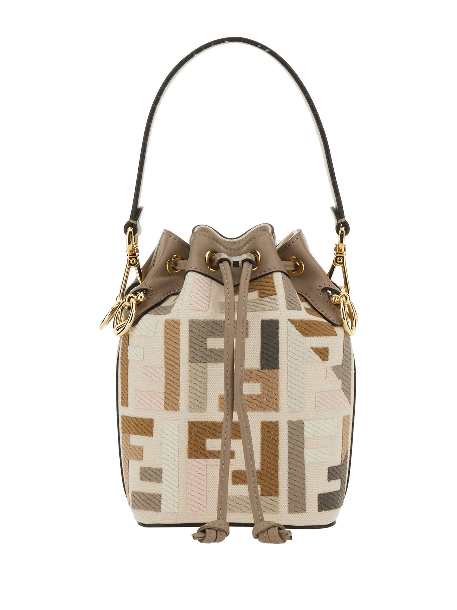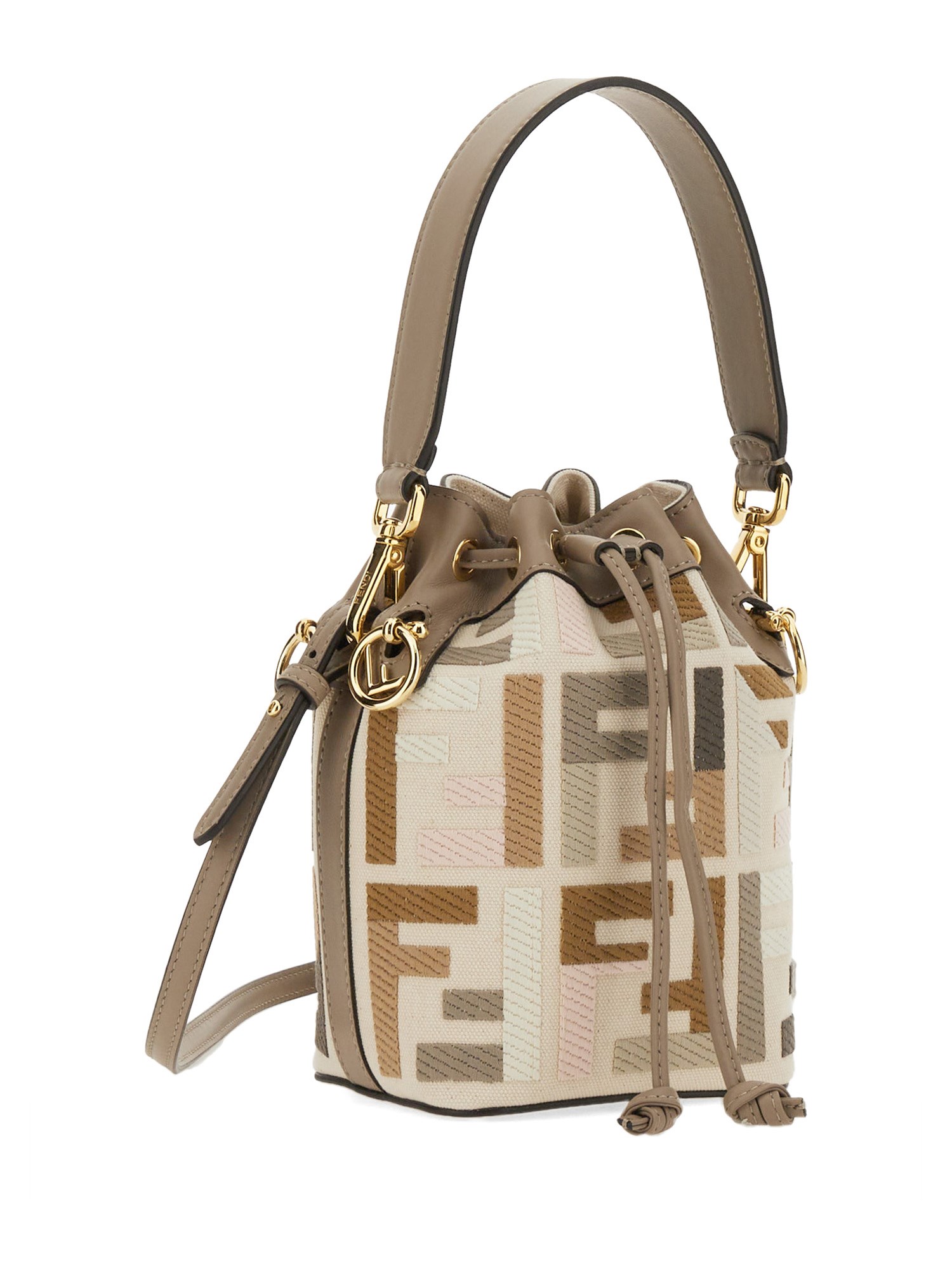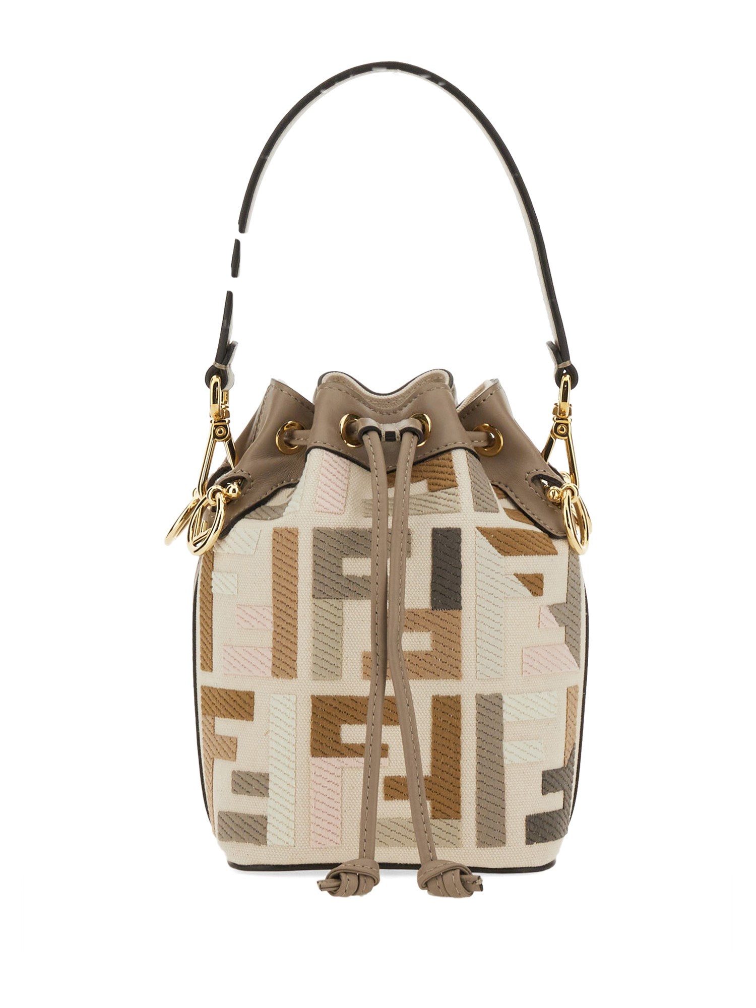 Small Mon Tresor bucket bag made of natural-coloured canvas with the FF motif in a multicolour thread raised embroidery and trimmed in dove grey leather.Lined and with gold-finish metalware. Featuring two detachable shoulder straps, one long and one short, to wear the bag over the shoulder or cross-body.
