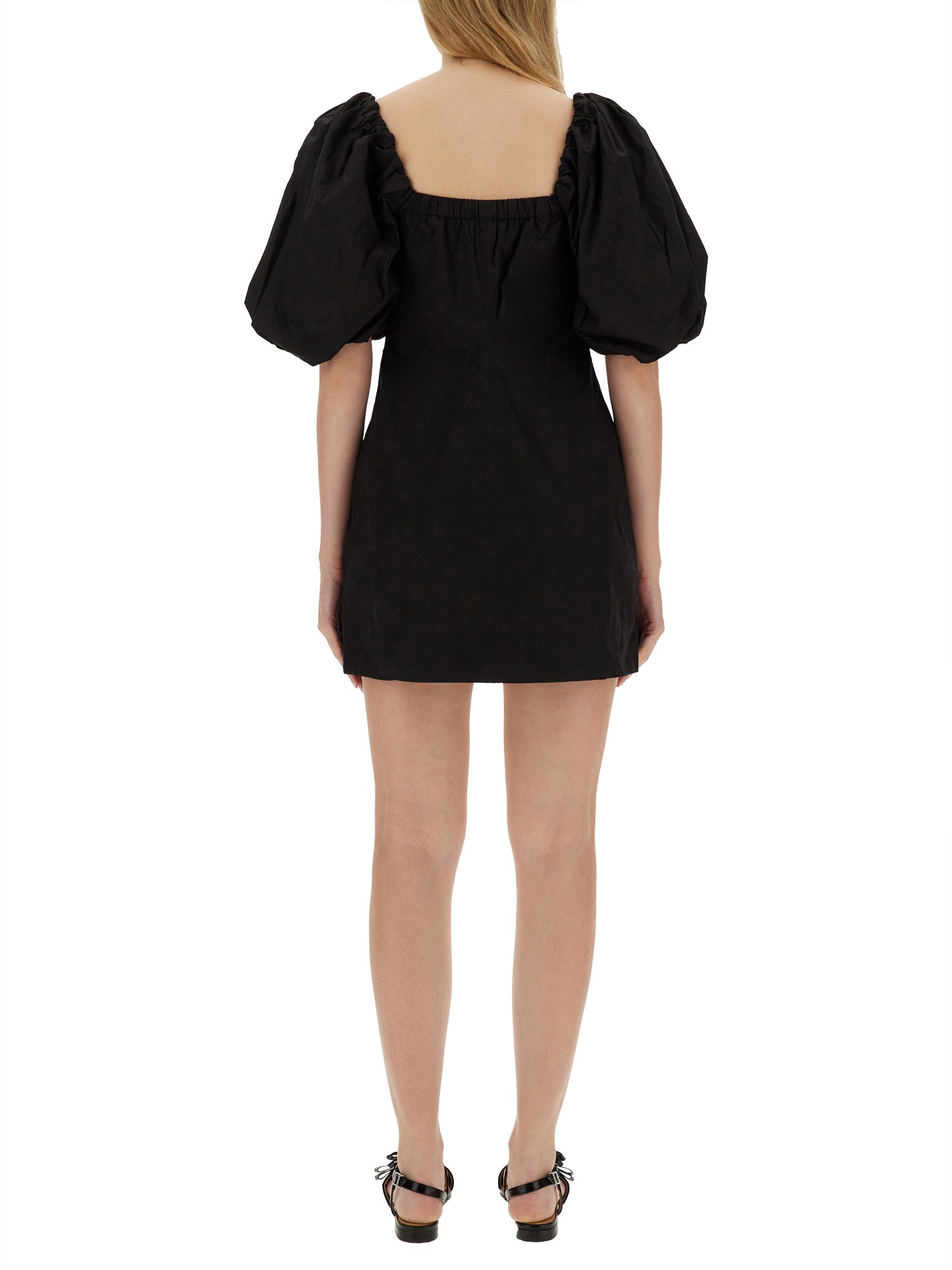 This elegant black mini dress from Ganni features stylish puff sleeves, adding a touch of sophistication to the classic LBD. The dress is made from high-quality materials and is designed to flatter the figure, making it a versatile and timeless addition to any wardrobe. Perfect for both formal and casual occasions, this dress is a must-have for any fashion-forward individual looking to make a statement.