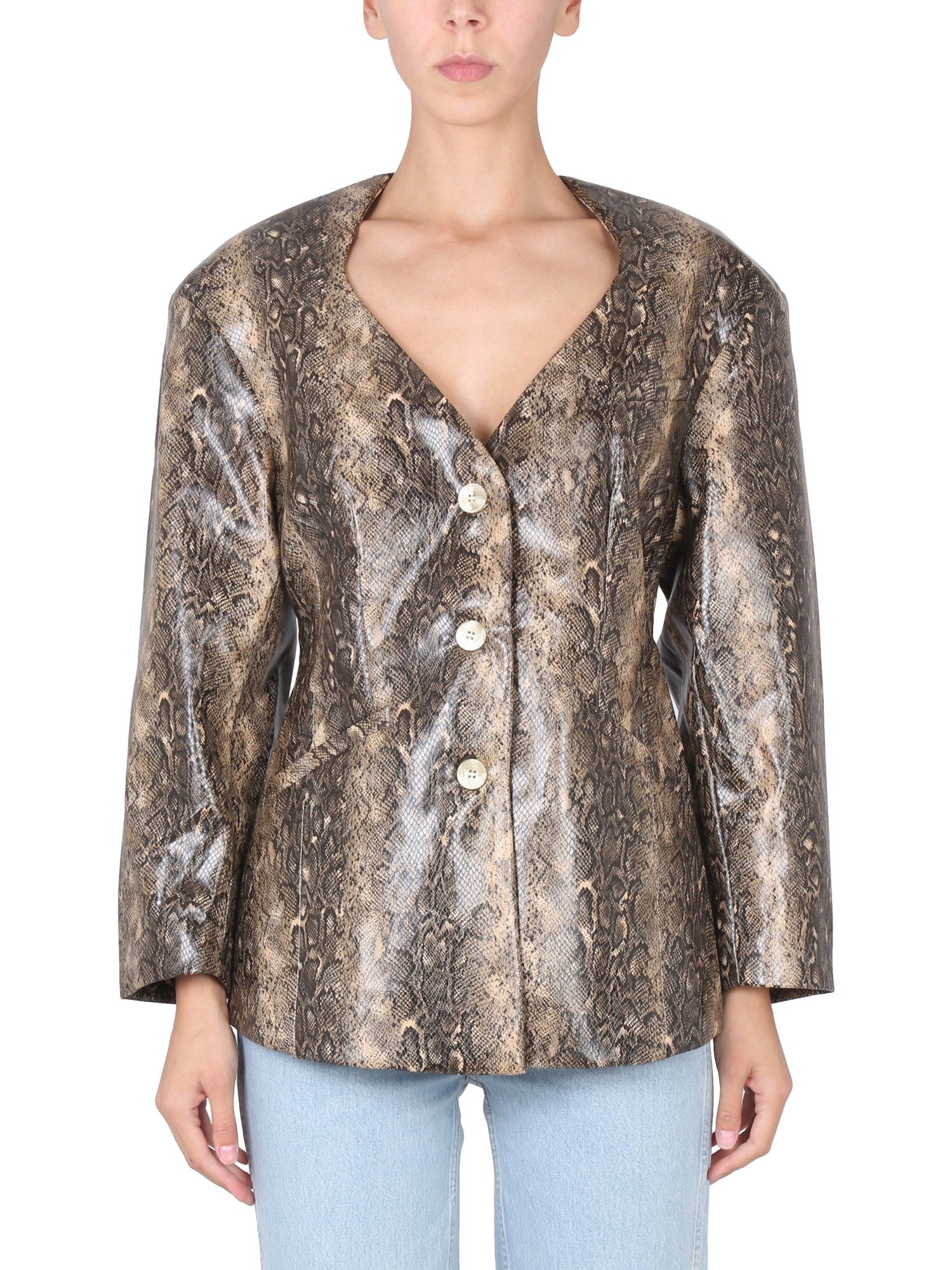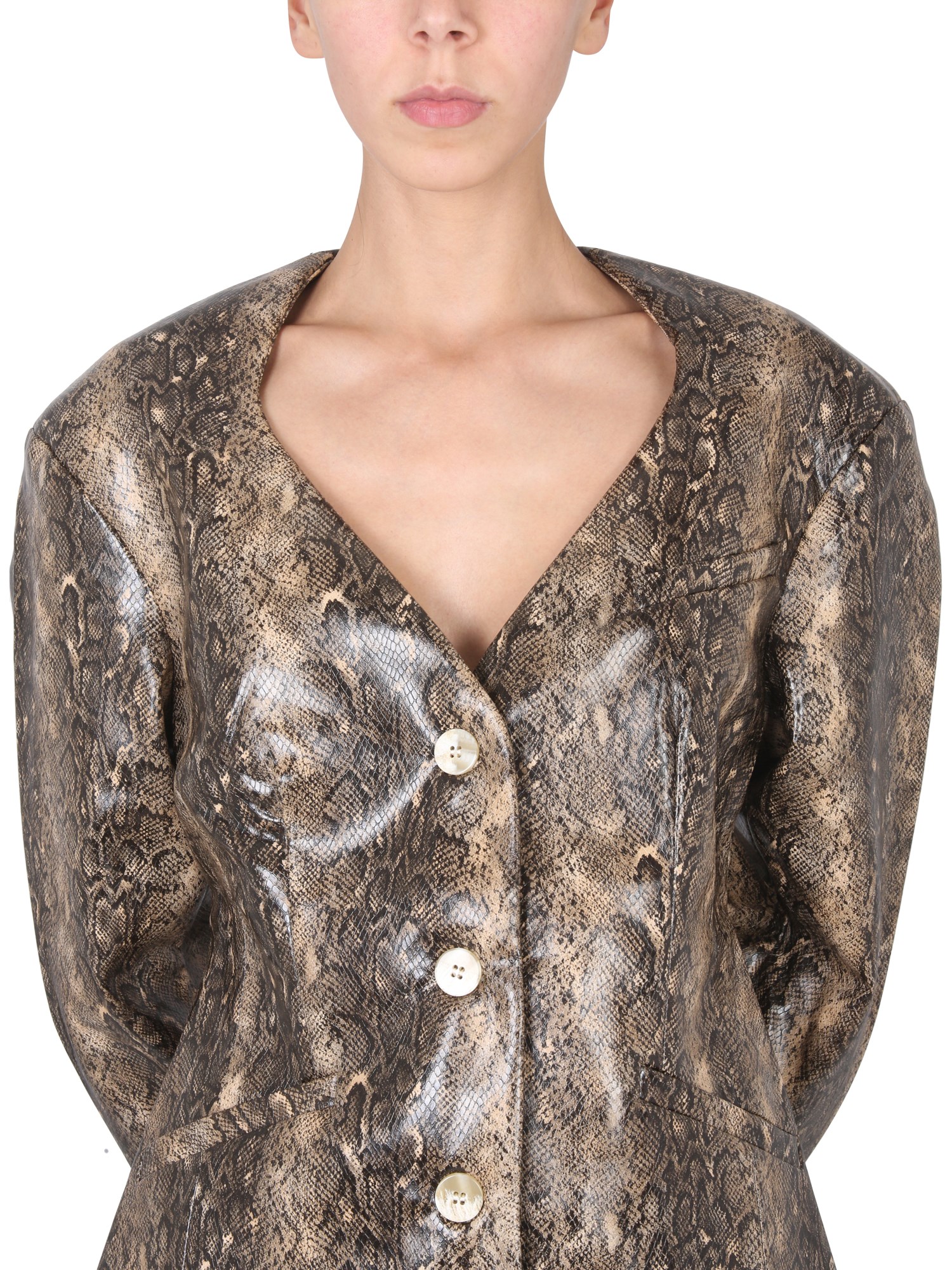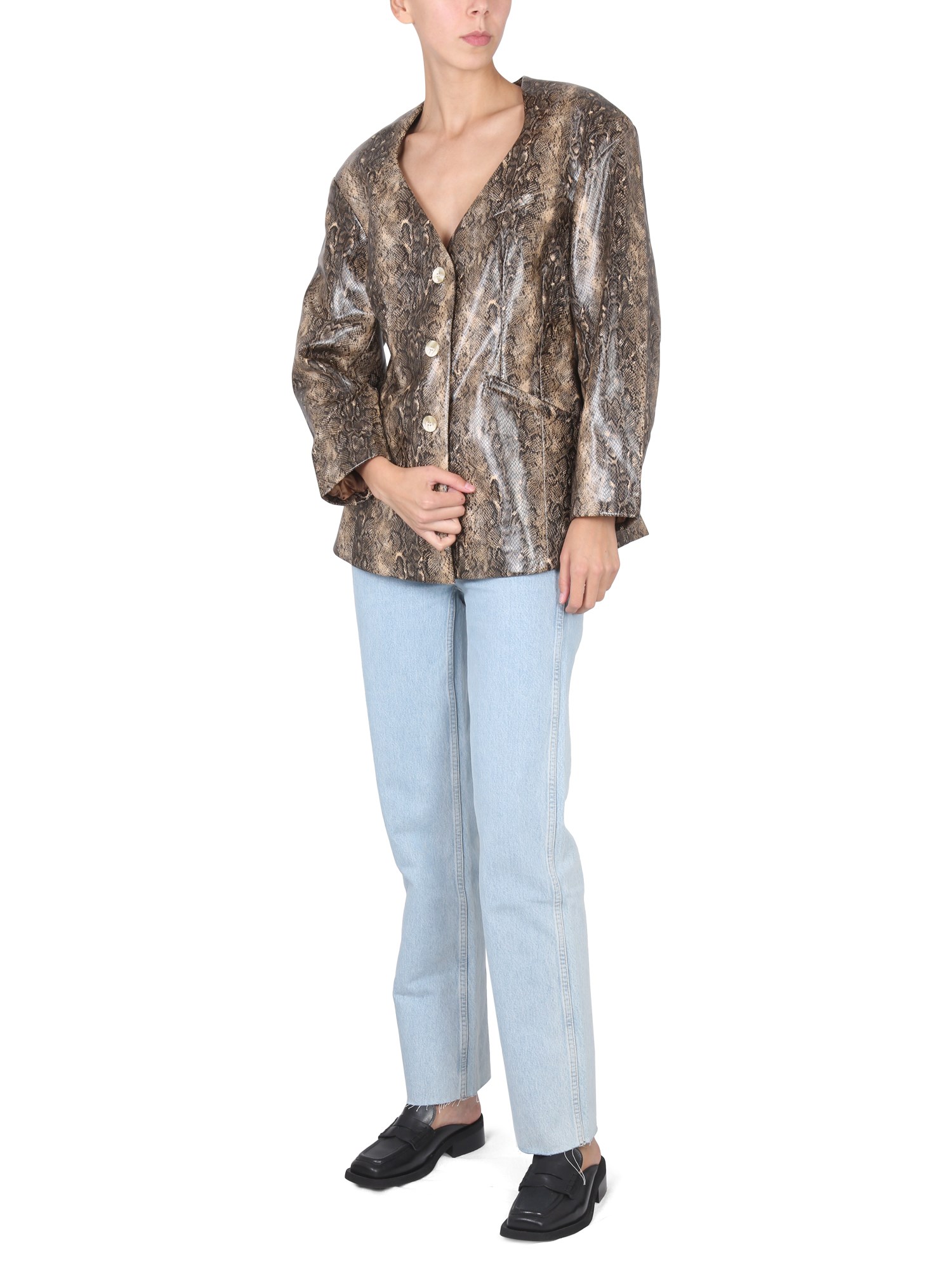 Snakeskin effect print jacket from Ganni is a versatile piece that will go with anything from jeans to dresses. This snakeskin print jacket is made of 100% polyester and has a front button closure. The V-neck is printed with a snakeskin pattern, and the sleeves are long enough to fit over your hands.