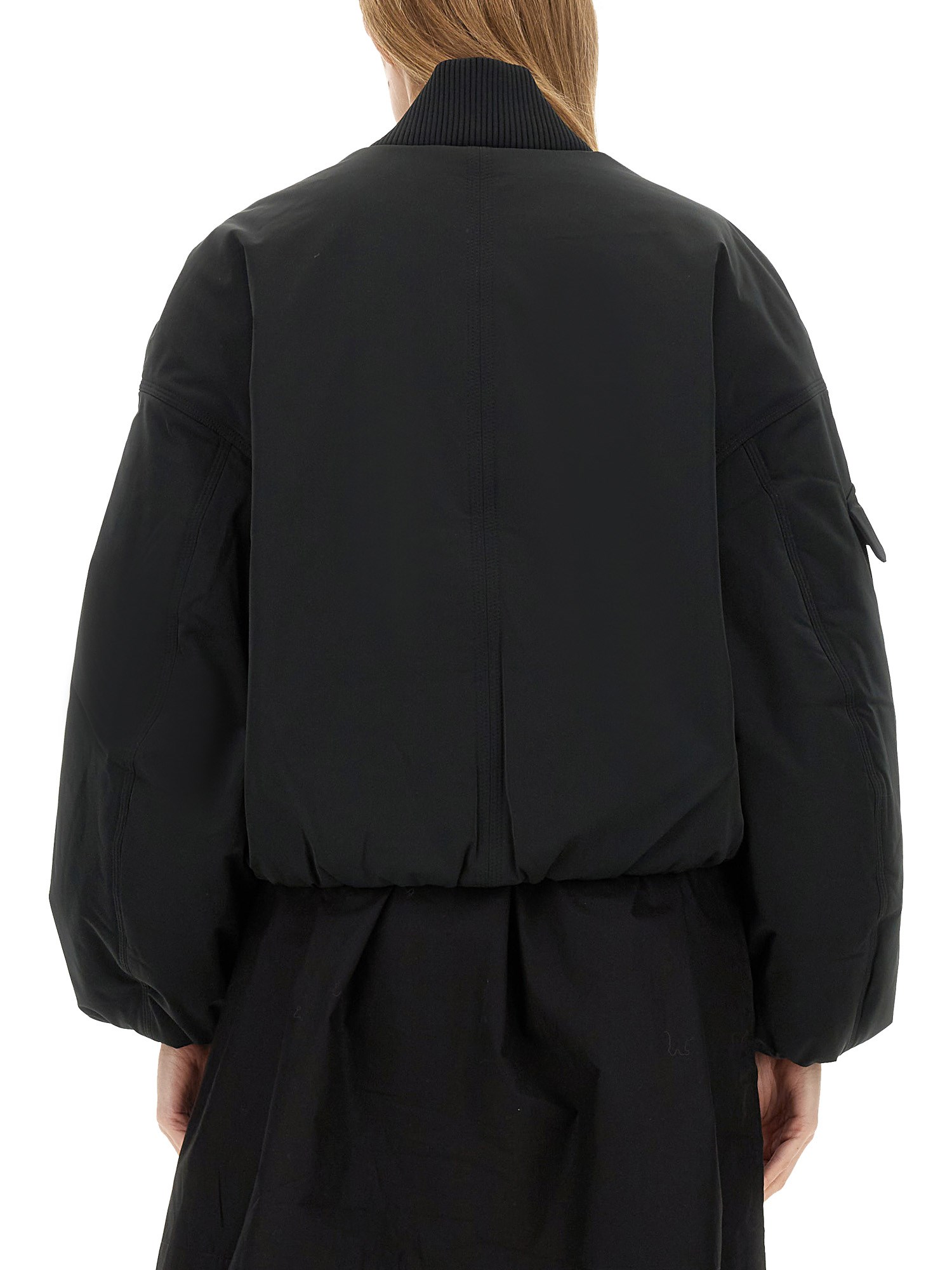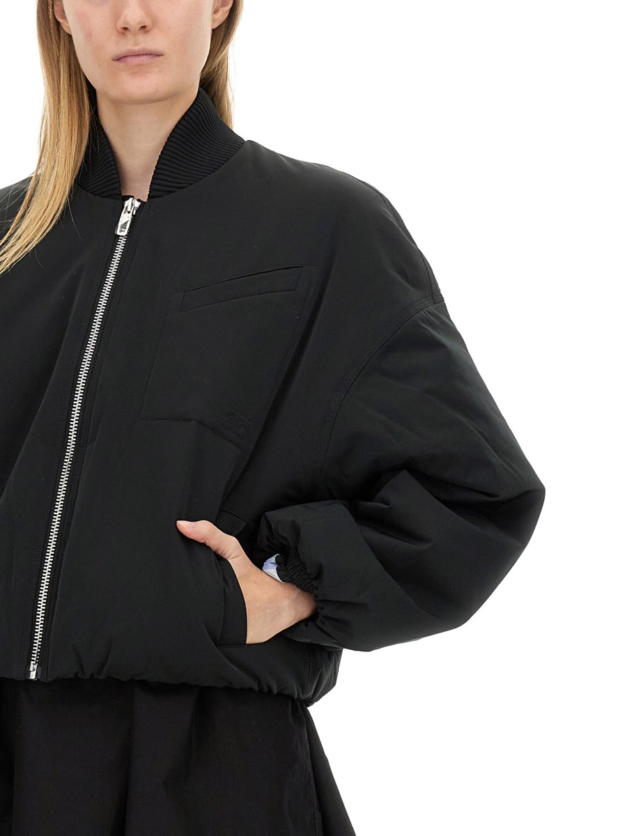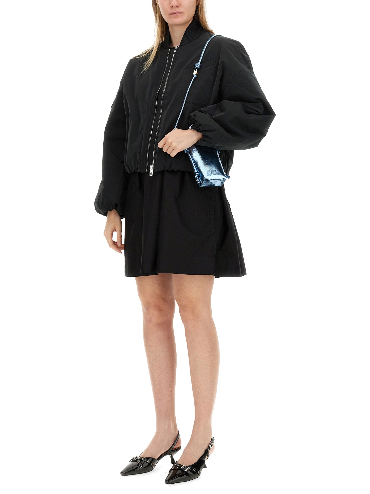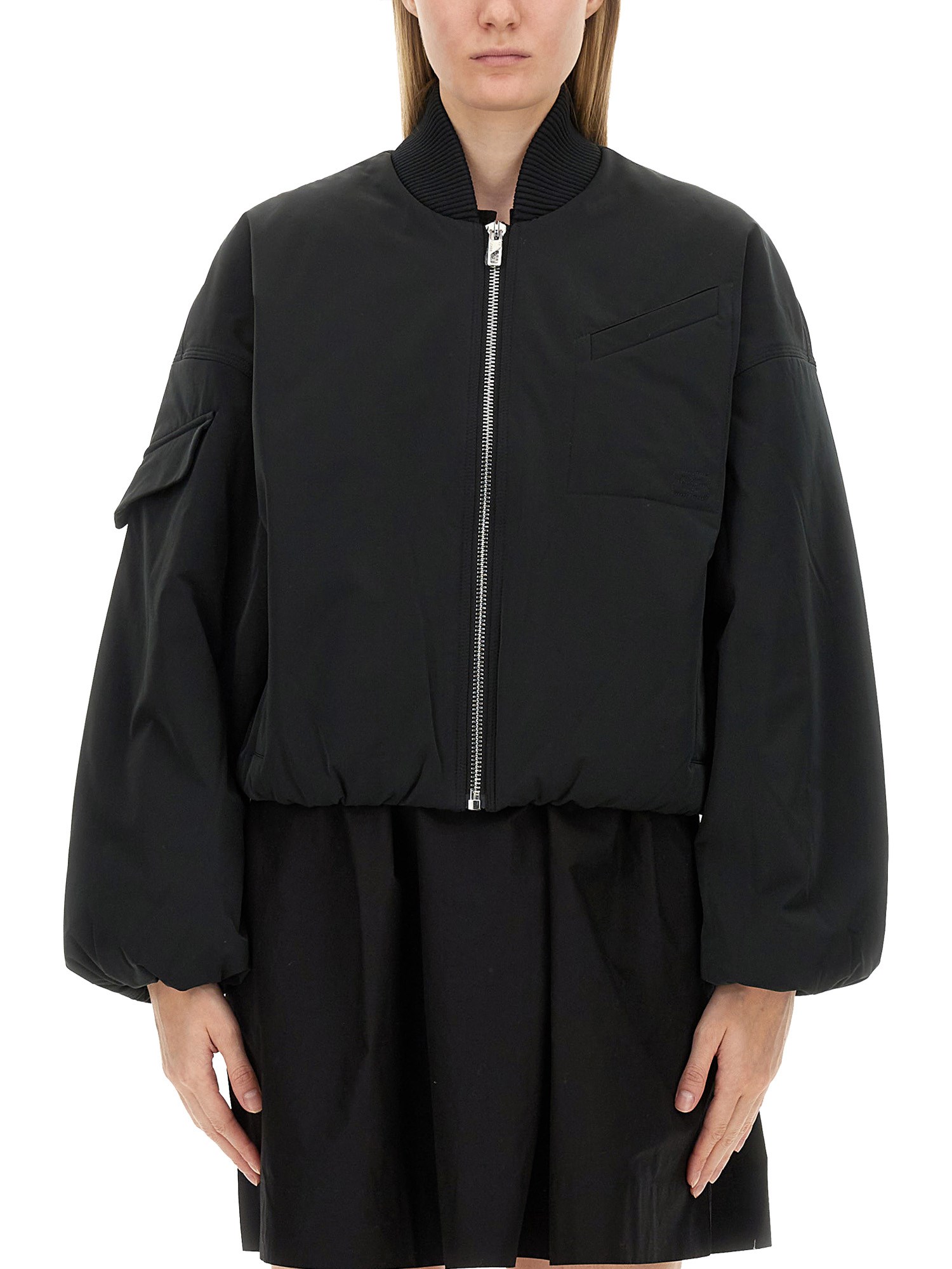 Look effortlessly cool in this Ganni Bomber Jacket! Made from polyester, this jacket features a stylish stand collar, long sleeves, and a zip front closure for easy wear. The straight hem adds a modern touch to this classic silhouette.