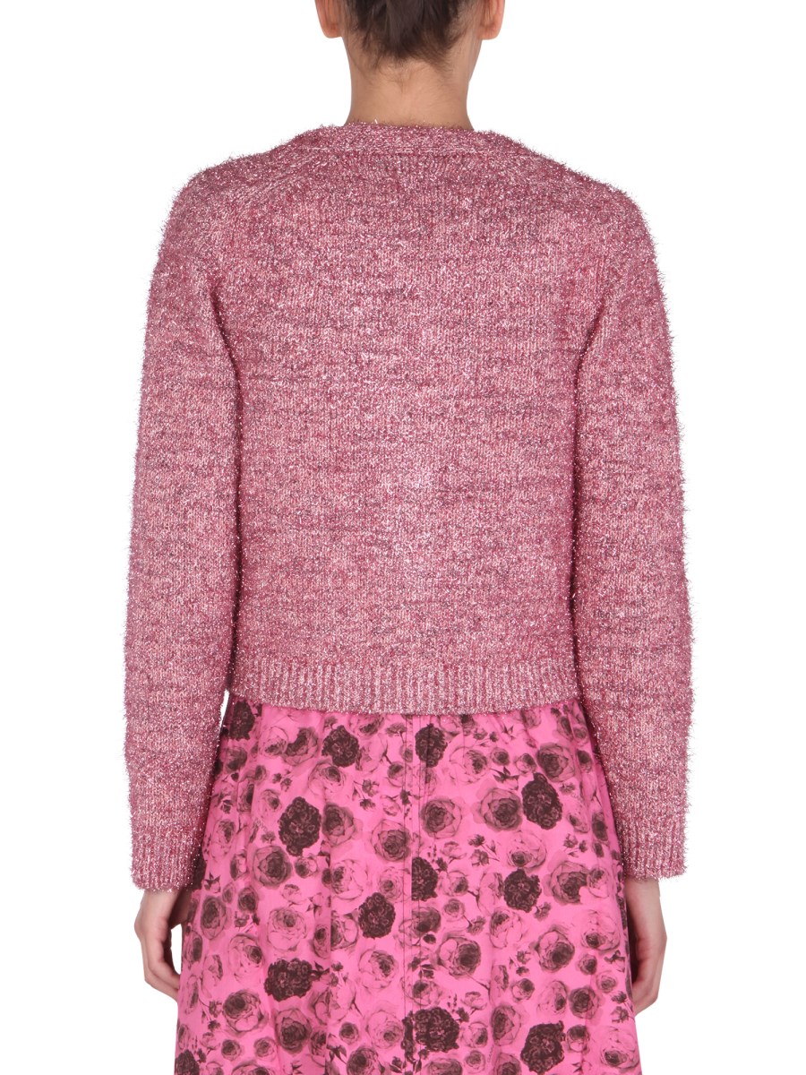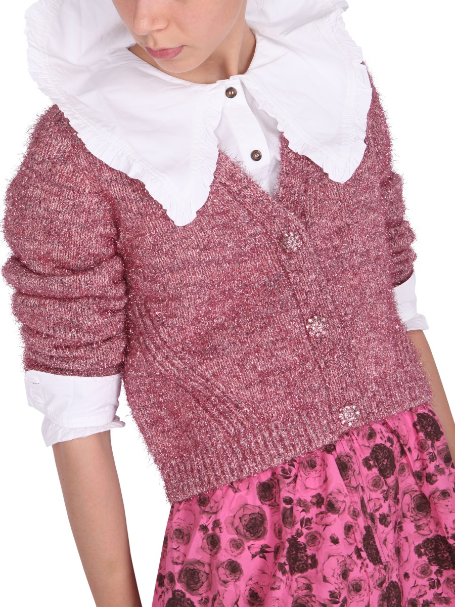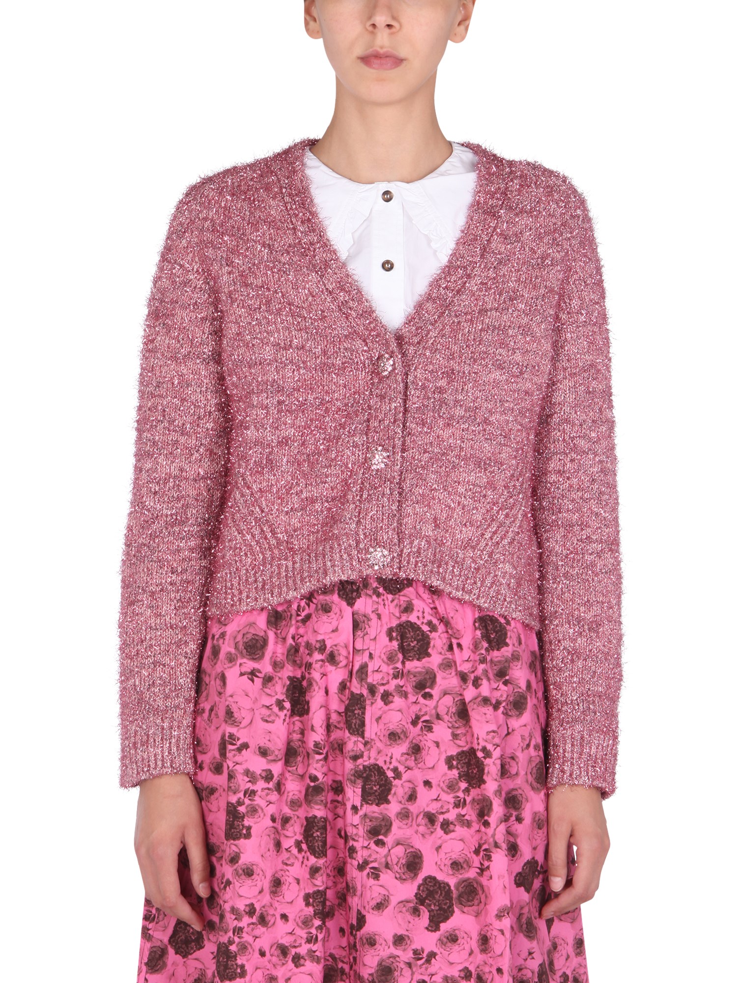 - V-NECK- FRONT JEWEL BUTTONS CLOSURE- REGULAR FIT- 26% COTTON, 19% METALLIC YARN, 12% VISCOSE, 6% POLYESTER- MADE IN ITALY- MODEL IS 180 CM TALL AND WEARS SIZE S