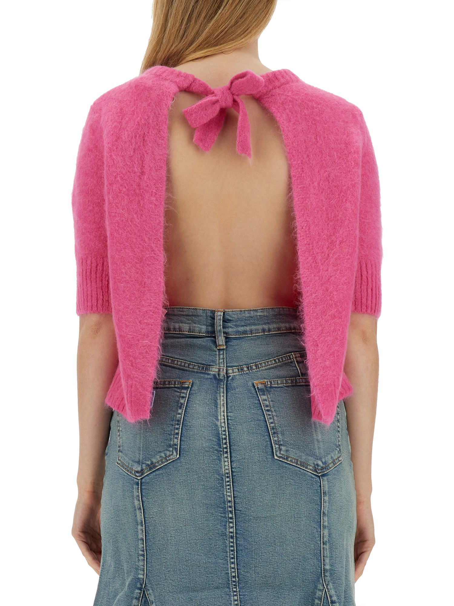 This trendy and chic top from Ganni is the perfect addition to your wardrobe. Made with a blend of alpaca and polyamide, it offers a luxurious and soft feel, making it incredibly comfortable to wear. Featuring a stylish crew neck design, this top is both elegant and versatile. The open back adds a touch of femininity and sophistication, while also allowing for breathability and freedom of movement.