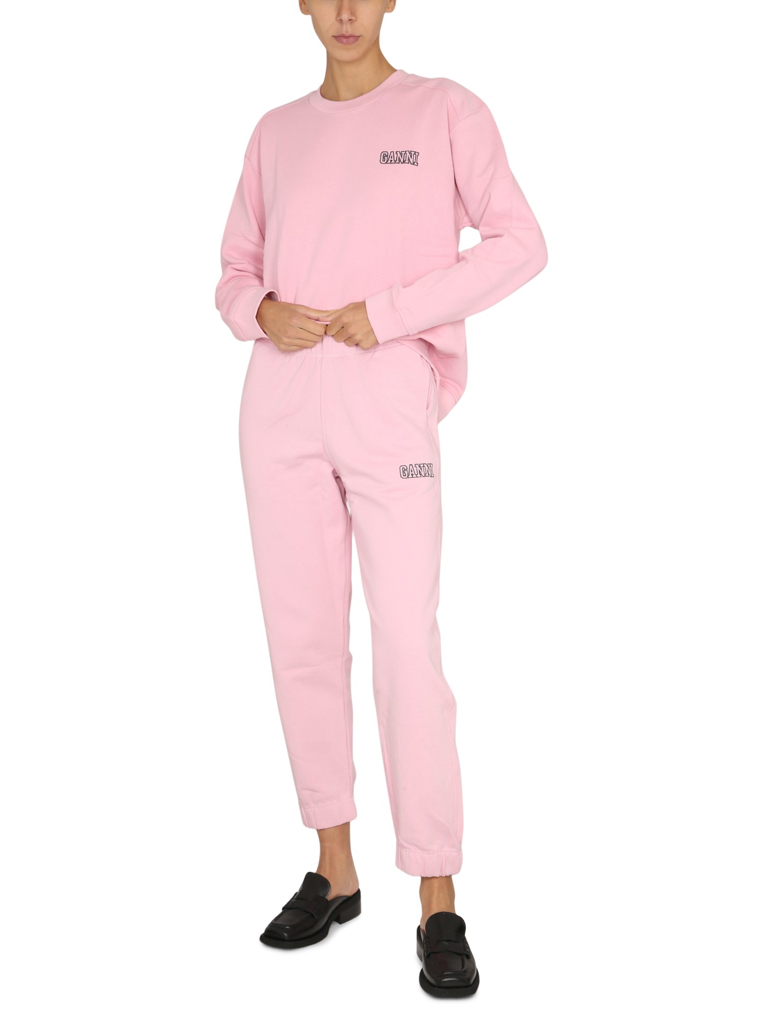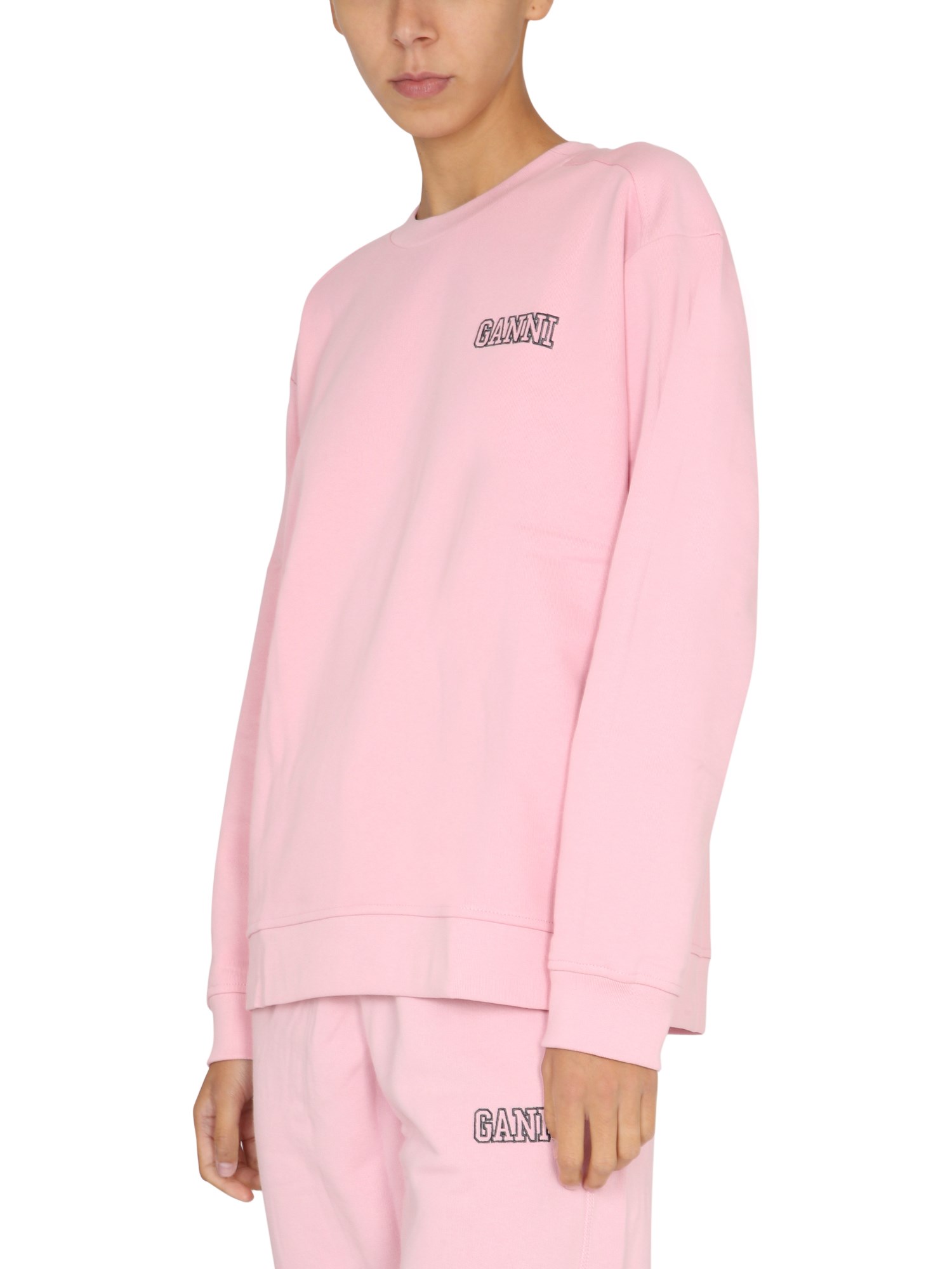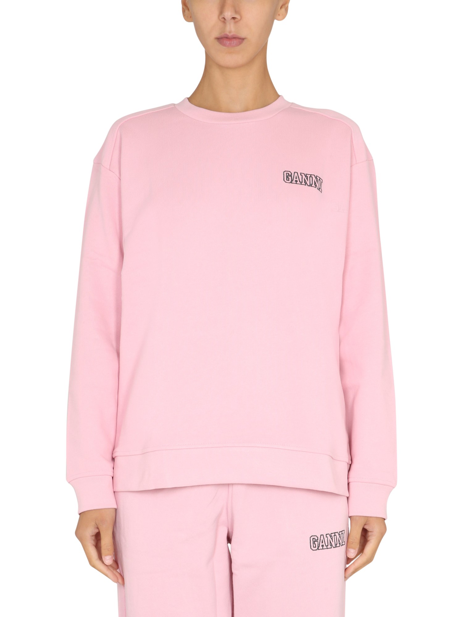 This cotton blend sweatshirt from Ganni features a front logo print and a crew neck. It has been designed to provide you with a comfortable, casual fit. Featuring a timeless design, this pink cotton blend sweatshirt is a great choice for the fashion-forward individual.