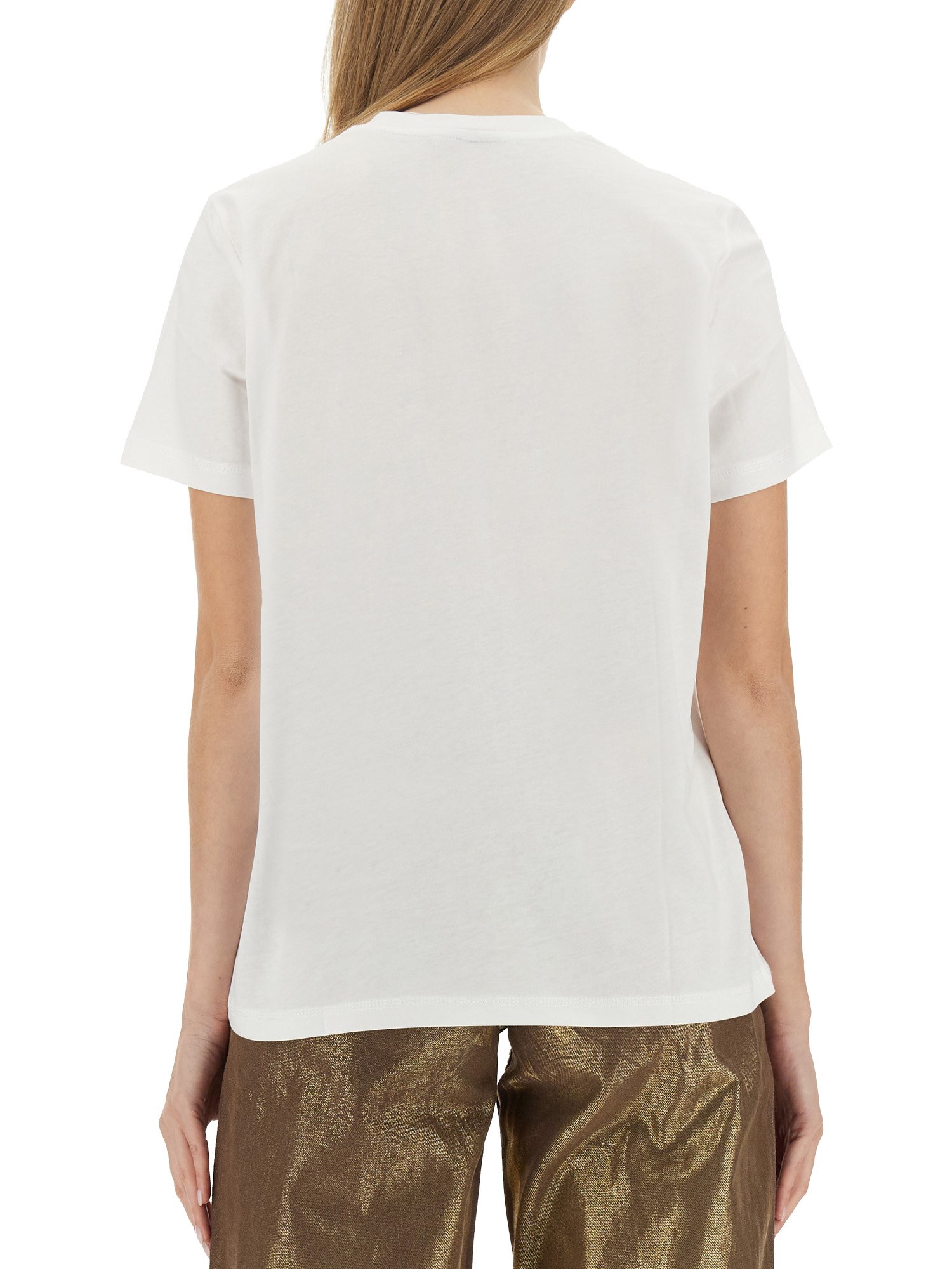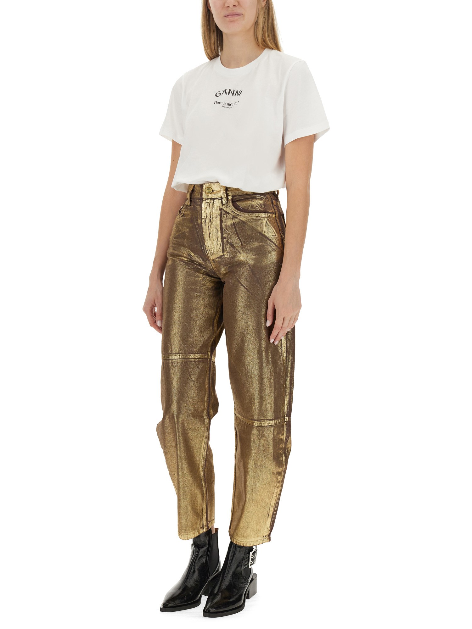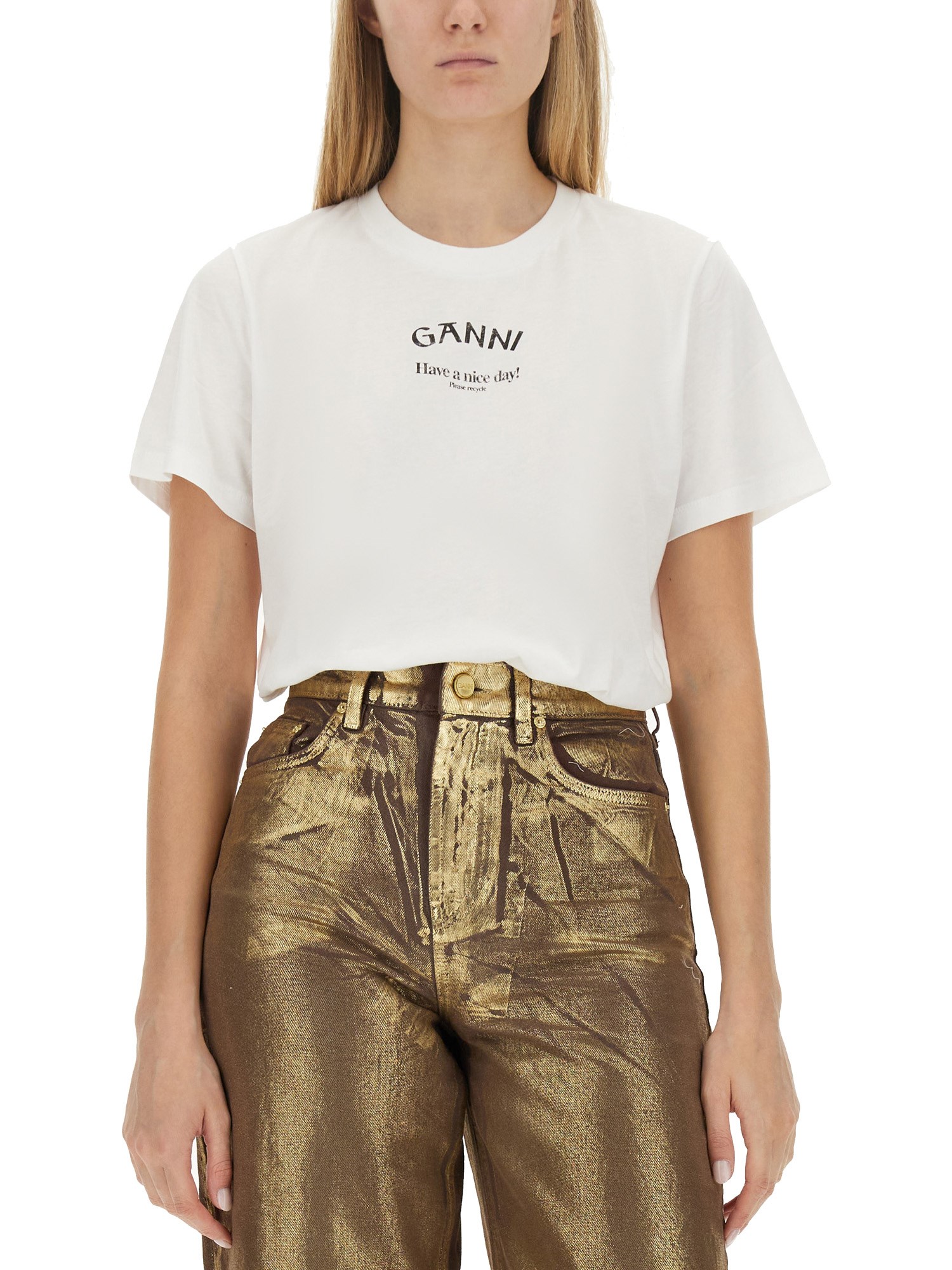 This Ganni logo T-shirt combines contemporary style with comfort, featuring a distinctive logo that embodies the brand's modern aesthetic. Crafted from high-quality materials, it offers a soft feel against the skin while ensuring durability. The versatile design makes it suitable for various occasions, whether paired with jeans for a casual look or dressed up with a skirt. Elevate your wardrobe with this essential piece that reflects both fashion-forward thinking and effortless elegance.