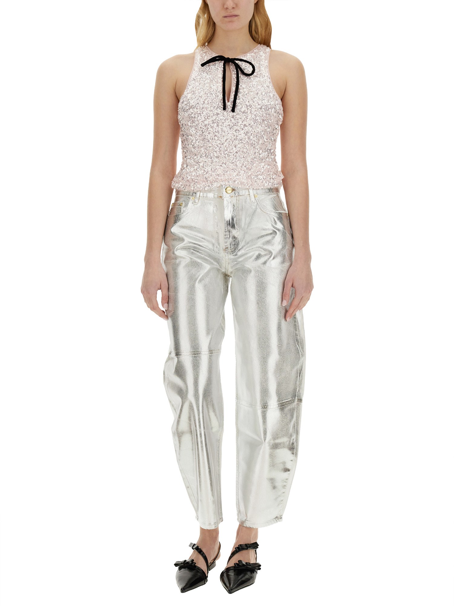 This exquisite top from Ganni is the perfect addition to your wardrobe, adding a touch of glamour and style to any outfit. Crafted with meticulous attention to detail, this top features a front halter neckline that beautifully frames the shoulders and highlights the collarbone. The sleeveless design ensures freedom of movement, making it an ideal choice for both casual and formal occasions. The eye-catching bow closure at the back adds a feminine and elegant touch, creating a sophisticated look.