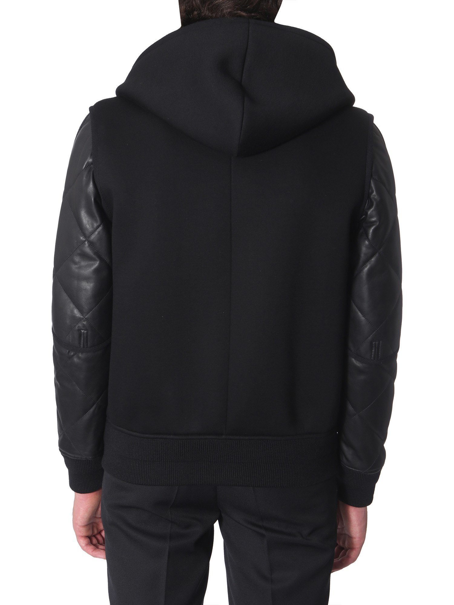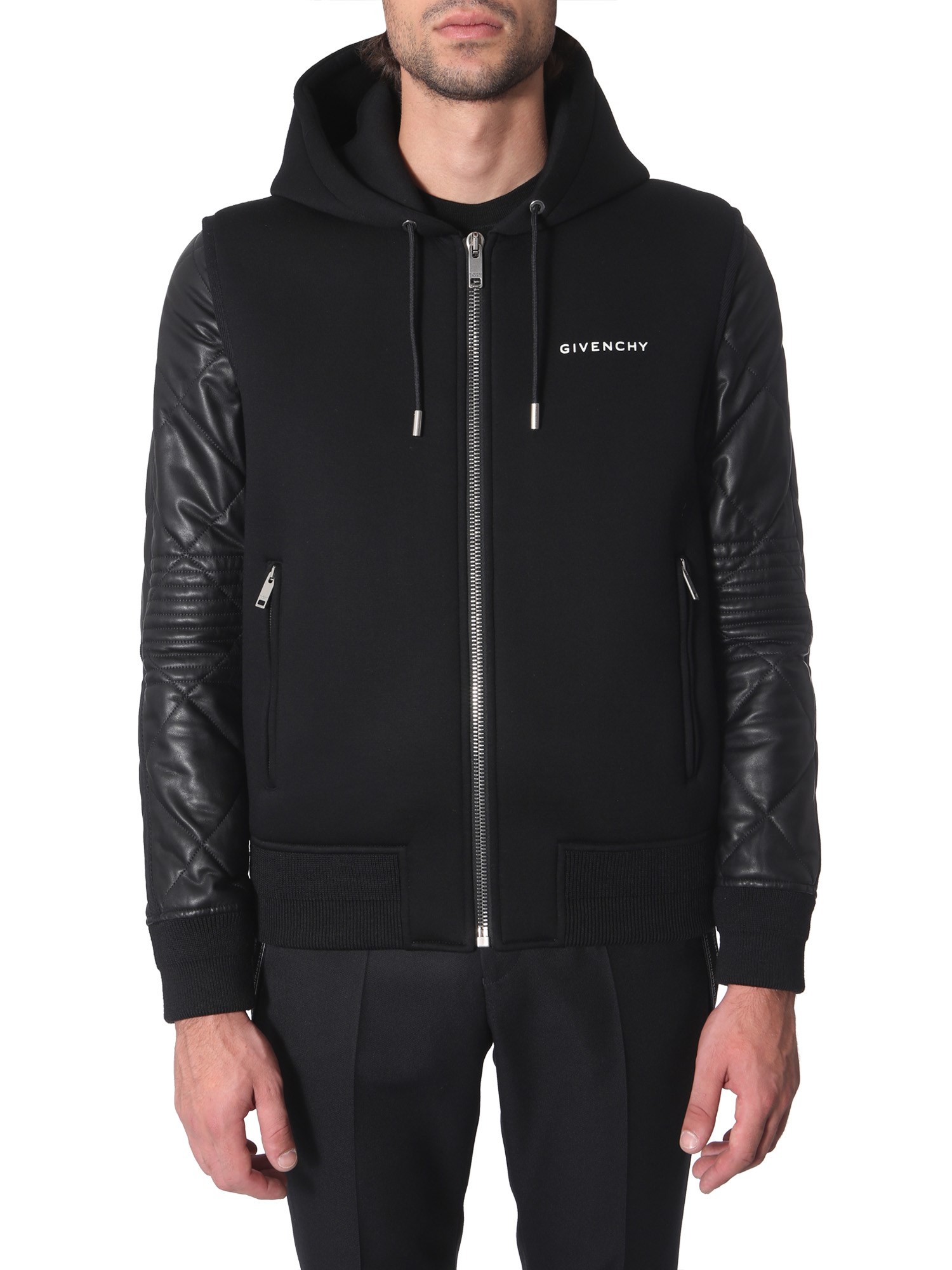 Embrace the on-going winter trend with this hooded jacket from the house of Givenchy. The iconic combination of lambskin leather and viscose feels soft while keeping you warm. Designed with quilted leather sleeves and logo detailing on the chest, this jacket suits your edgy vibe. You can pair it with black denim jeans and leather boots while getting ready for a night out with friends.