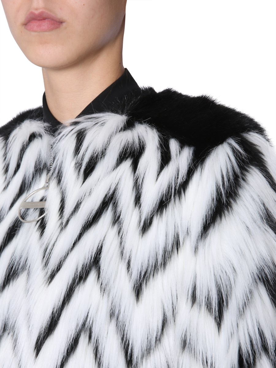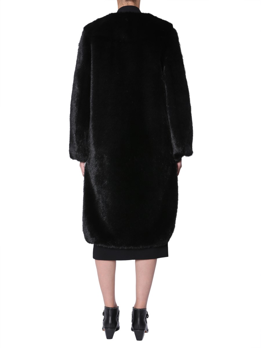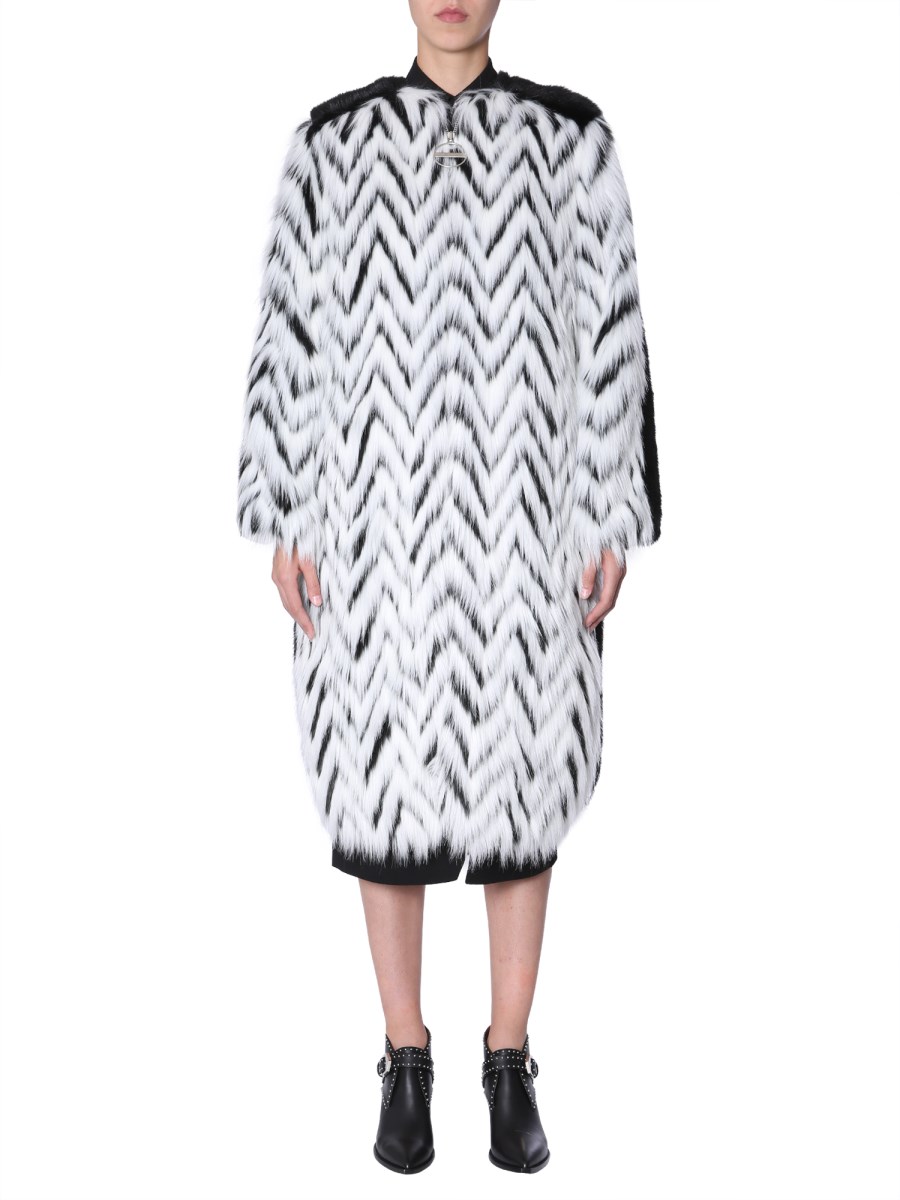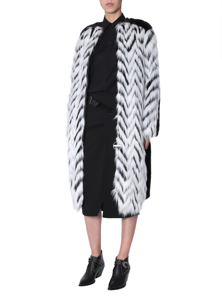 Givenchy’s faux fur long coat is a luxurious, eco-friendly take on fashion. Its timeless fur design is embellished with unexpected details of belt, chevron motif, and round collar. The coat can be worn as a dress with ankle boots. The silk lining not only makes the coat’s appeal much graceful, but also offers a comfortable soft touch.