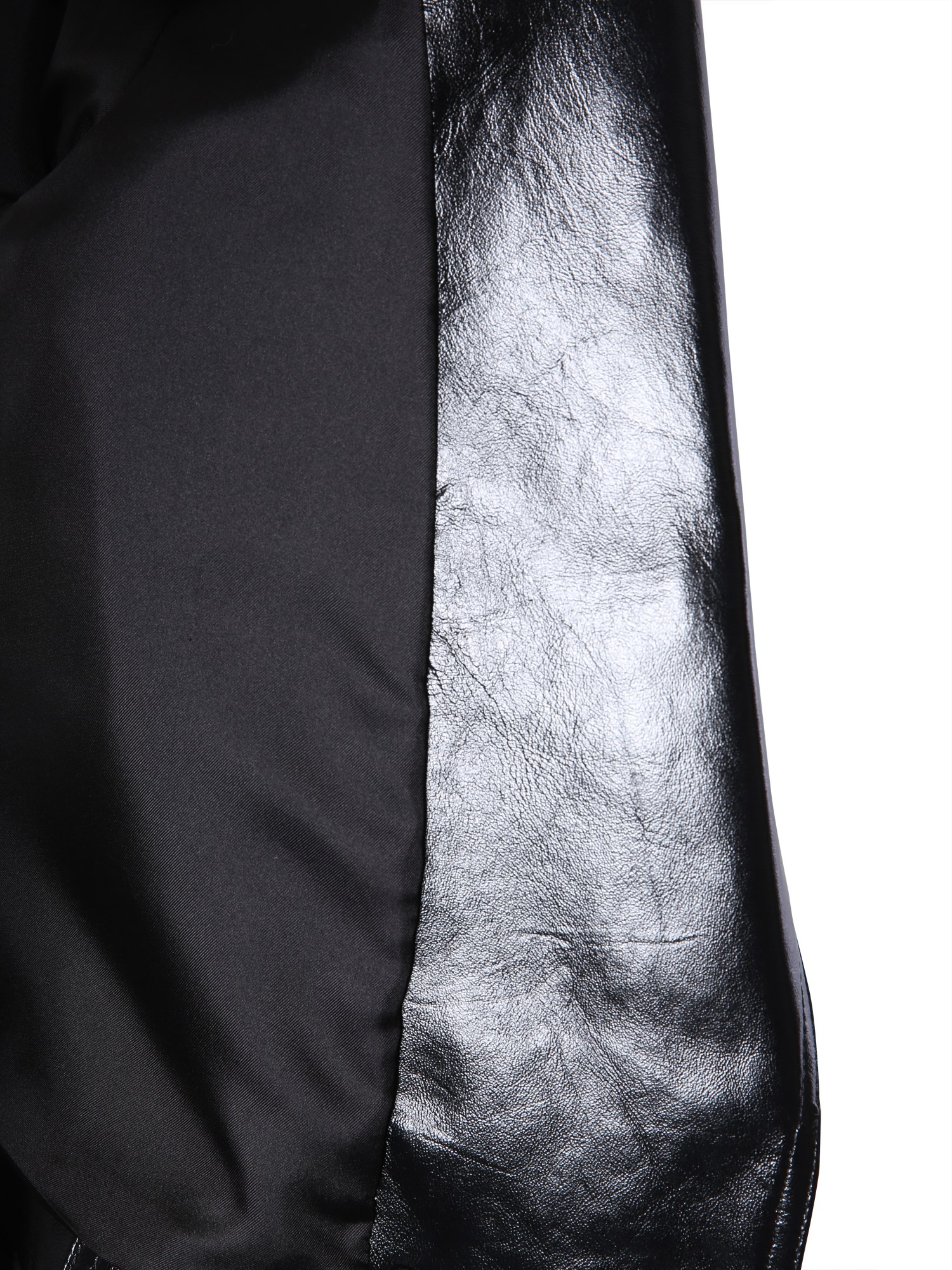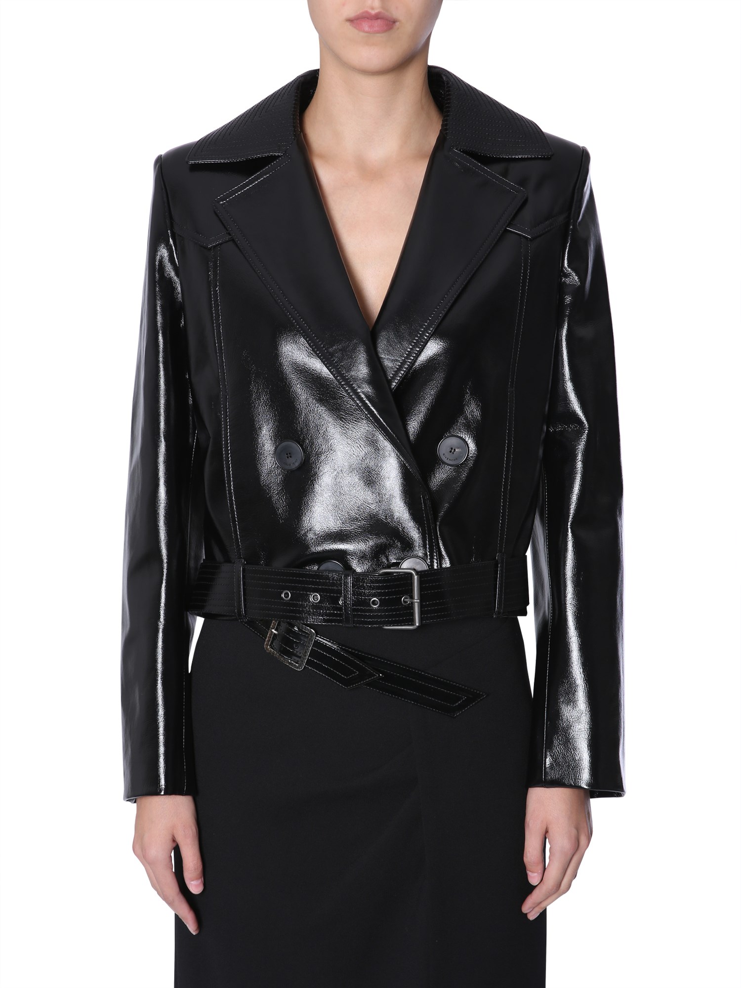 This Givenchy leather jacket is made from a luxurious fabric of leather with silk lining. Featuring notched lapels and double-breasted buttoned closure, this jacket has a classy appeal that looks even more prepossessing when teamed with metal boot shoes. The dress can be styled with the help of the removable and adjustable waist belt.