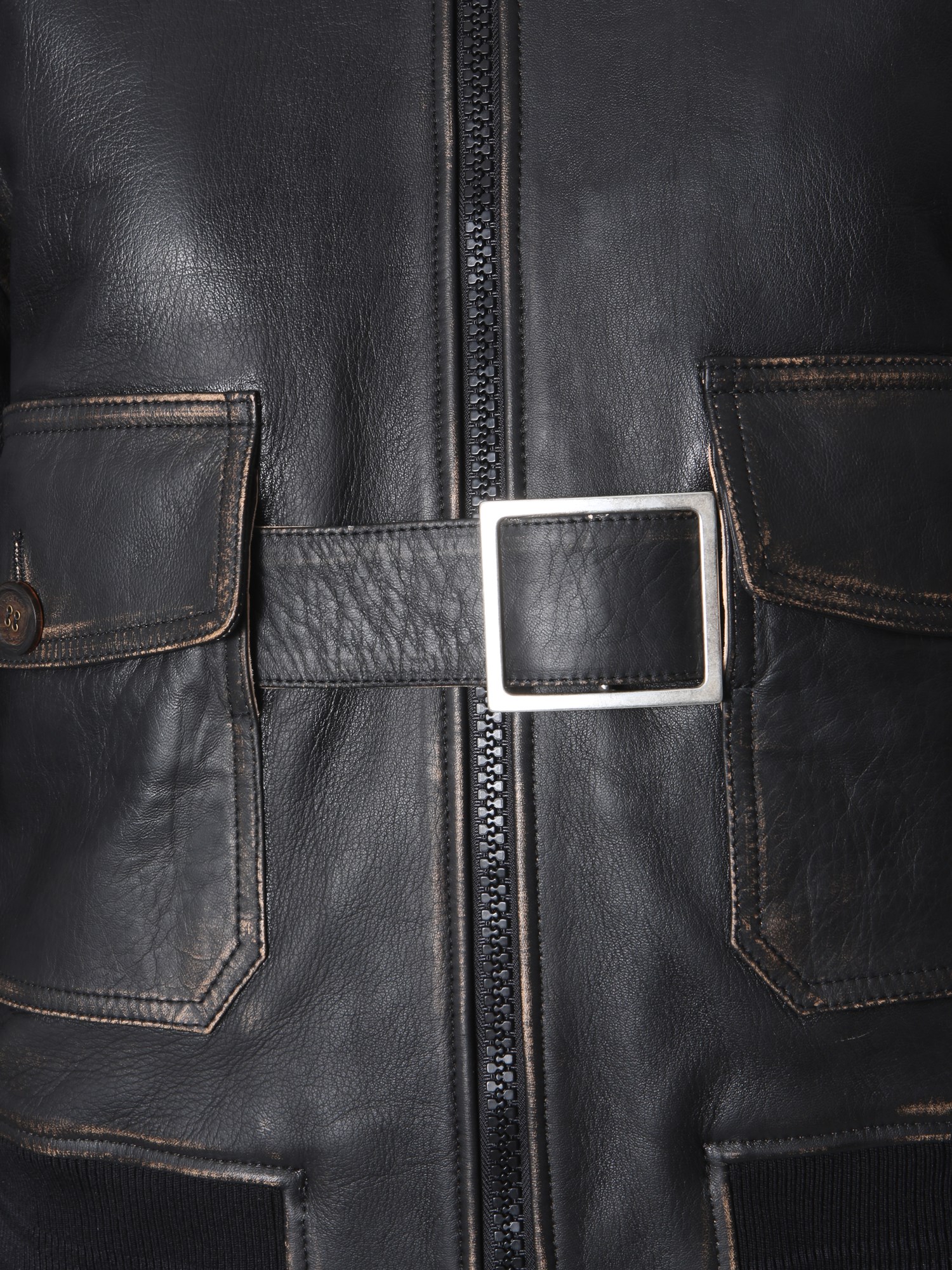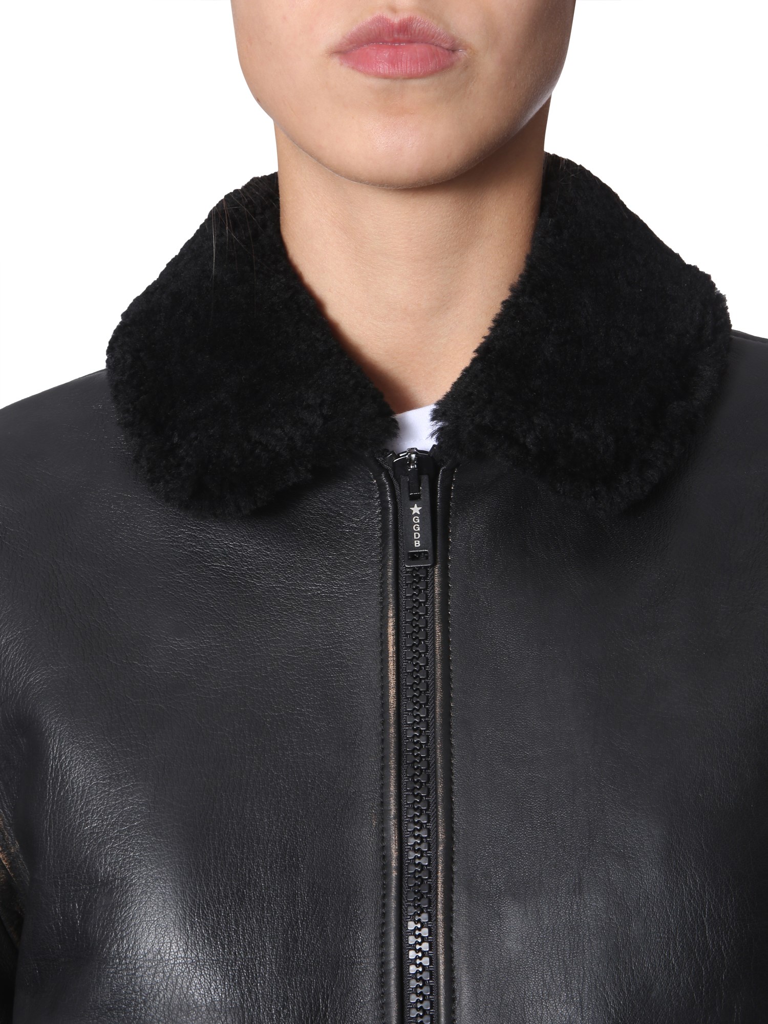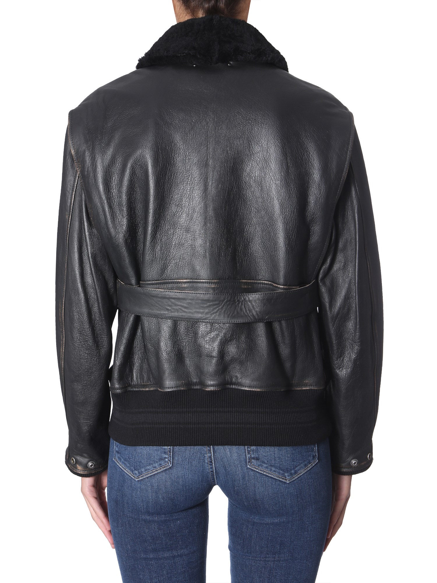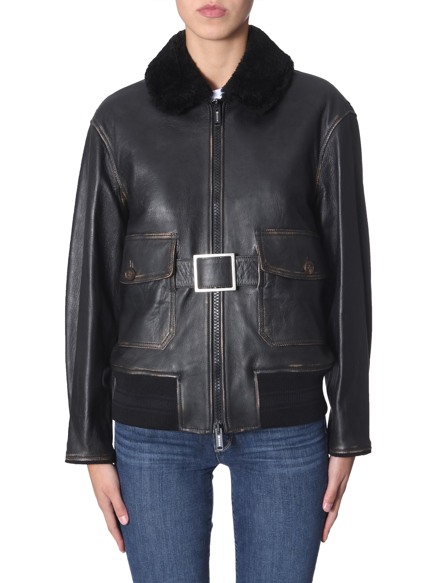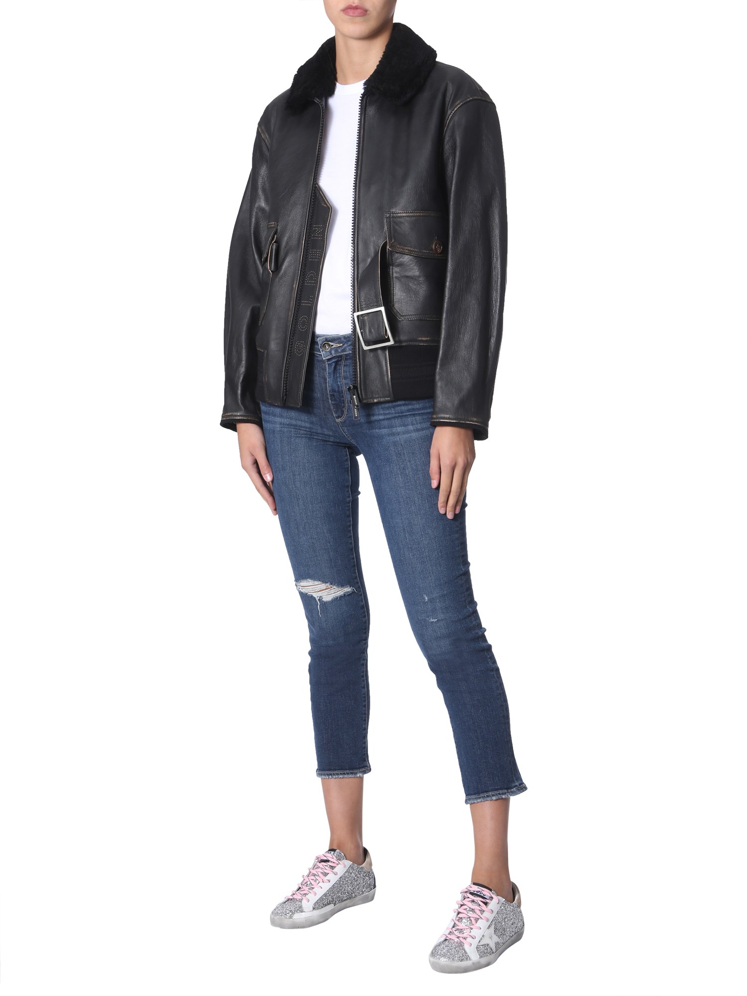 If you keep a love for wearing leather jackets then get this Erika jacket from Golden Goose Deluxe Brand. It has a zip closure at the front, elasticated bottom and a furred collar neck. The side pockets are secured with a button closure, and are given in a distressed look. Also, the belt on the waist is the main attraction of this jacket.