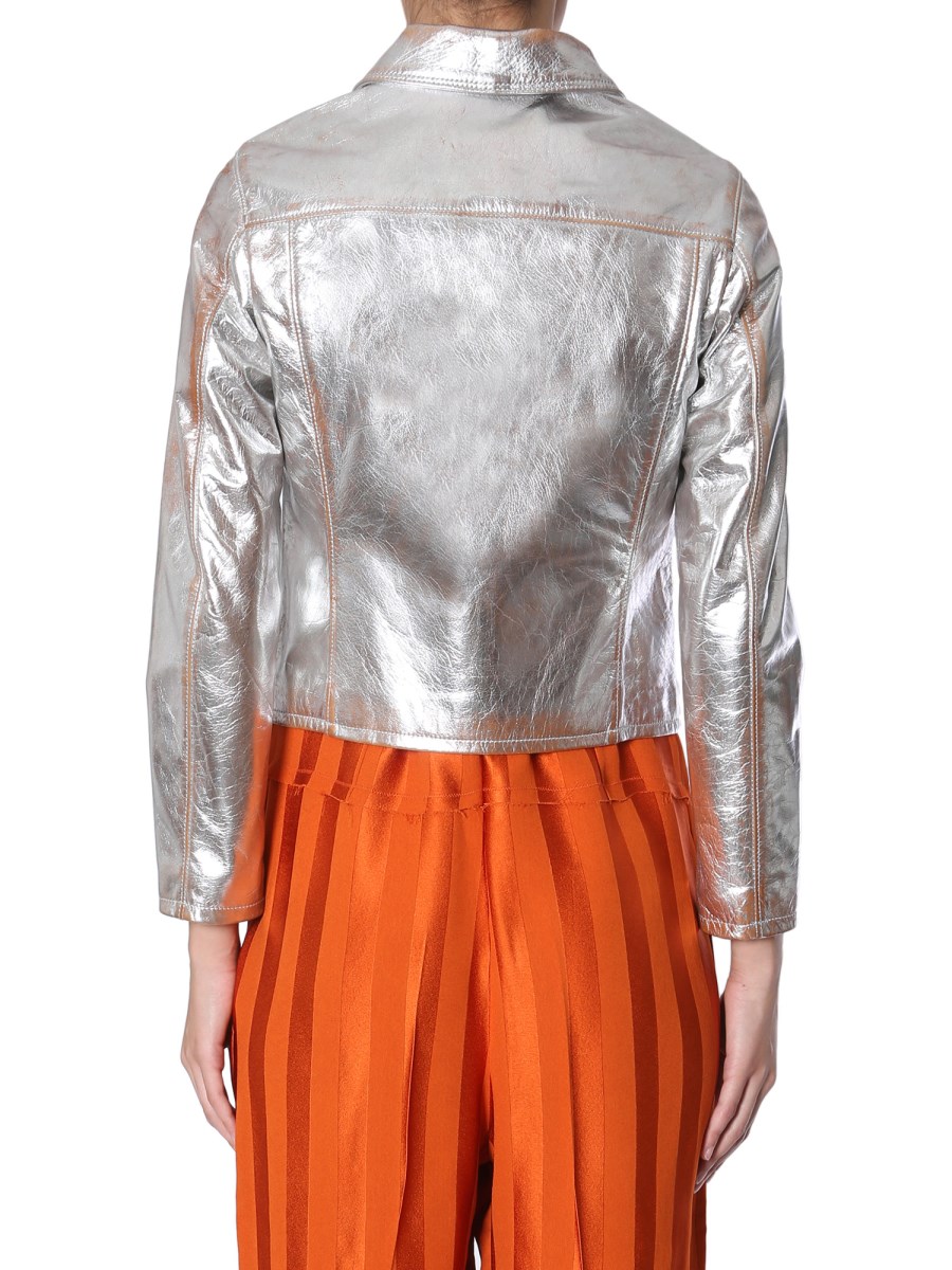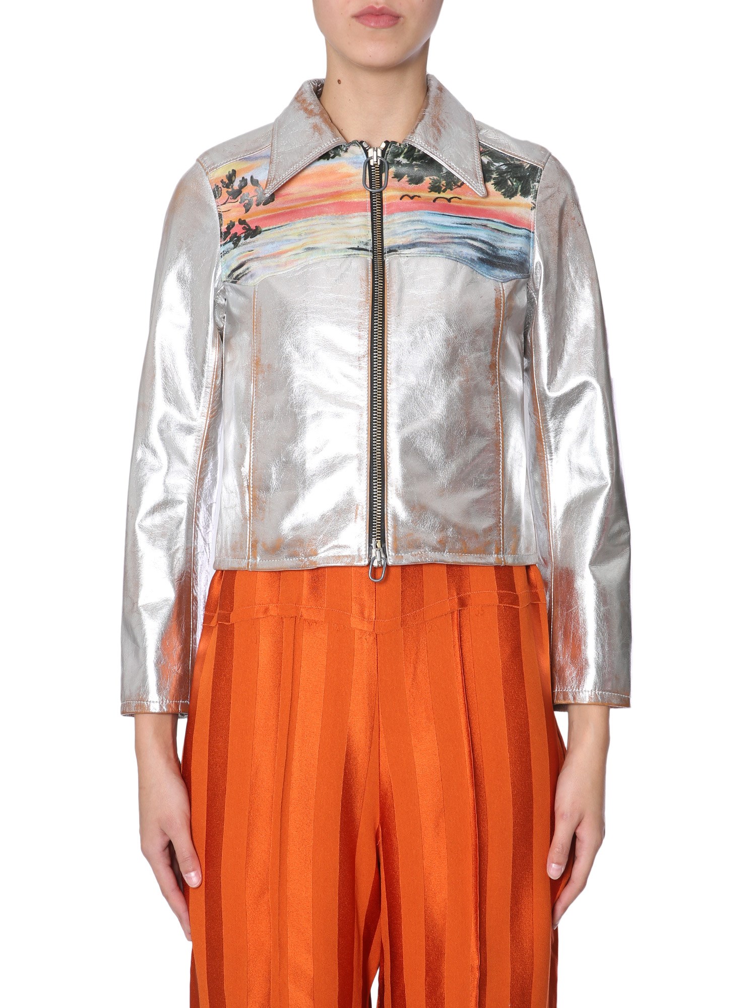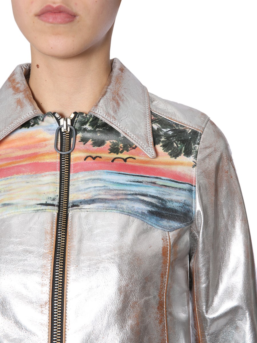 Flaunt your colourful personality with the Mira leather jacket. Made of 100% bovine leather, the jacket has a printed front panel with a double-zipper front closure seamlessly blended to the pointed collar. This jacket has long sleeves, two side pockets, and a lined inside for both comfort and style.
