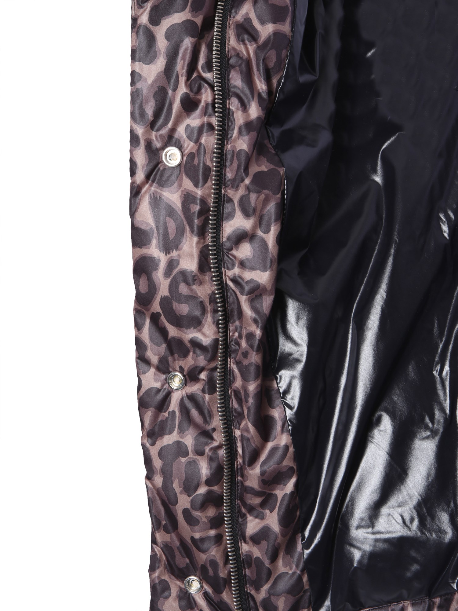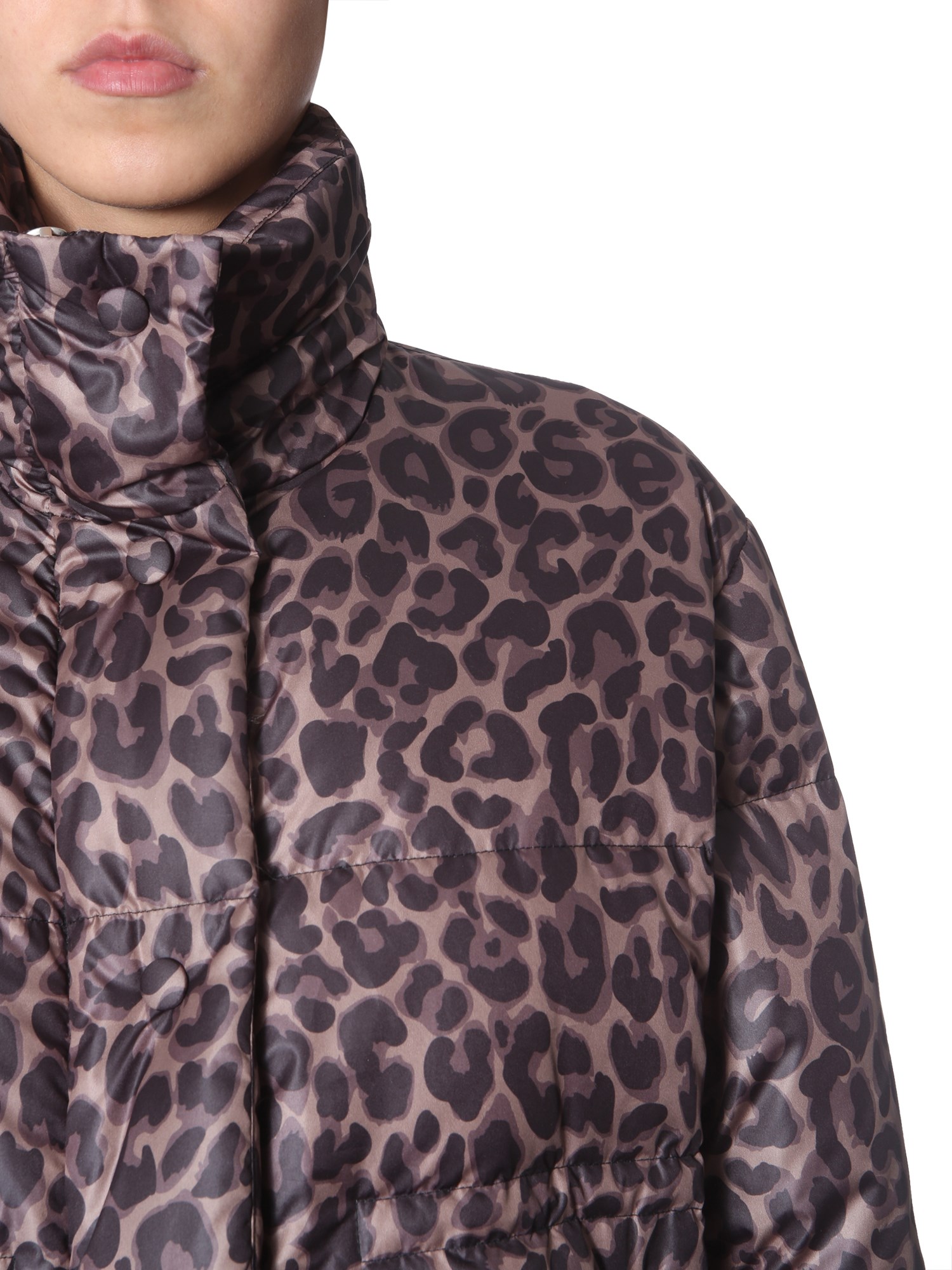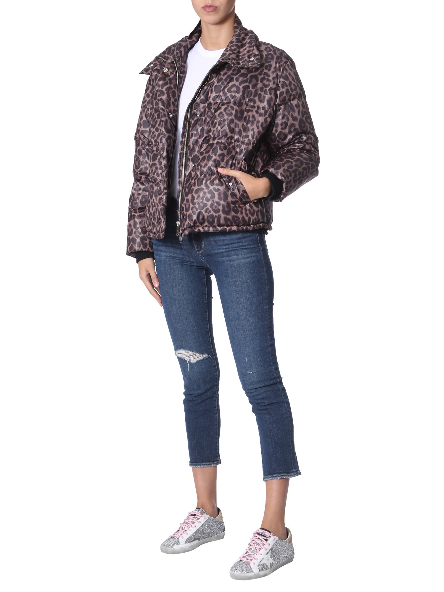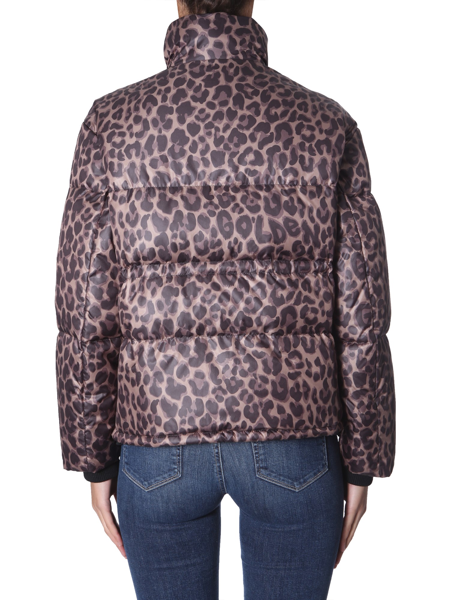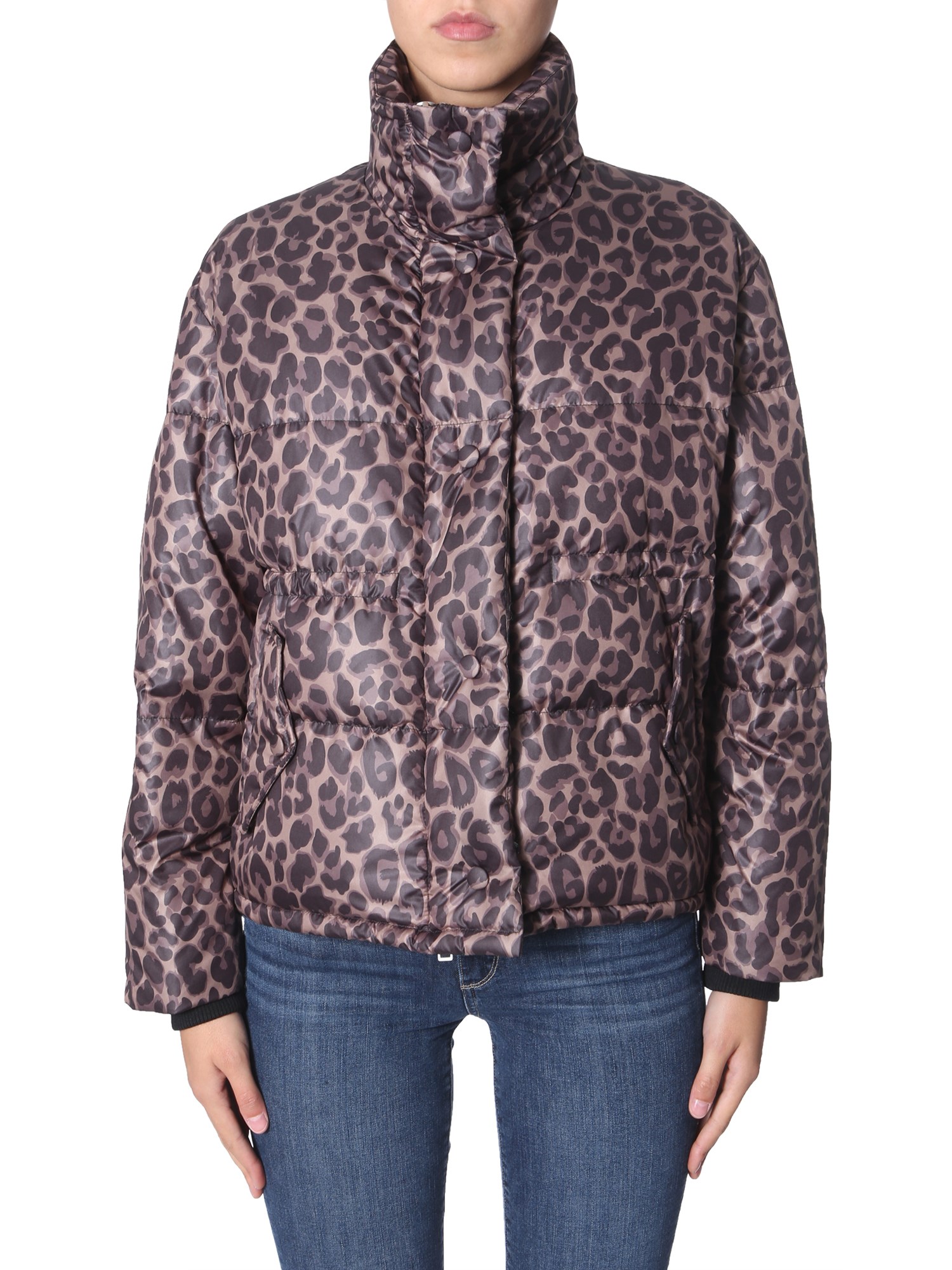 Style and quality go hand in hand with this "yuri" down jacket from Golden Goose Deluxe Brand. The polyester surface has an all over leopard print for a fashionable look. The goose feather stuffing ensures utmost warmth and cosiness. It has front zip closure and two side pockets with flap and button to warm your hands or carry things.