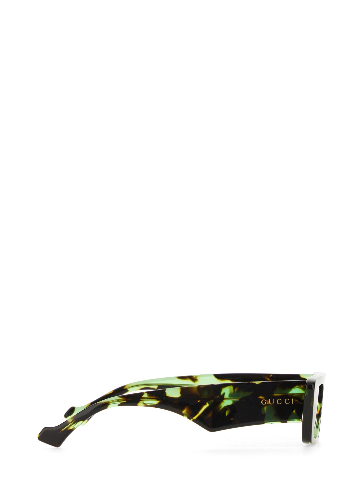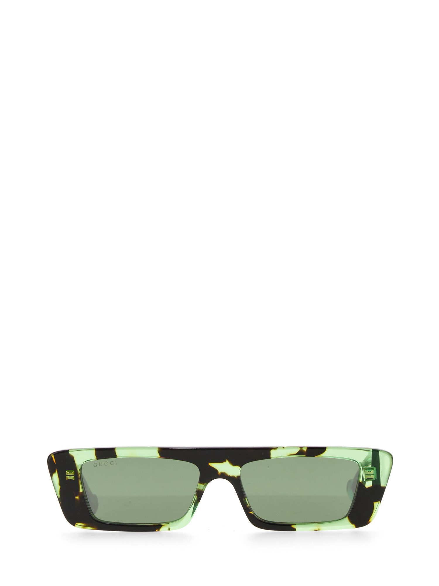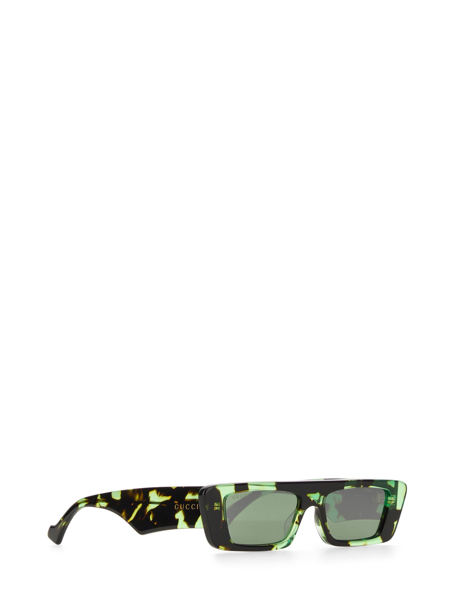 For the Pre-Fall 2023, narrow rectangular frames add a charm to a selection of sunglasses. The signature engraved Gucci letting decorates the temples, completing the silhouette with an archival code. A green and silver mirror lens completes the shiny green transparent tortoiseshell acetate frame.