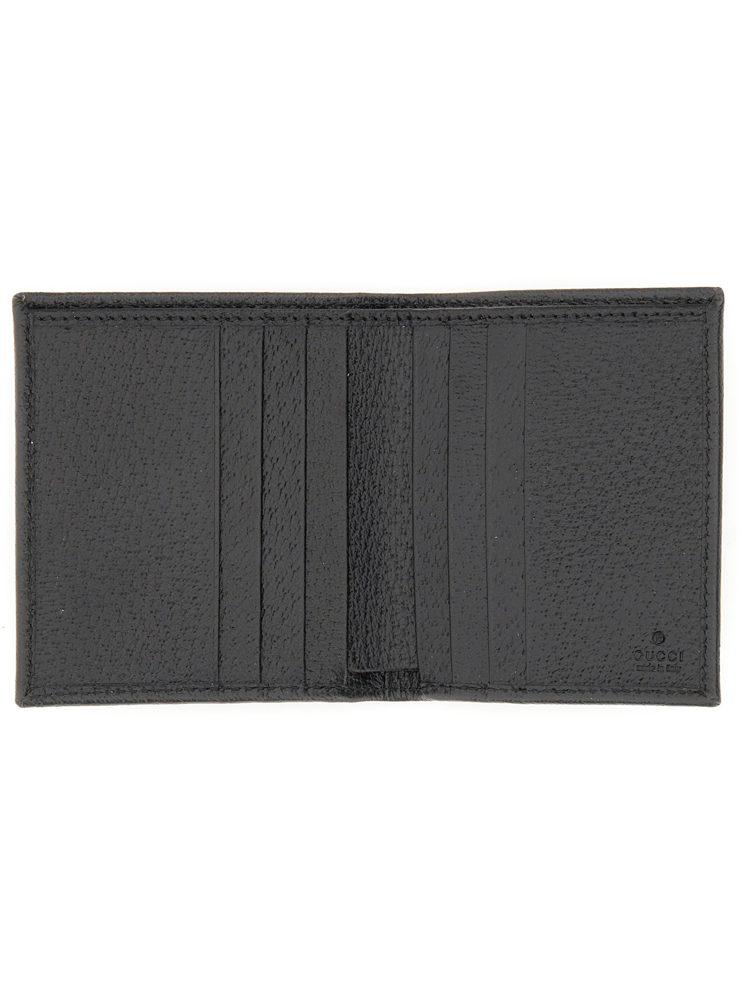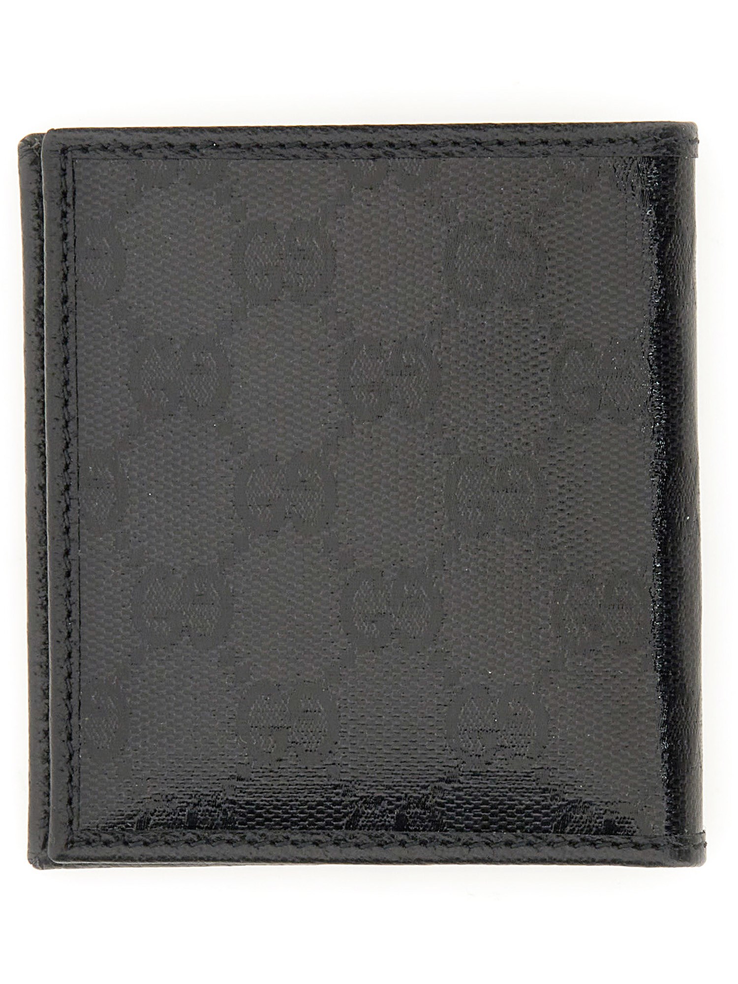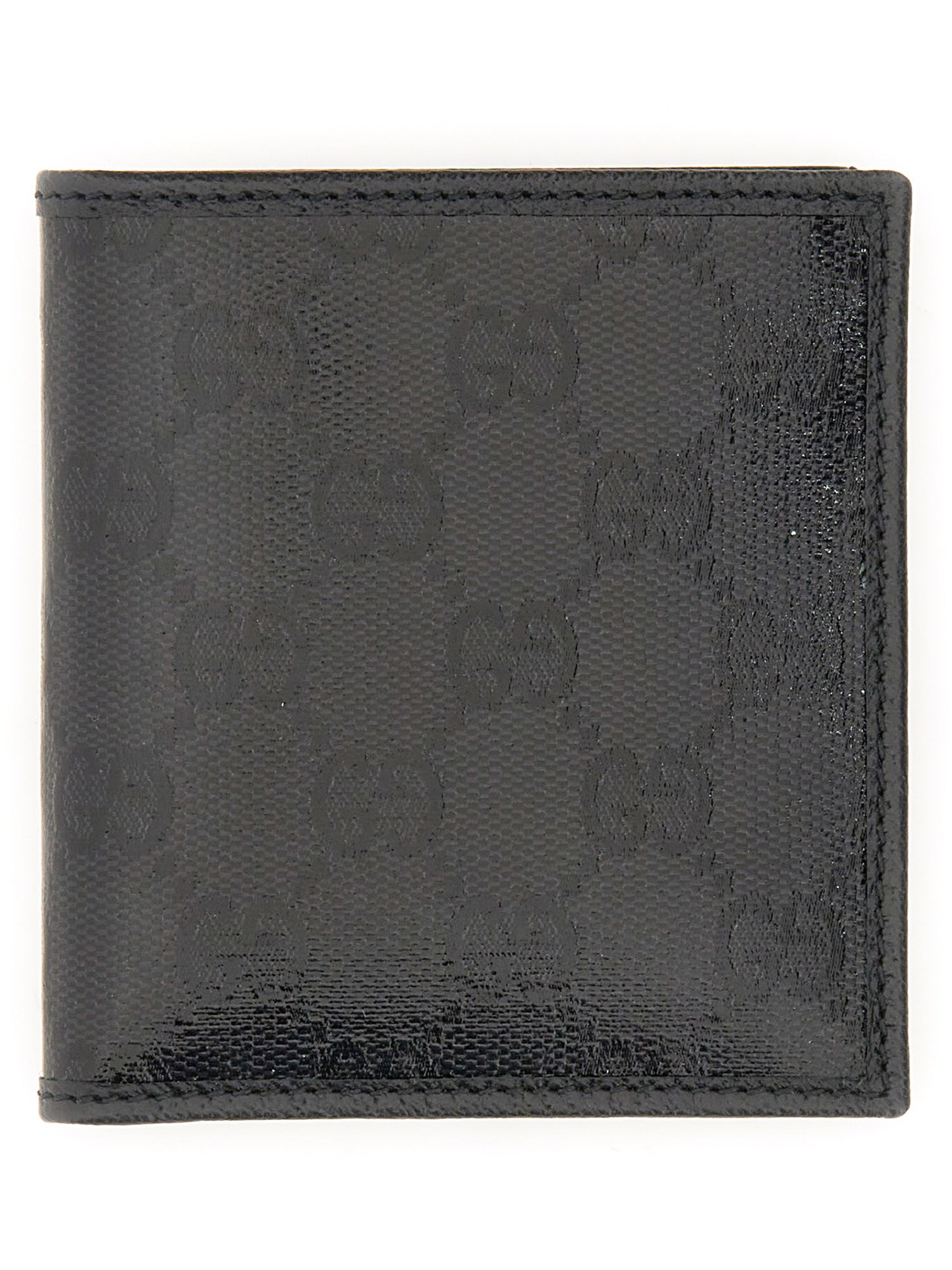The GG Crystal canvas, with its lustrous surface and durable characteristics, lends itself well to the men's Fall Winter 2023 accessories line, adding a modern feel to established House designs. New shapes with everyday functionalities exemplify Gucci's modern vision while staying true to a traditional aesthetic. This bi-fold wallet is crafted from black GG Crystal canvas.