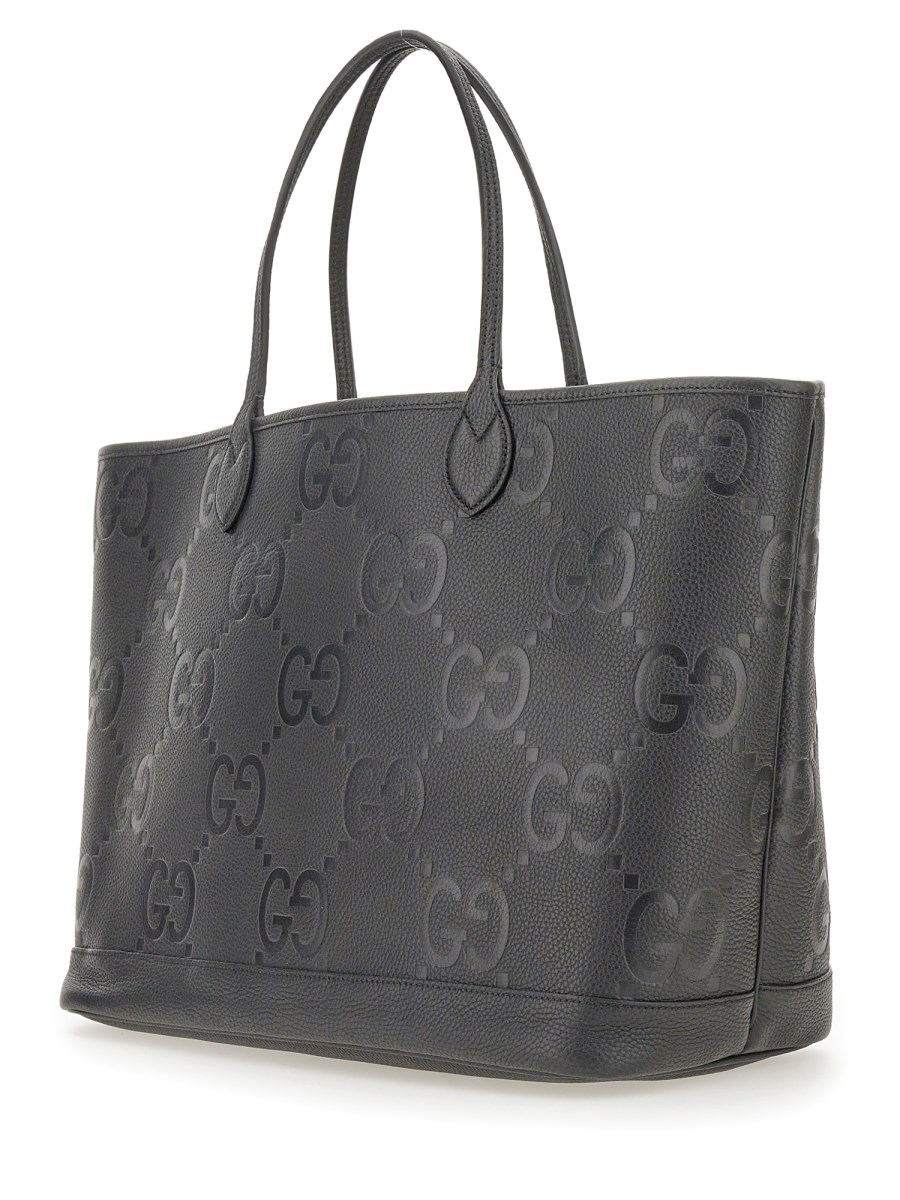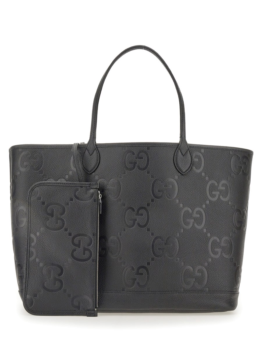 The all-black jumbo GG design returns for Pre-Fall 2023 atop a selection of leather pieces. A reinterpretation of Guccio Gucci's initials, the motif is an evergreen of the House that appears prominently in maxi size for an eye-catching logo feel. The signature motif decorates this large tote bag.