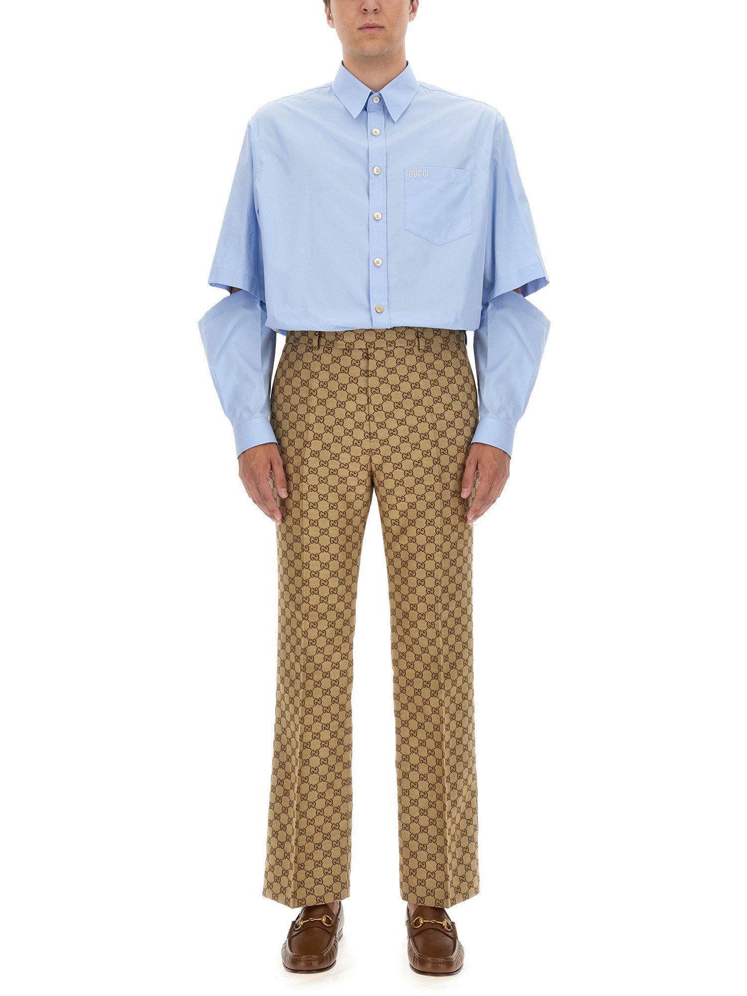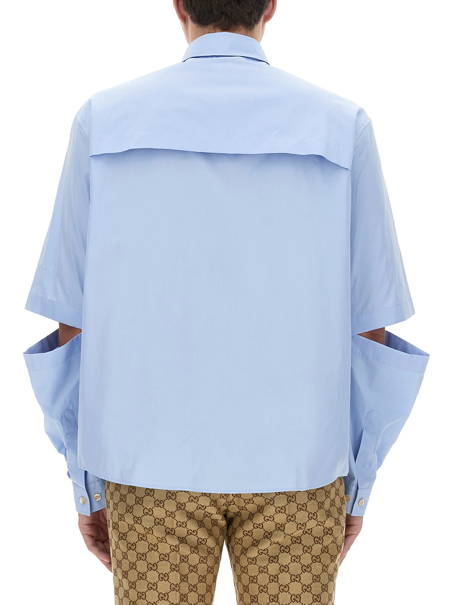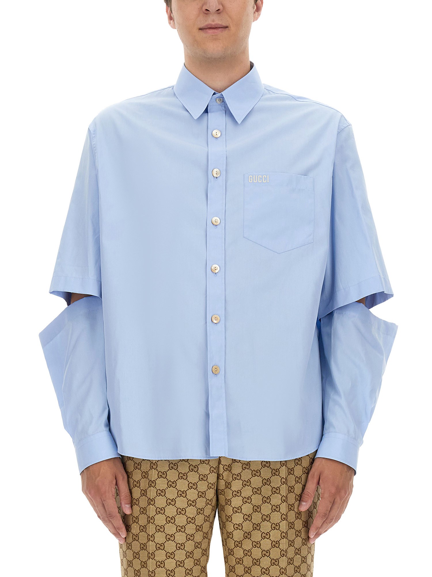 The most iconic motifs of the House are reinterpreted in the shape of subtle details throughout the collection. Crafted from cotton poplin, this shirt features a Gucci embroidery and can be transformed into a short-sleeved piece thanks to the detachable sleeves.