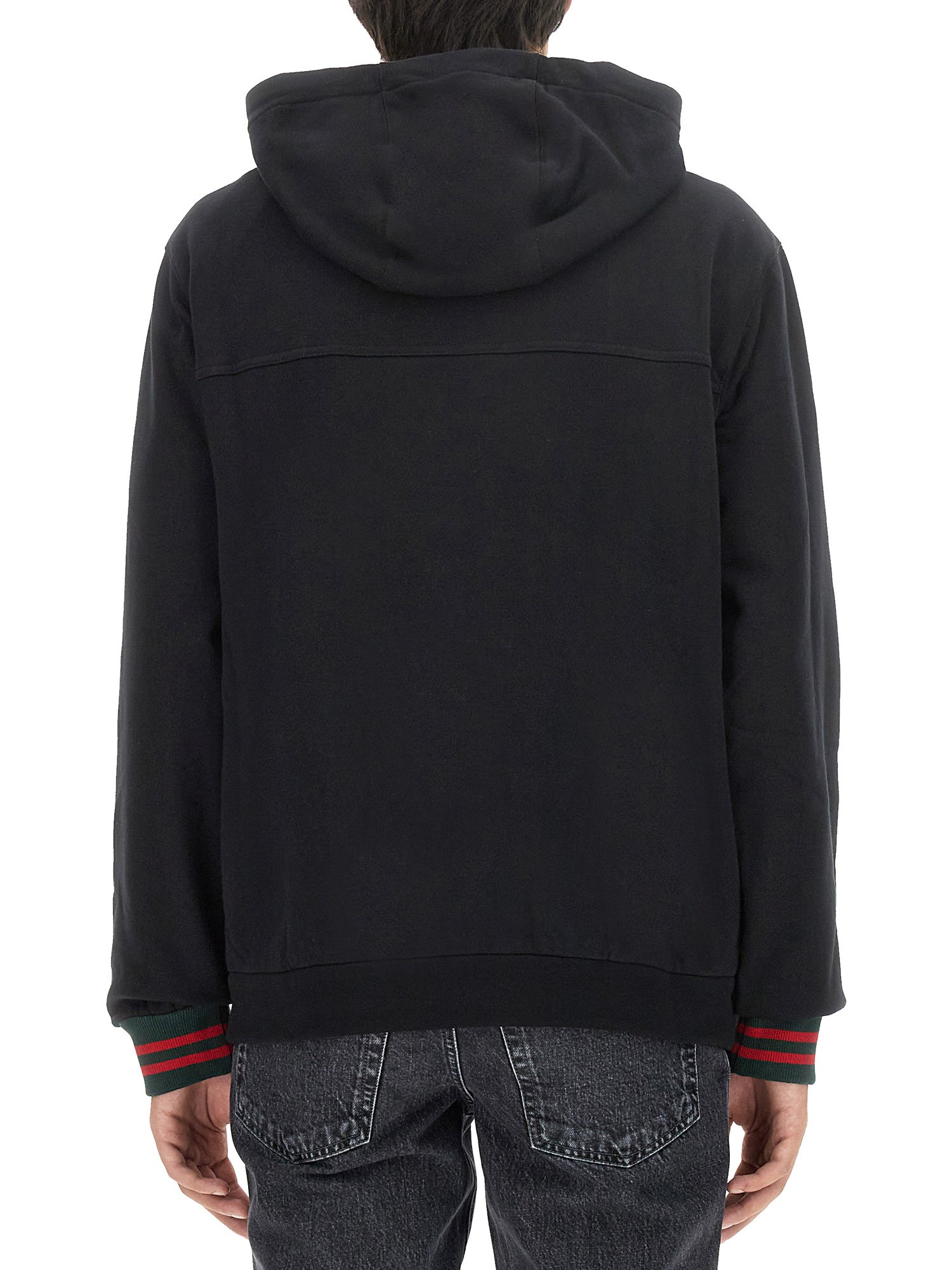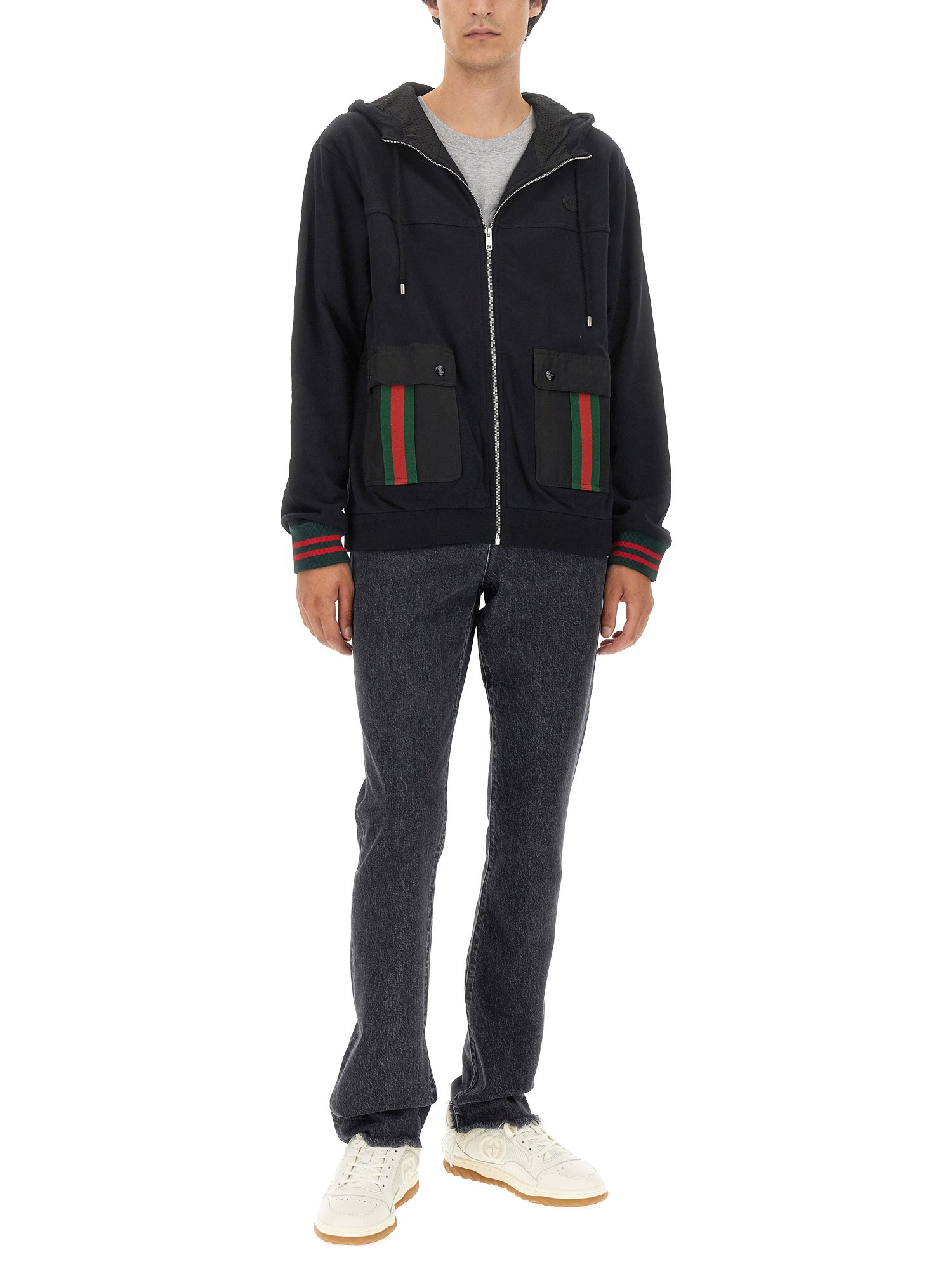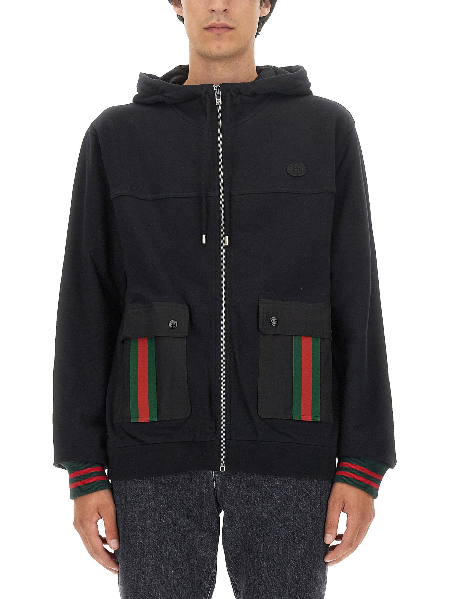 Blending contemporary designs with signature details from the House's heritage, menswear offers versatile and unique pieces ideal for the arrival of a new season. The Pre-Fall collection spotlights this black felted cotton jersey hooded jacket with Interlocking G embroidered patch.