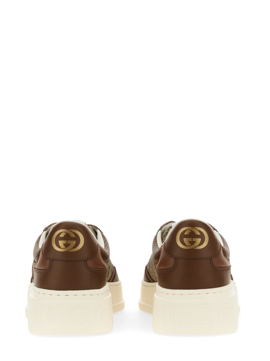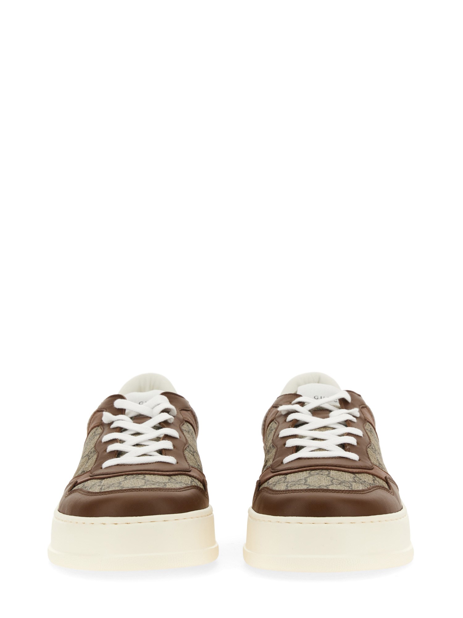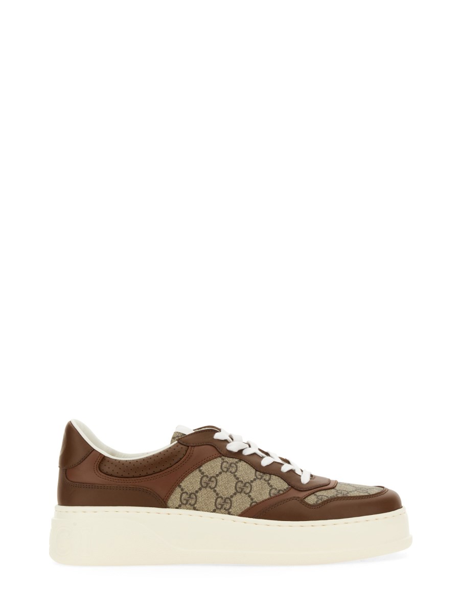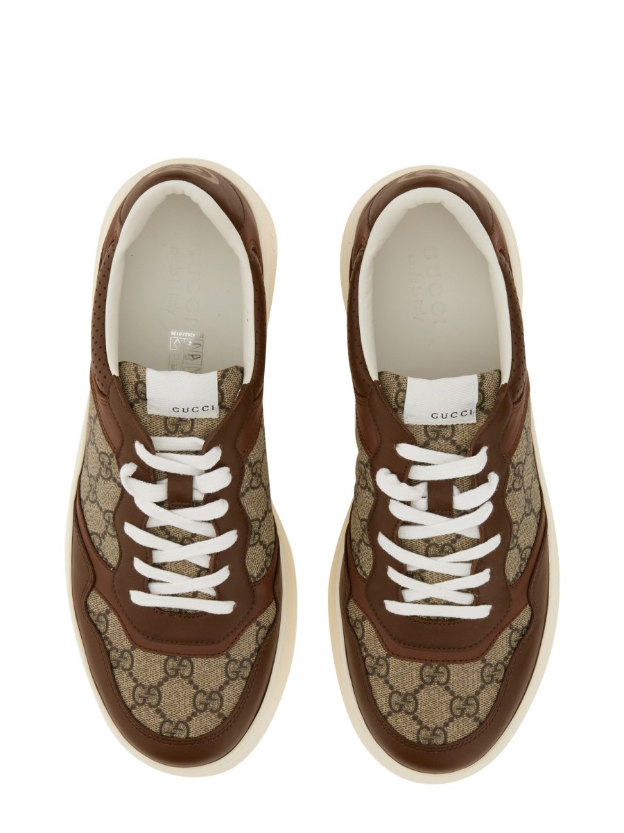 With a chunky silhouette, this trainer plays with shapes, colours and materials to create a retro feel. With a defined rubber sole, the shoe is crafted from beige and ebony GG Supreme canvas with a brown and orange trim.