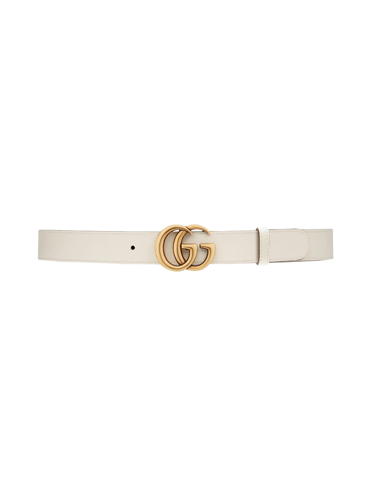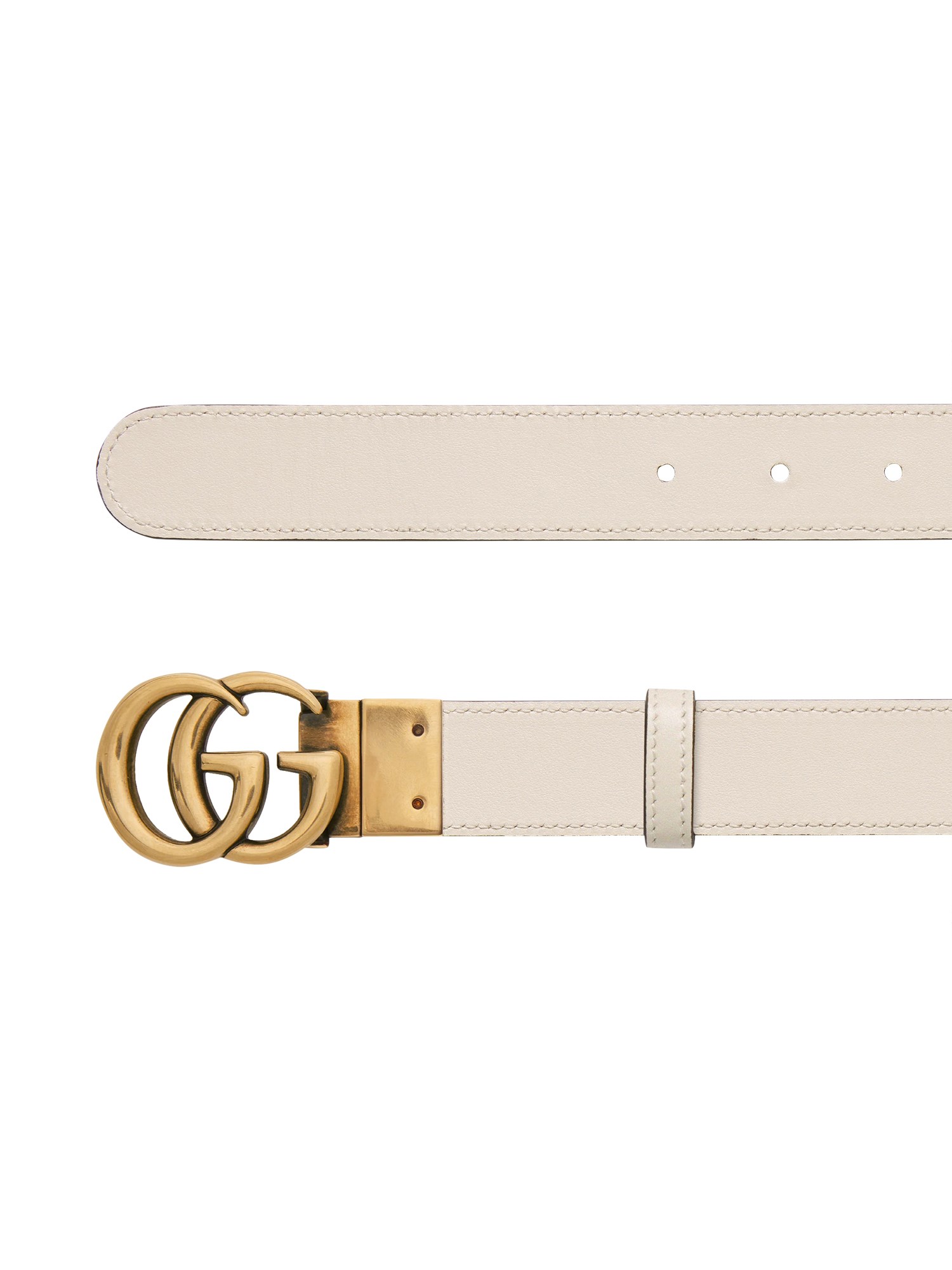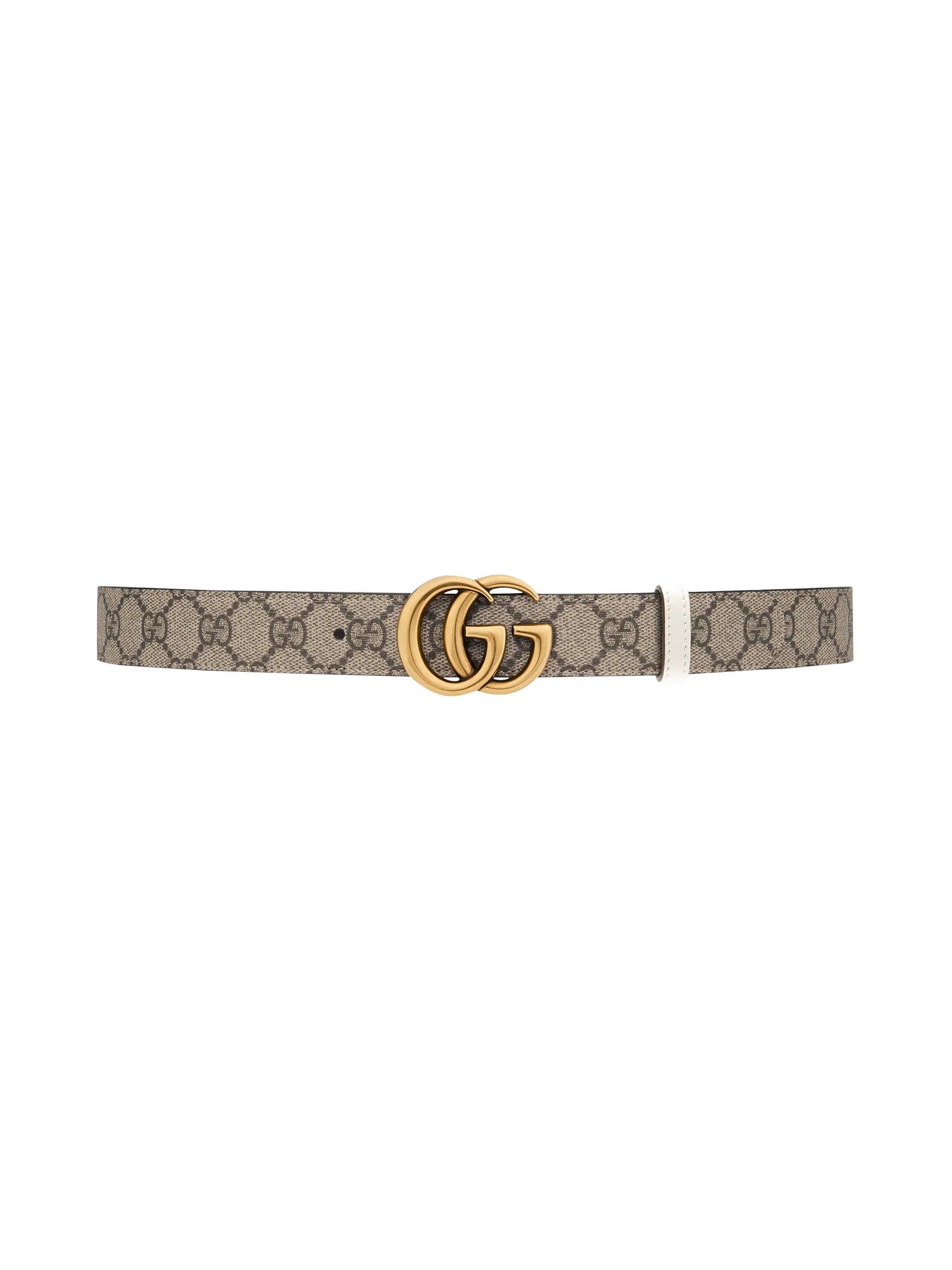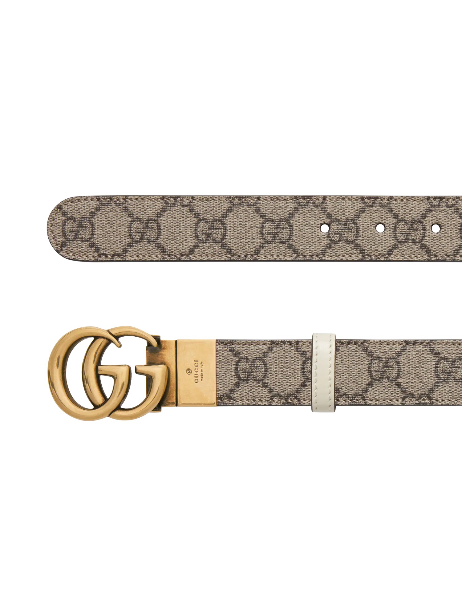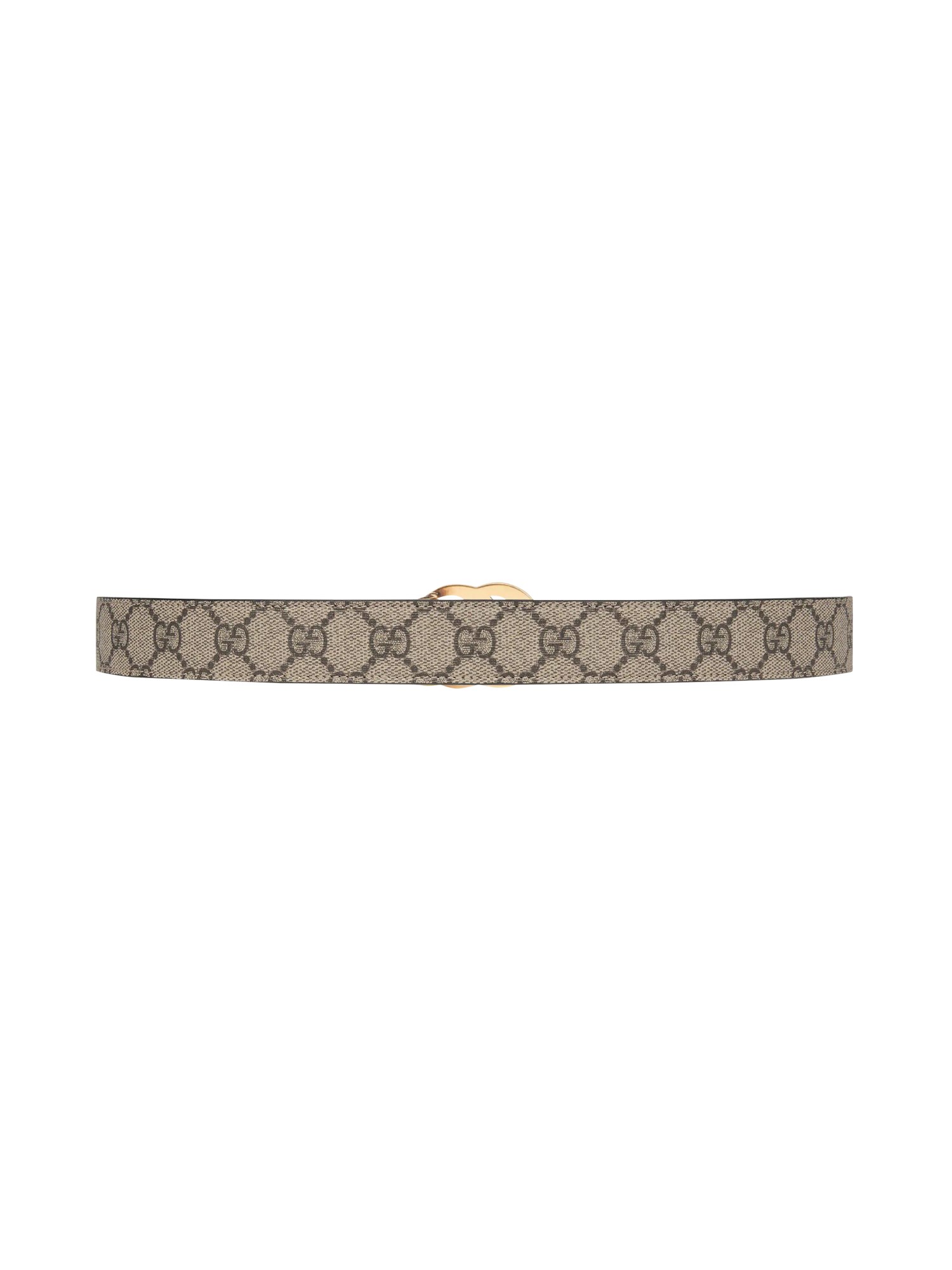 - GG SUPREME BEIGE AND EBONY FABRIC, REDUCED ENVIRONMENTAL IMPACT MATERIAL, WHITE LEATHER REVERSE SIDE- GOLD-COLORED ANTIQUED TRIM- DOUBLE G BUCKLE- WIDTH: 3 CM- 60% POLYURETHANE, 20% COTTON, 20% POLYESTER- MADE IN ITALY