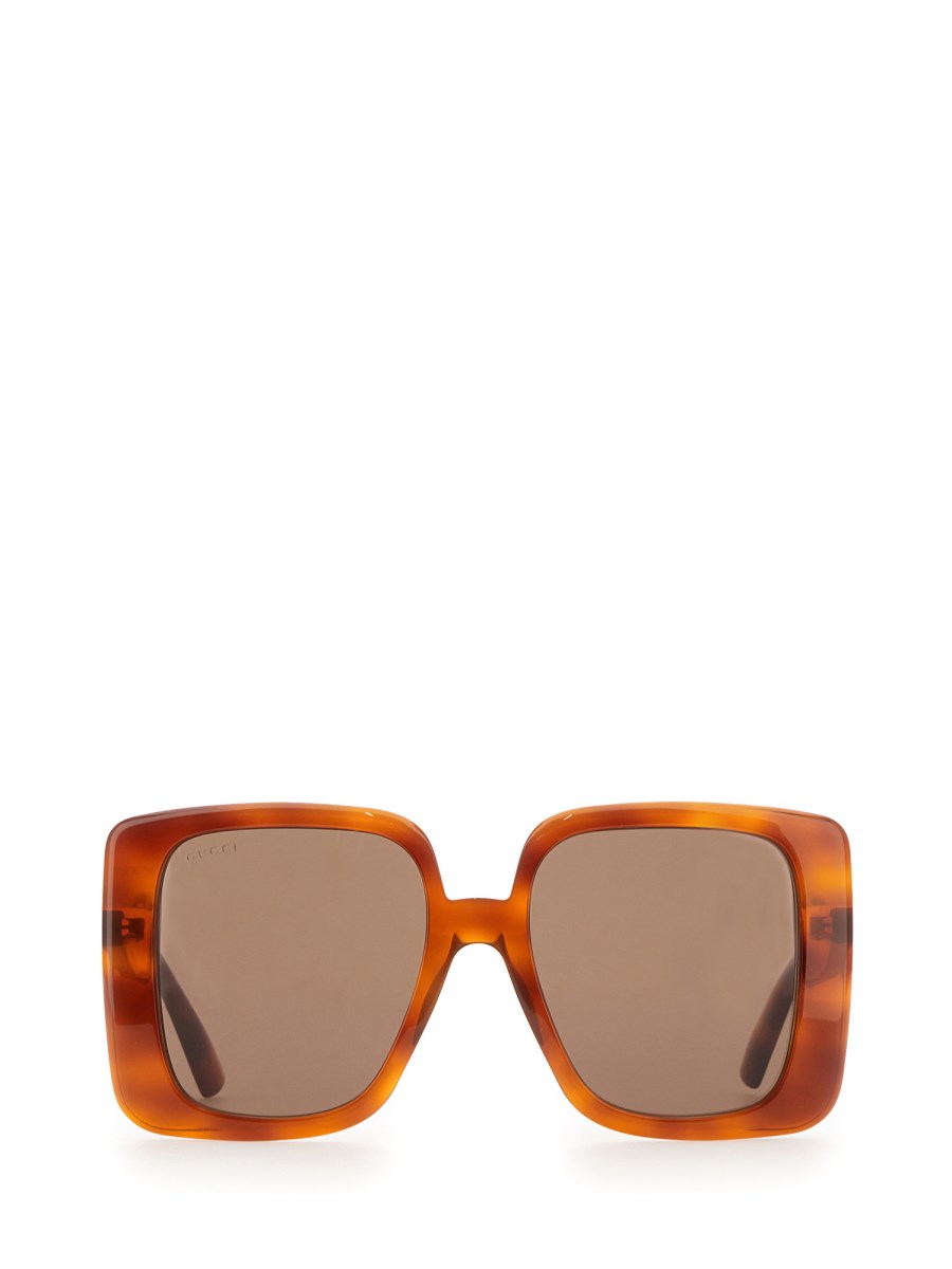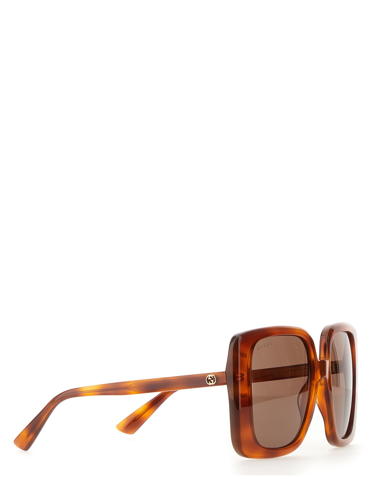 Frames with bold structures define the Cruise 2023 Gucci Cosmogonie collection, accompanying key looks. This oversized frame is crafted from light tortoiseshell acetate and is enriched with a gold-toned Interlocking G detail and understated brown lens.