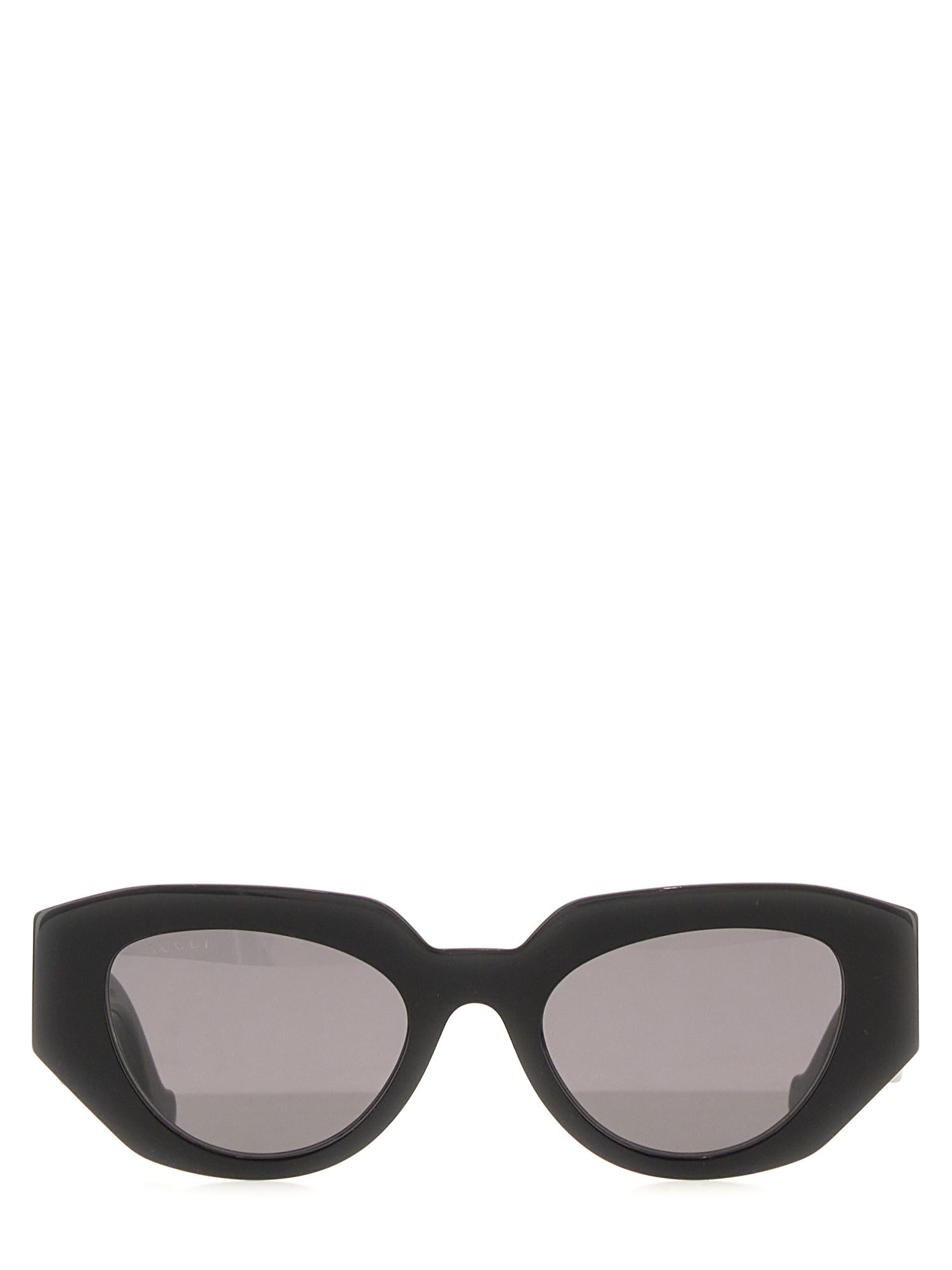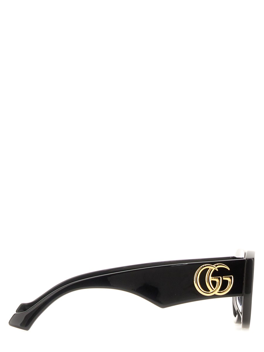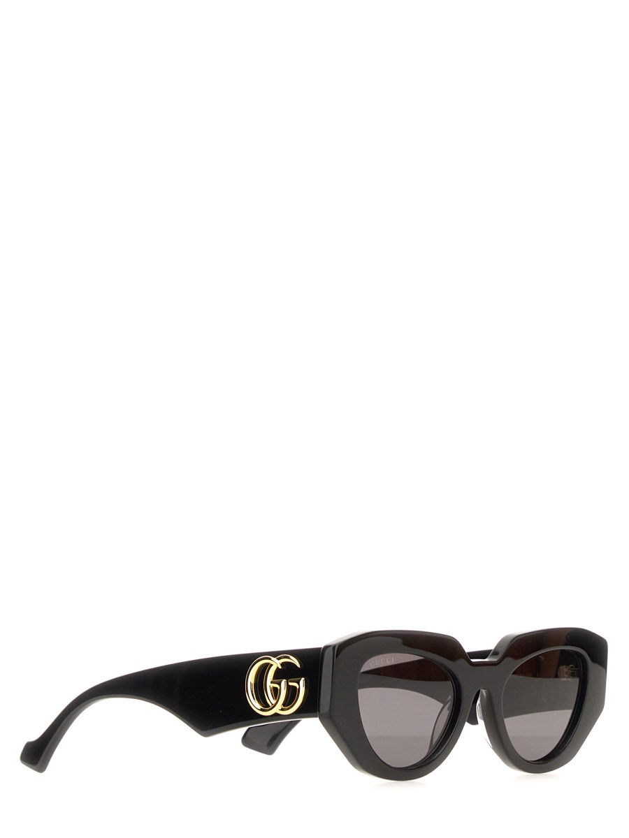 Frames with unique silhouettes and logo details accompanied key looks during the latest collections. This geometric frame is crafted from black acetate with a gold-toned Double G detail along the temples.