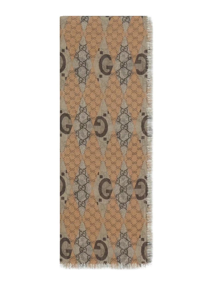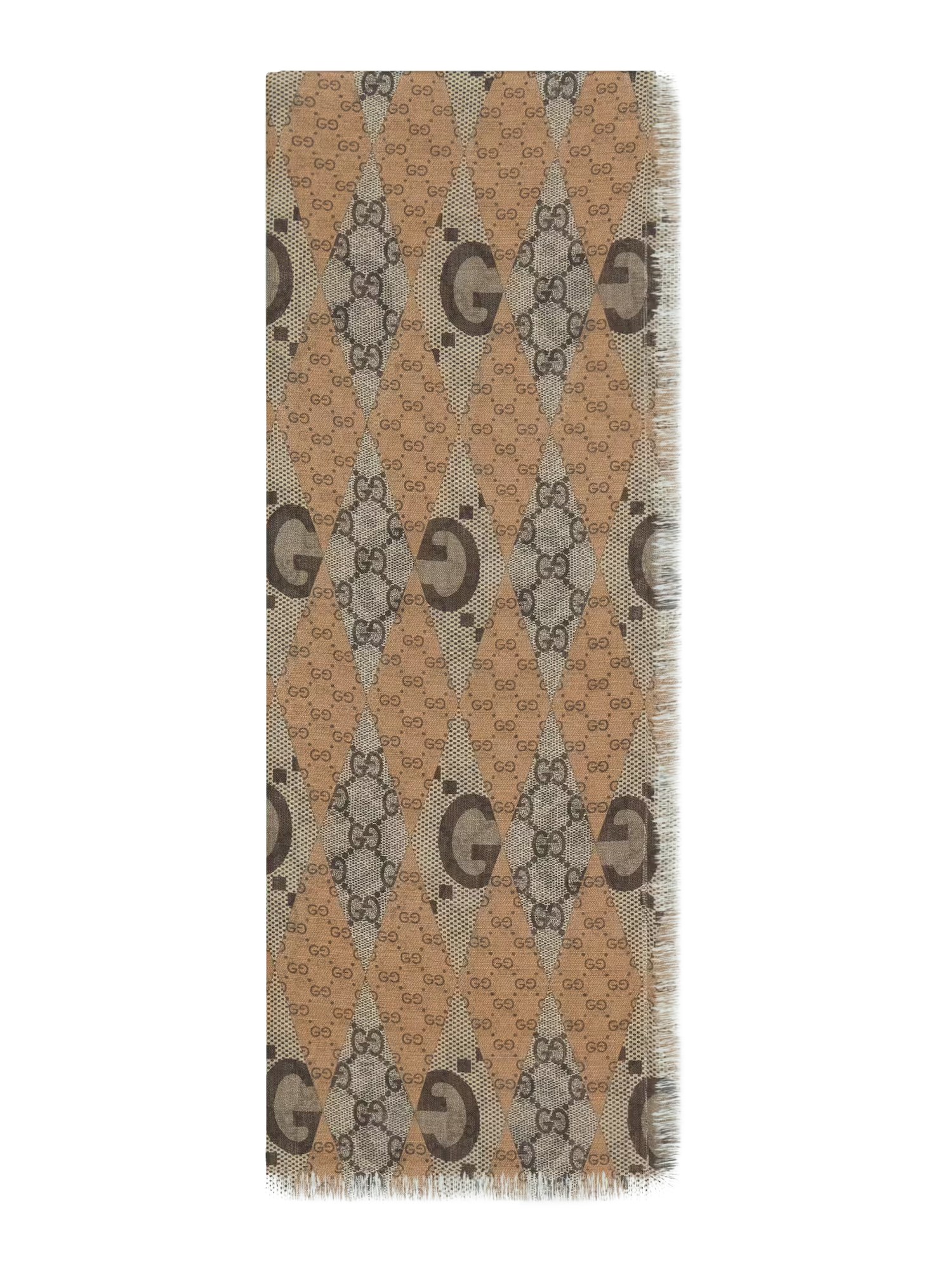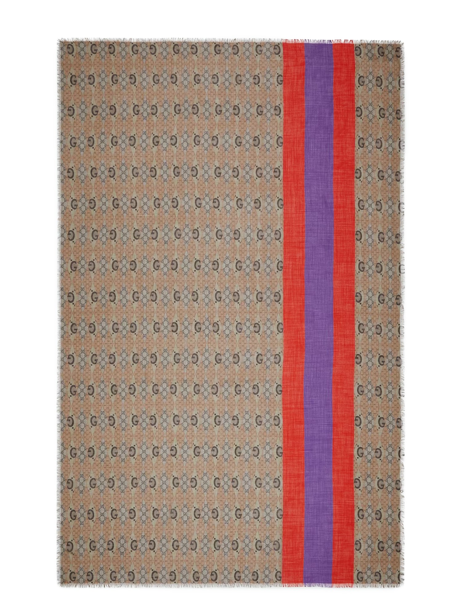 - PATCHWORK PATTERN GG BACKGAMMON PRINT- CONTRASTING STRIPE- FRINGED EDGES- DIMENSIONS: H 140 CM X L 220 CM- 100% WOOL- MADE IN ITALY