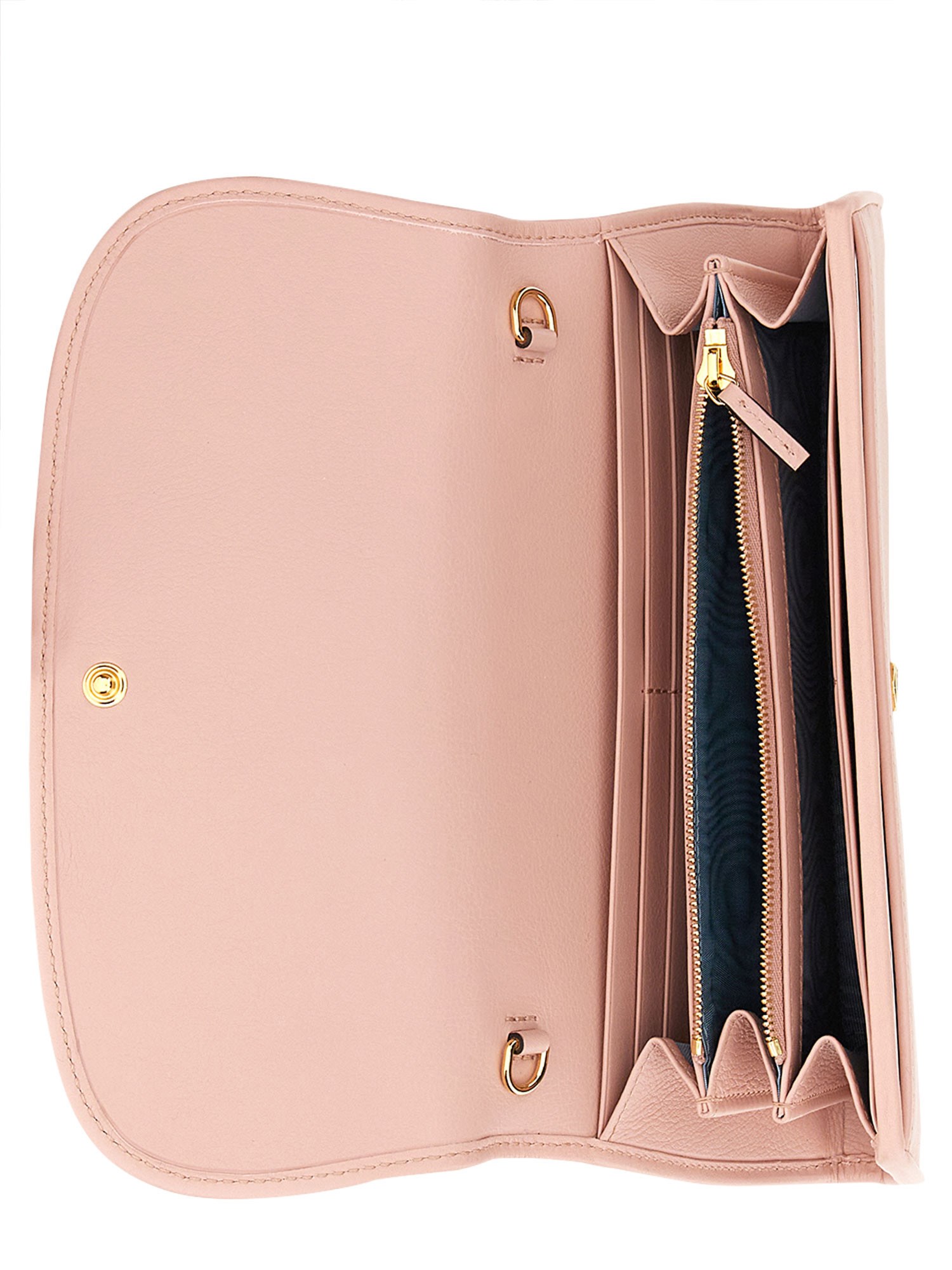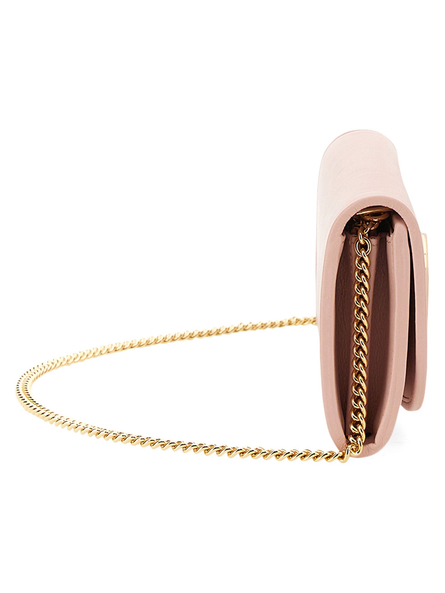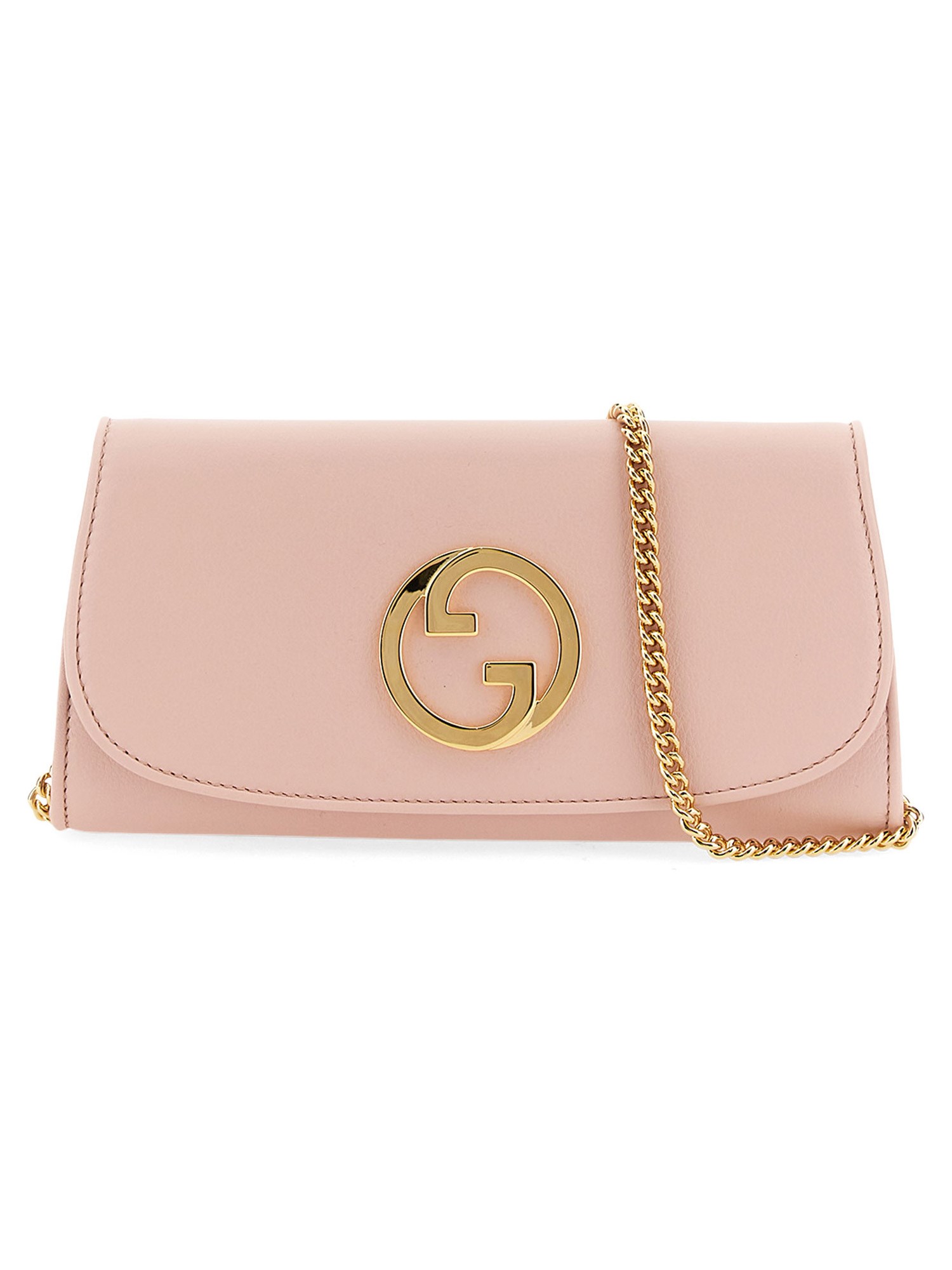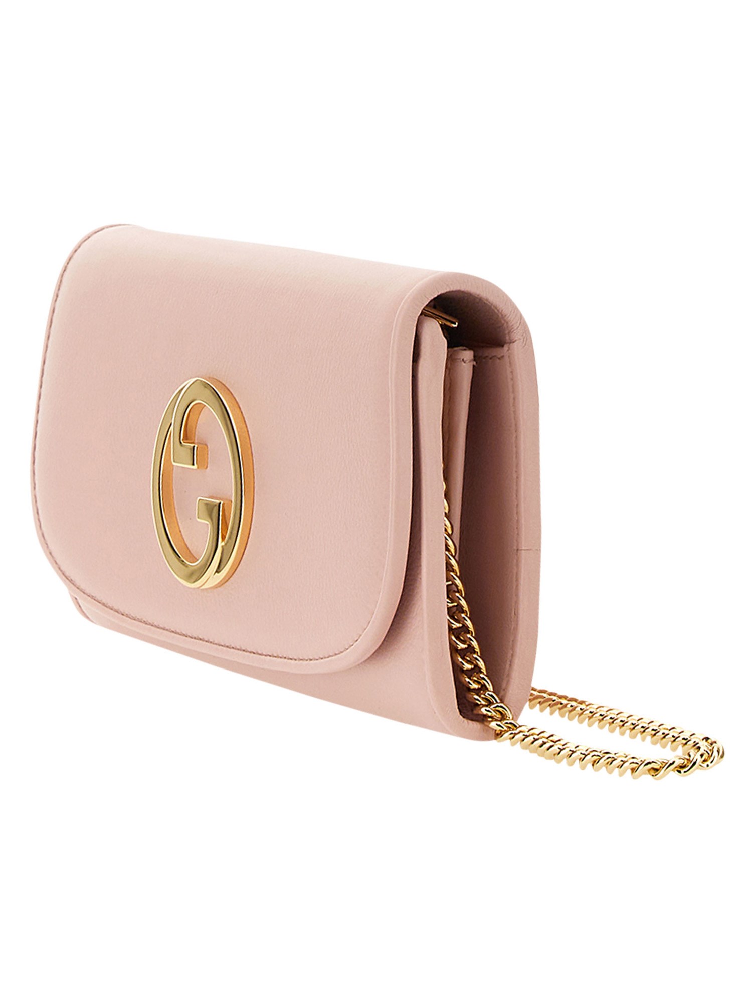 This Gucci Blondie continental chain wallet appears in pink leather with a moiré lining. The inside holds twelve card slots and two bill compartments, as well as a coin pocket. The round Interlocking G defines the front of the design, a geometric variation of the Gucci logo taken from the House archives.