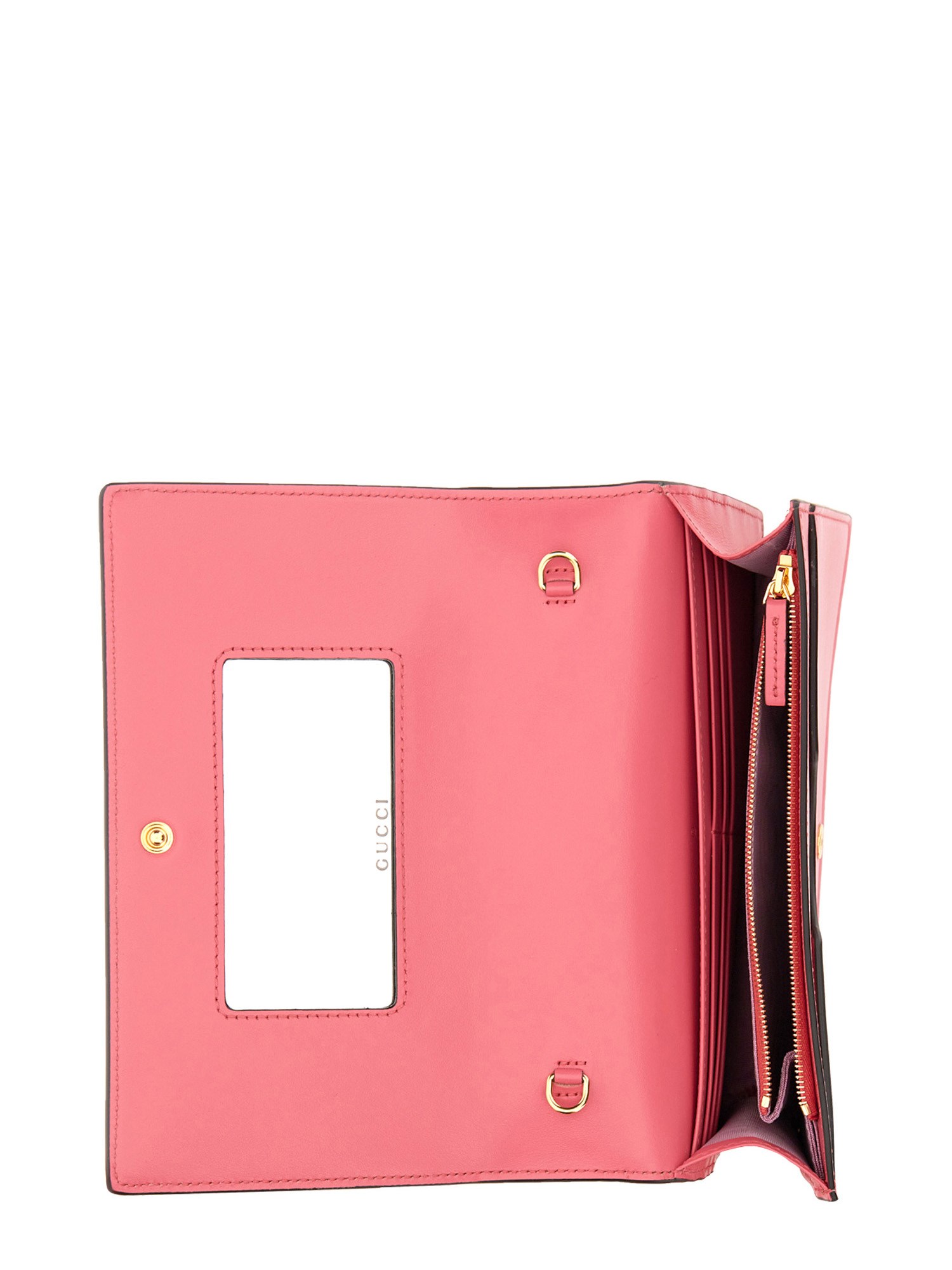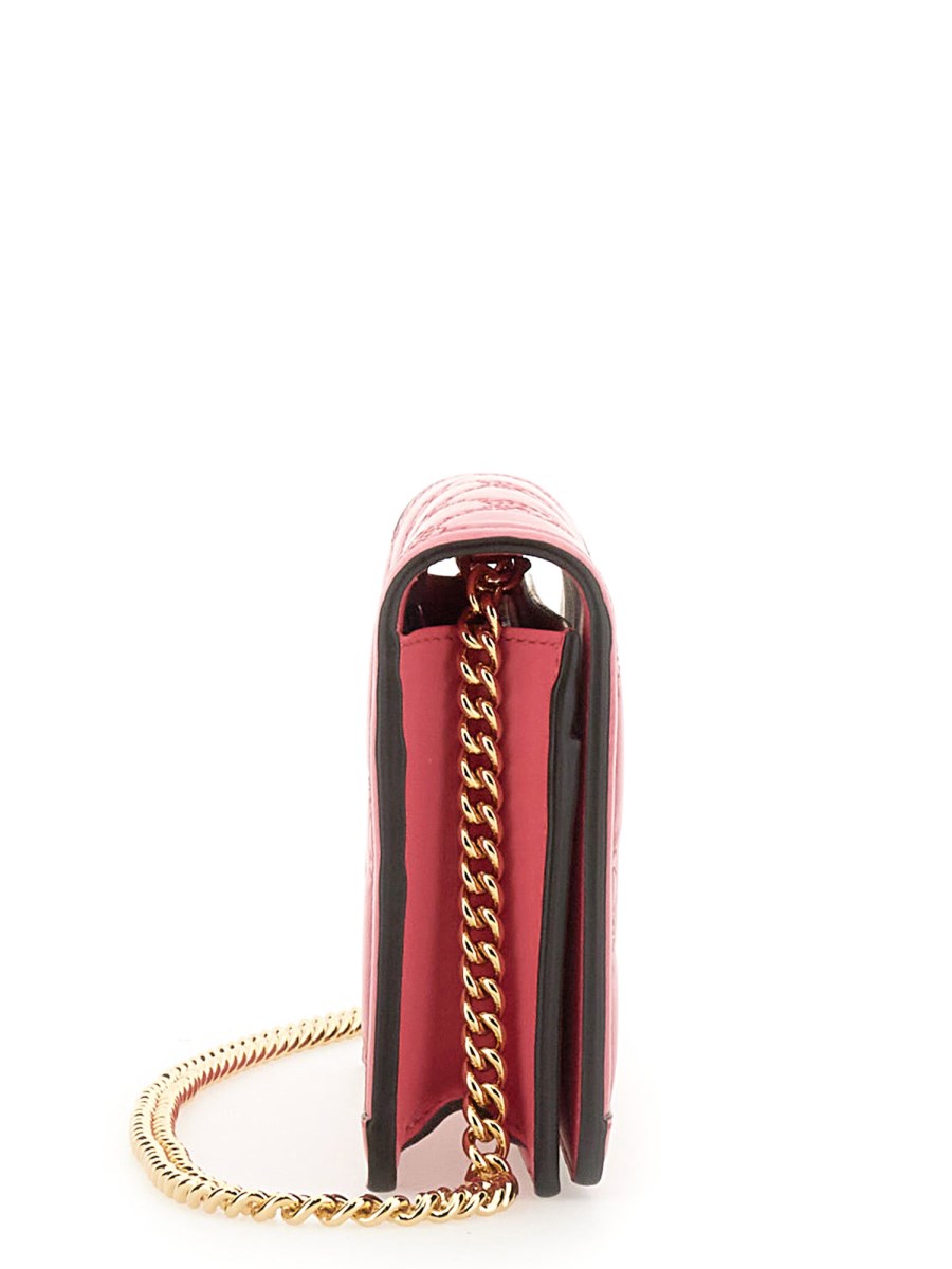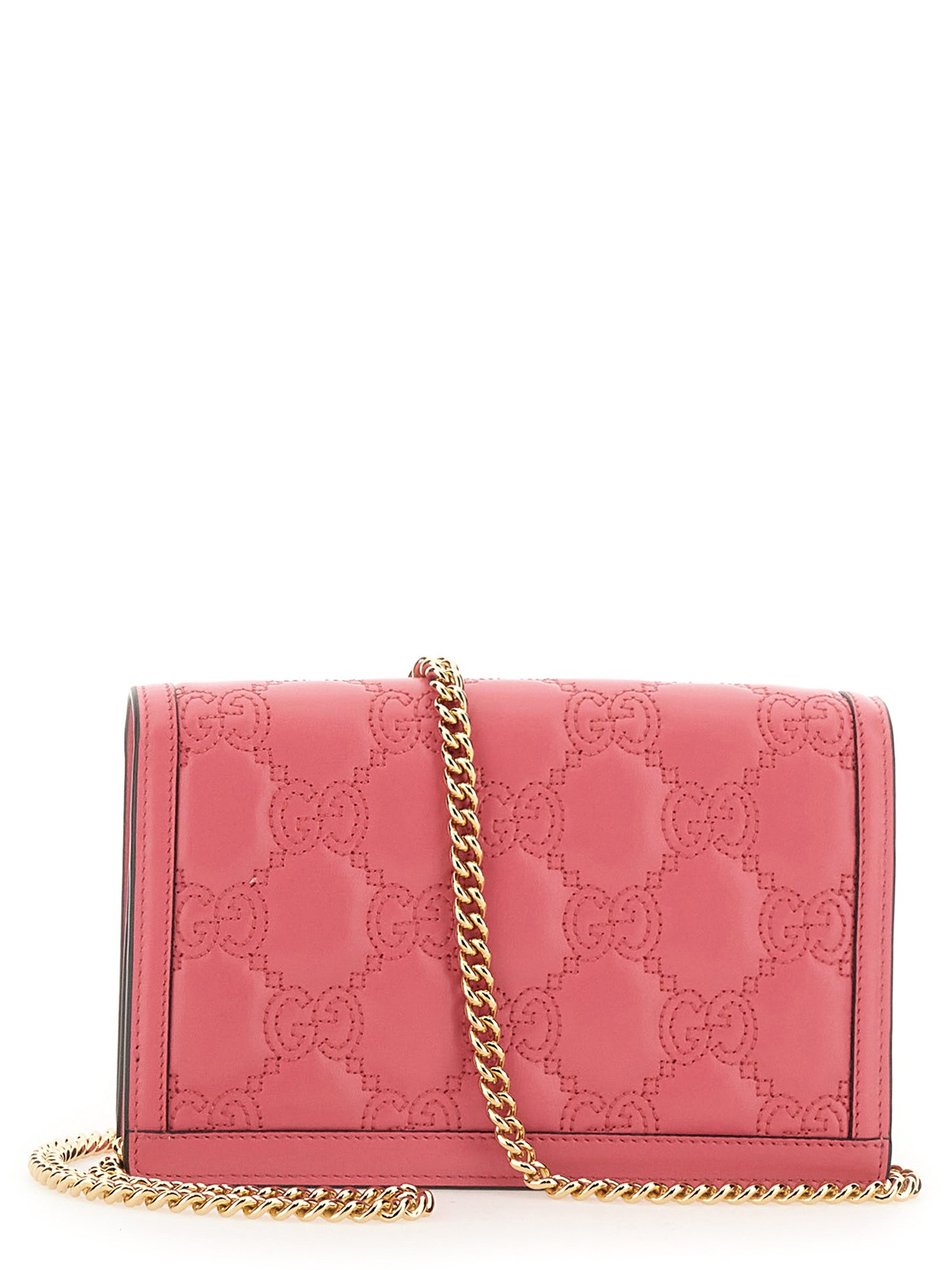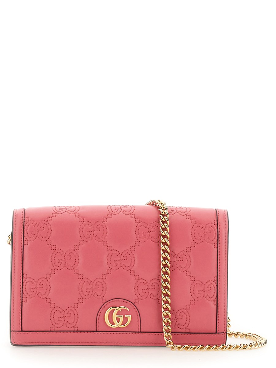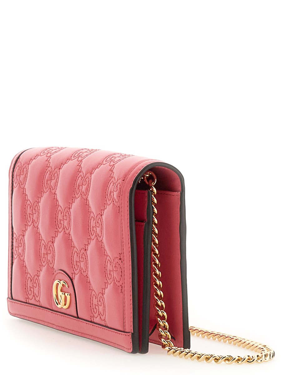 Matelassé leather is a signature material of the House, thanks to its super soft finish. The textured geometric motif defines a selection of small leather accessories, including this chain wallet in pink. The Double G hardware decorat