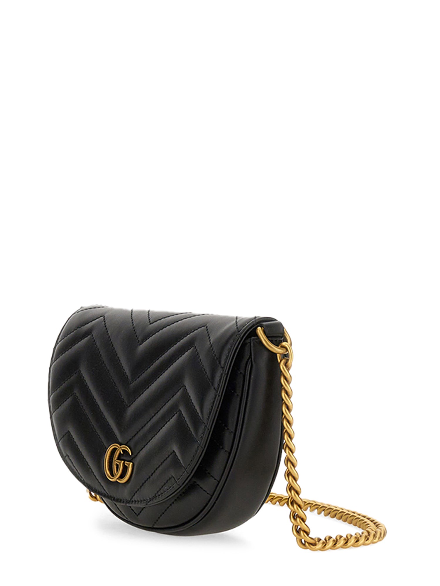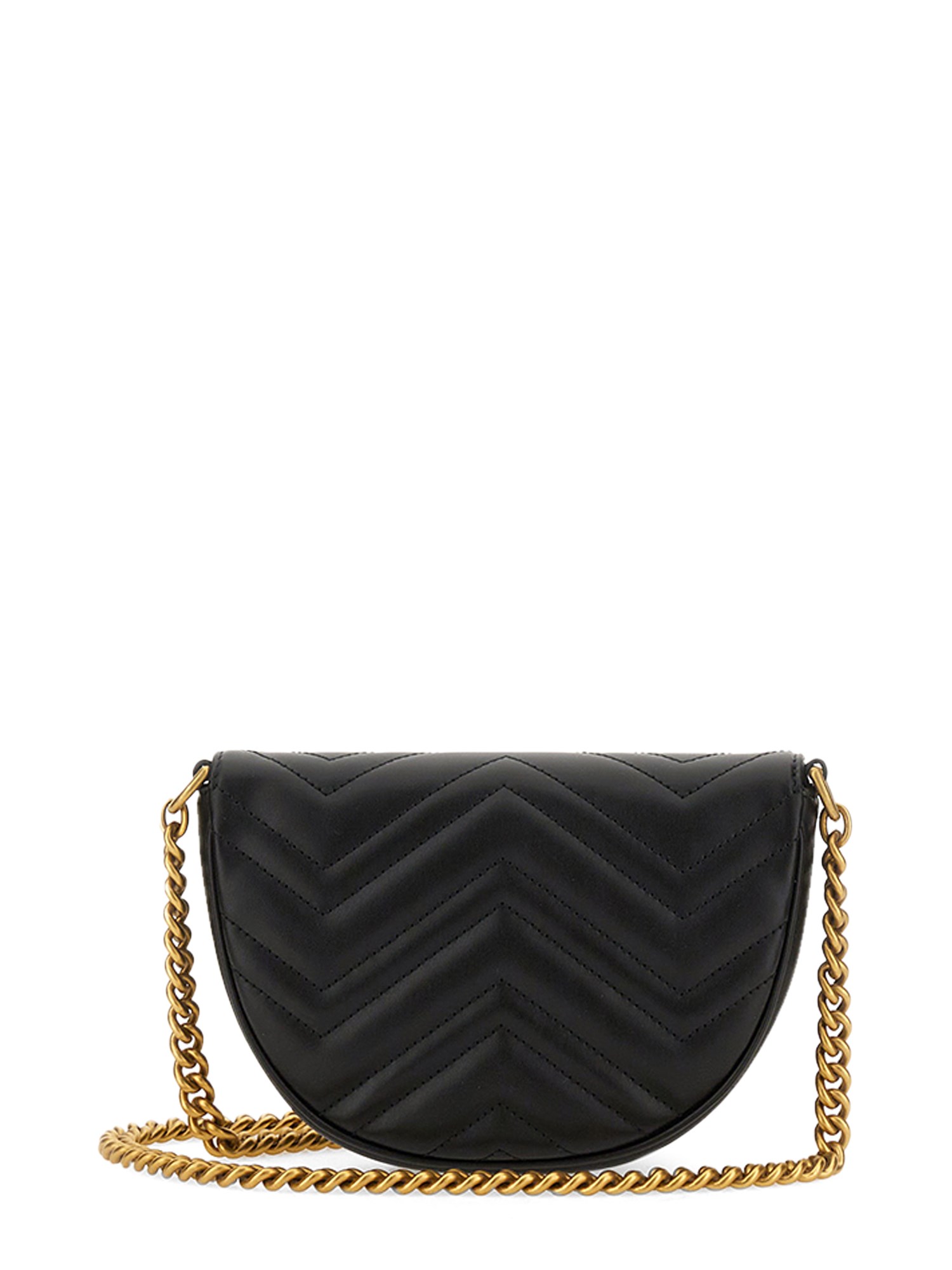 The Double G hardware brings the past into the House's present with the notion that a cherished wardrobe is enriched by items that can be worn season after season. This chain mini bag is crafted from the signature black matelassé chevron leather, while the inside features two card slots.