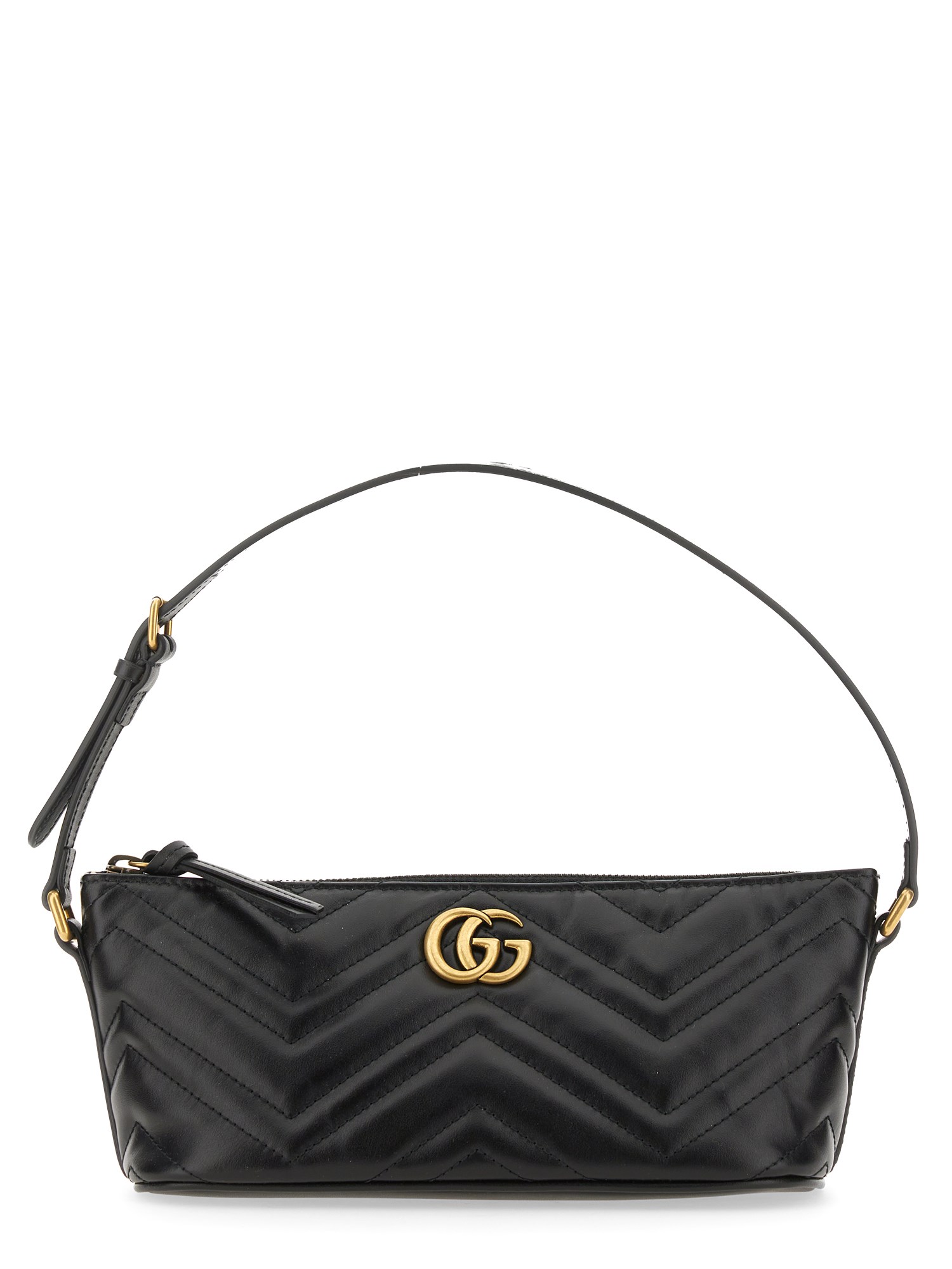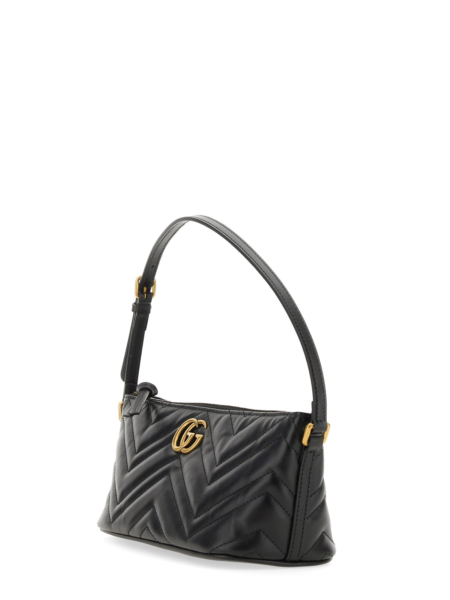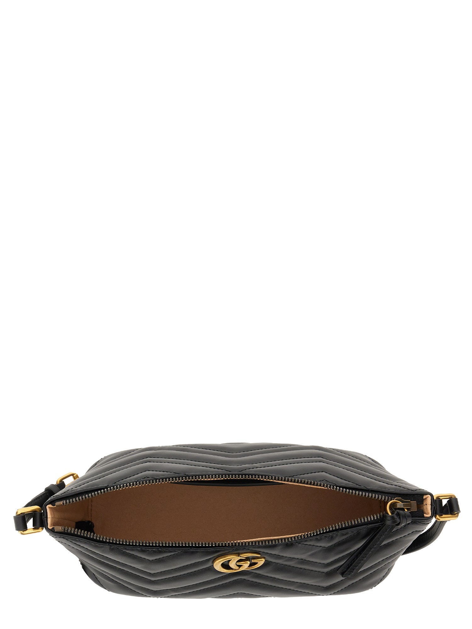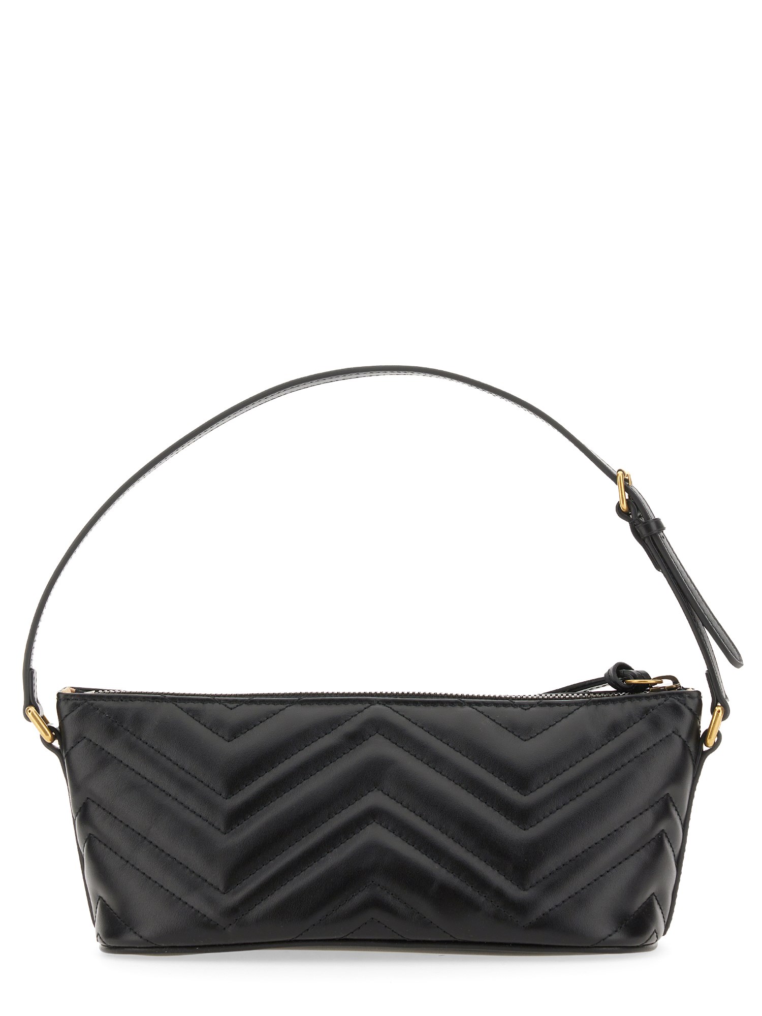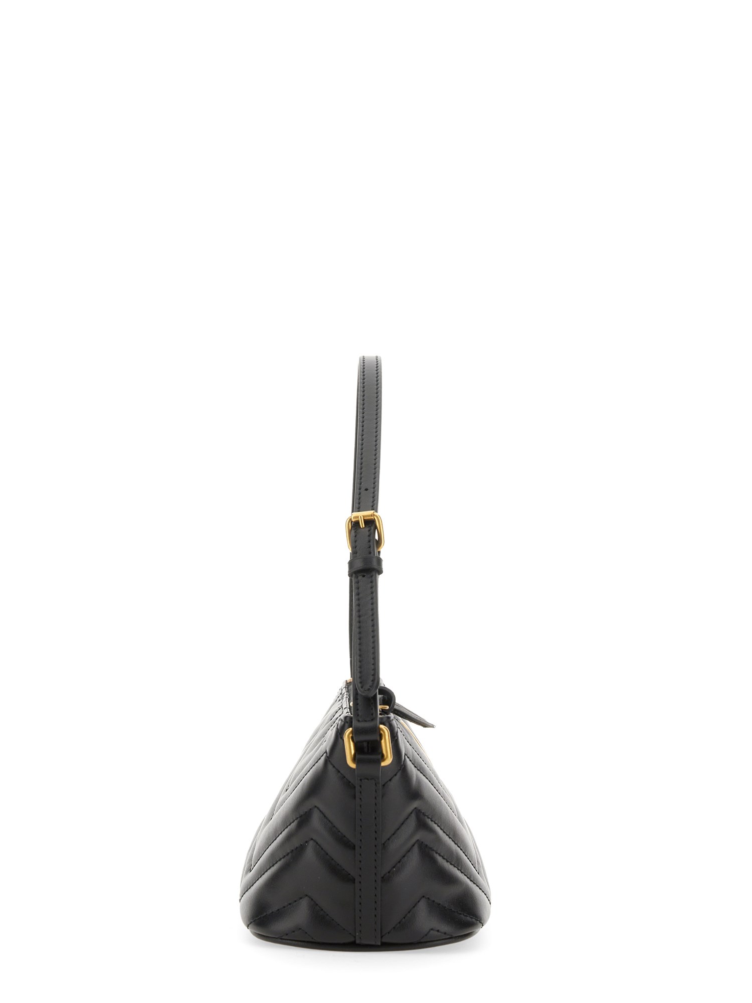With its recognisable matelassé fabric and Double G hardware, the GG Marmont has become synonymous with the House. Continuously reinvented through the seasons, new shapes are introduced within this signature line, matching Gucci's contemporary vision. Presented here in black leather, it's further enriched with antique gold-toned details.